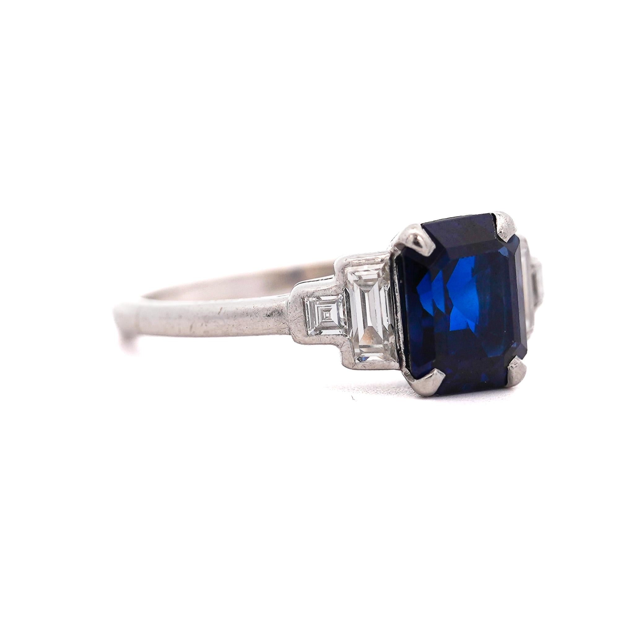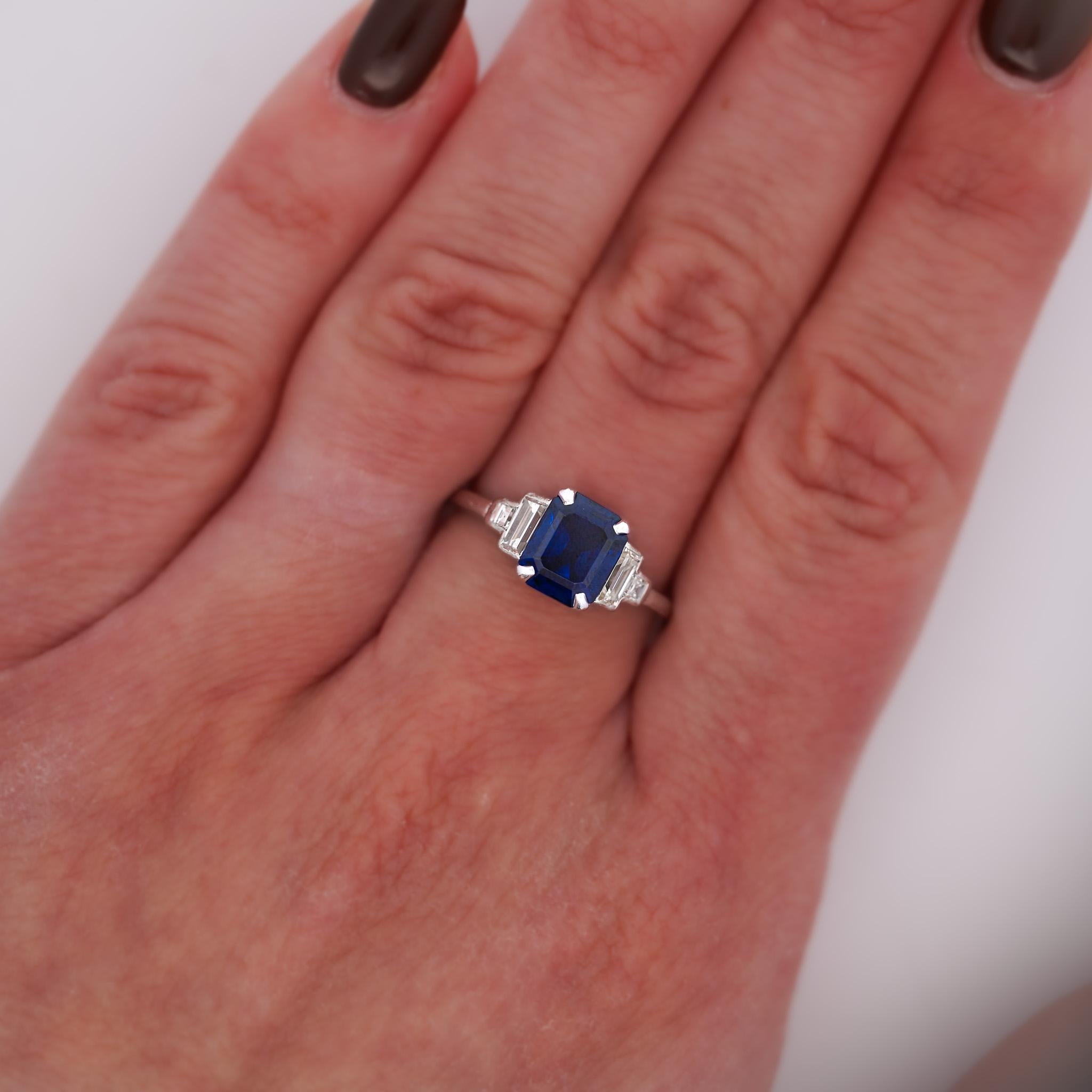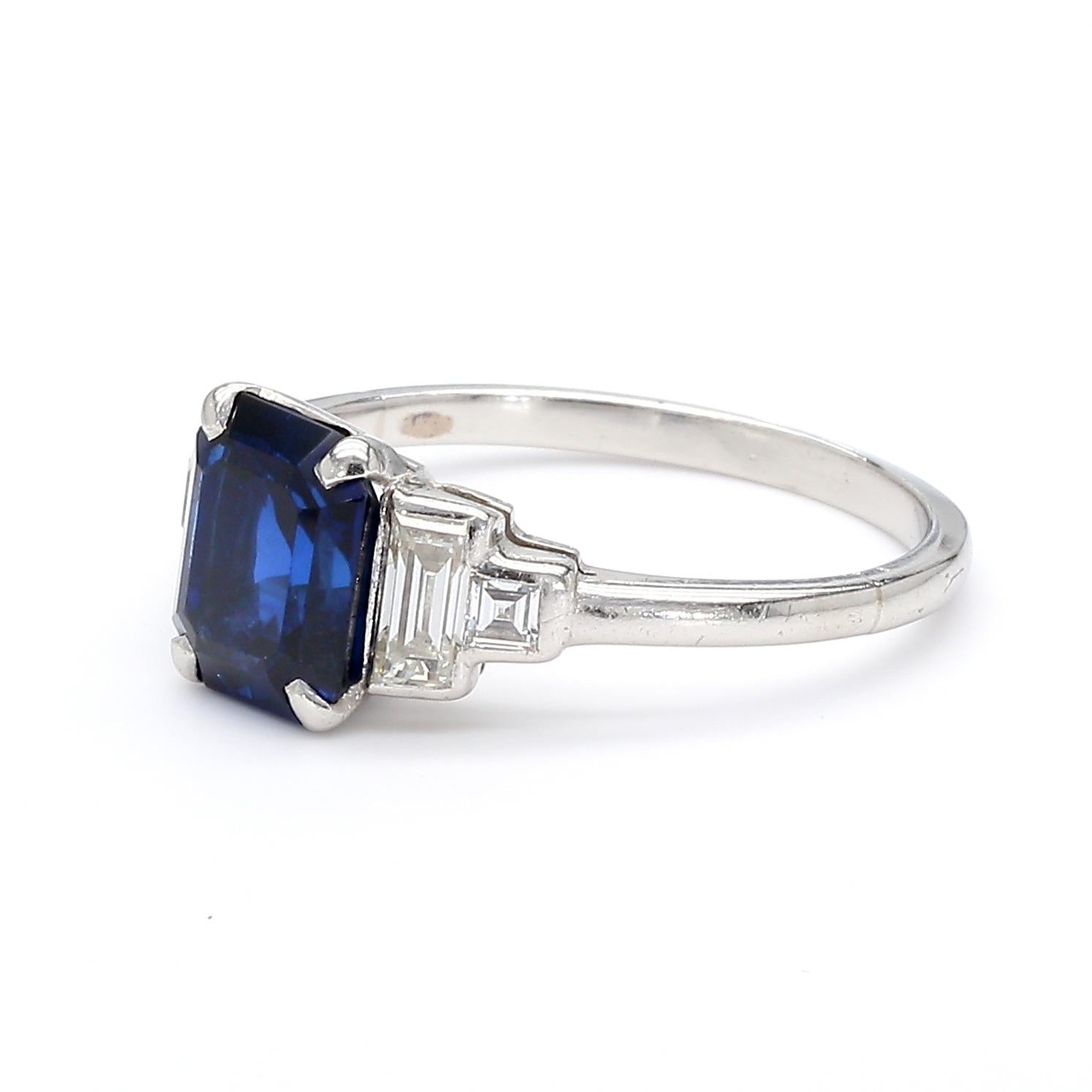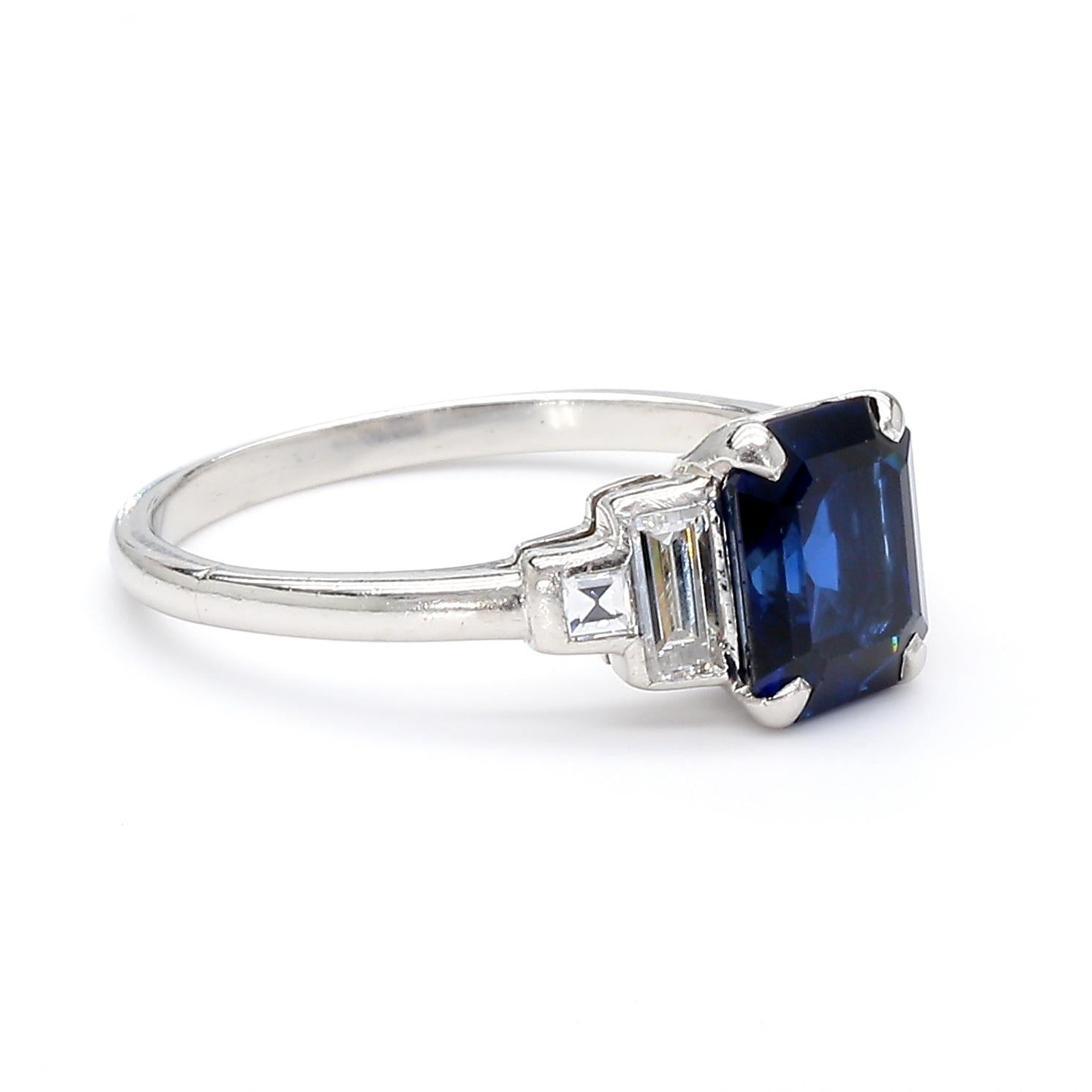Cartier Paris Art Deco platinum ring set with a GIA certified no heat Royal Blue sapphire, approximately 2.30 carats by formula, in an emerald octagonal step cut. The center sapphire is flanked by baguette and asscher cut diamonds totaling approximately 0.80 carats in a three-stone Art Deco design. Signed Cartier Paris, circa 1920s–1930s. Total weight 4.04 grams.