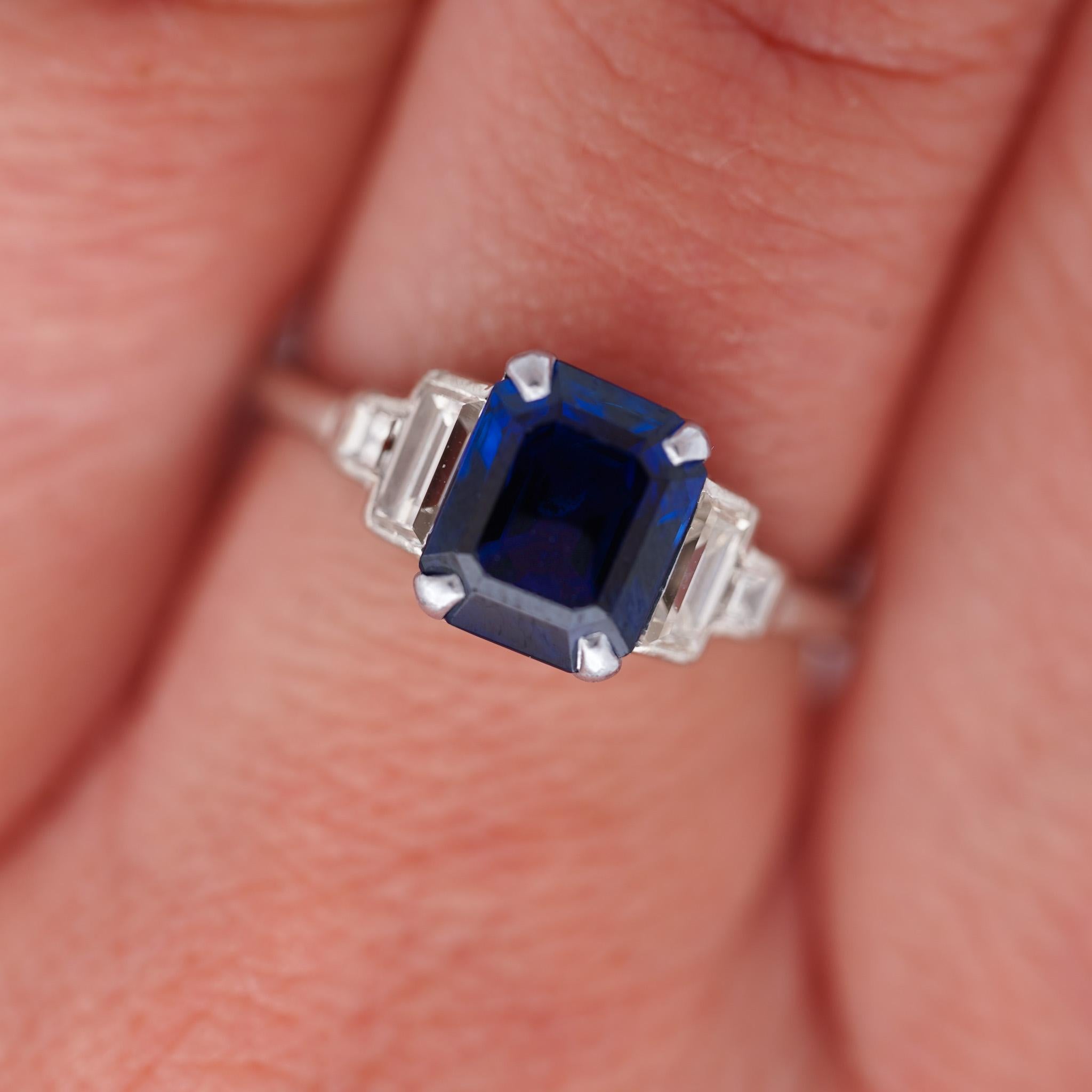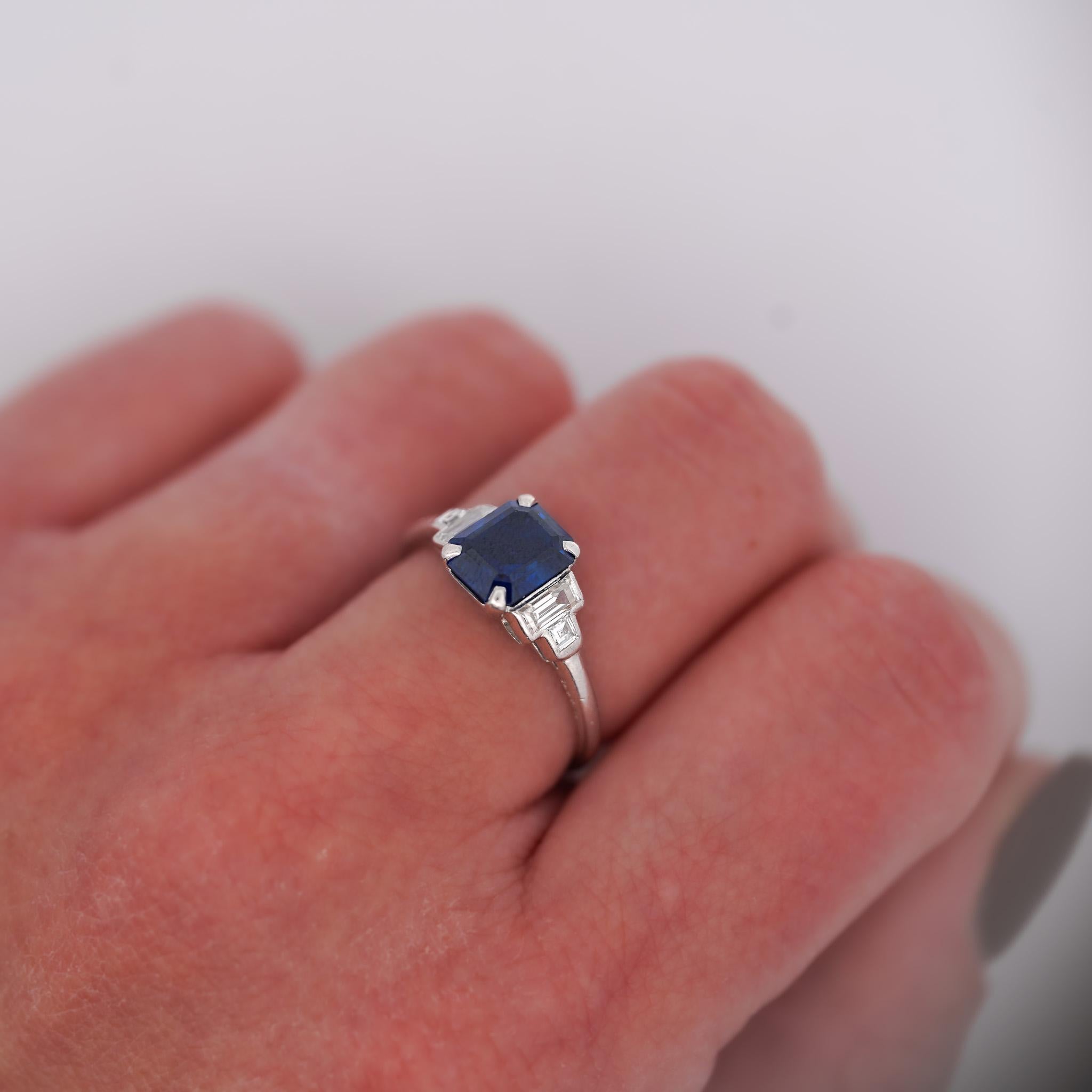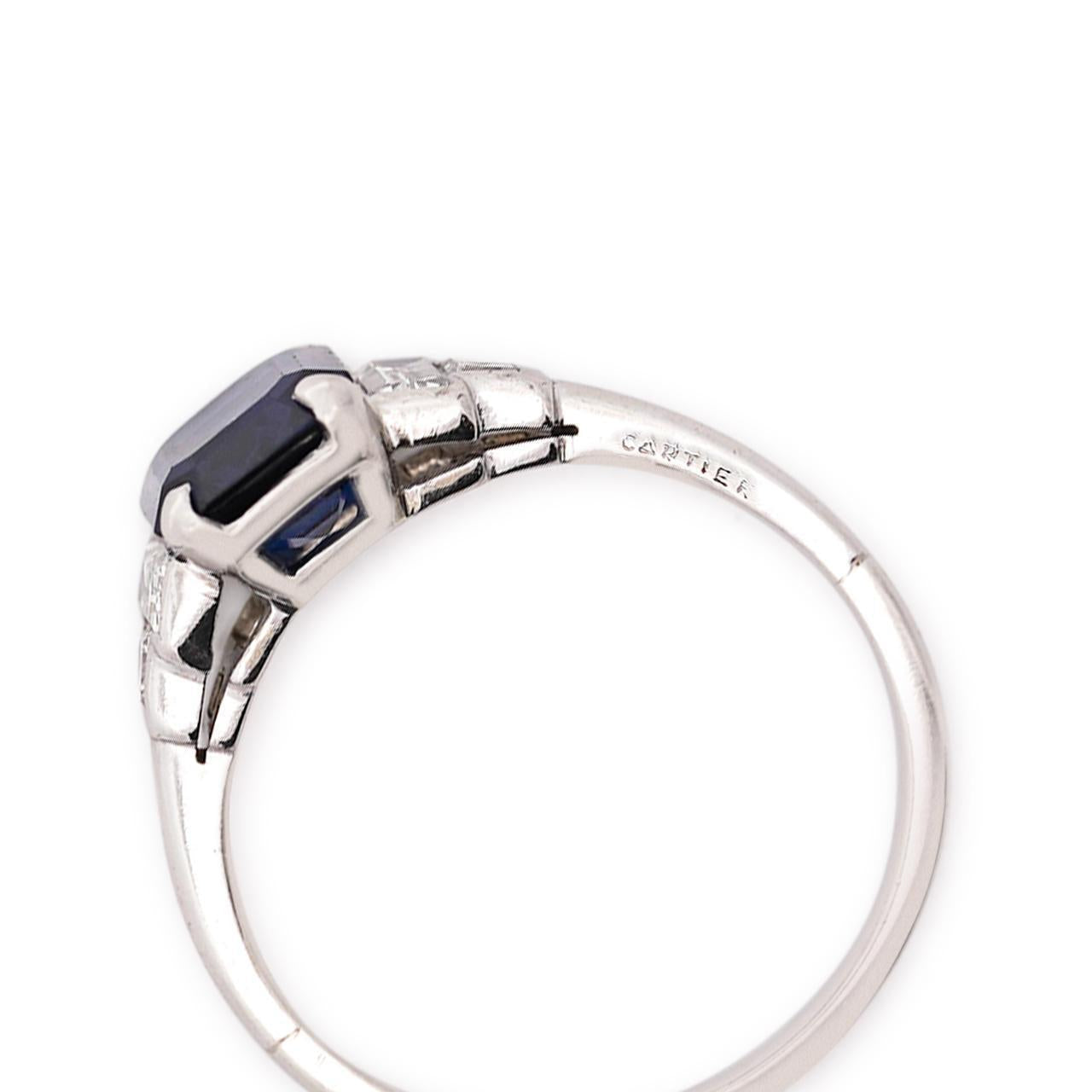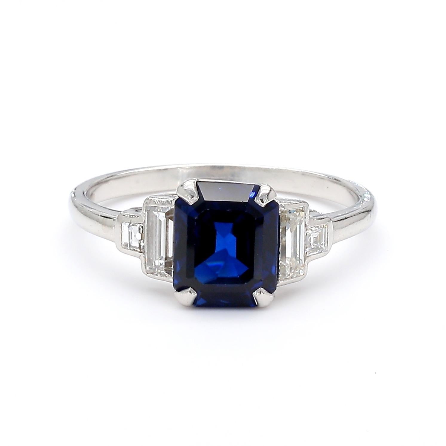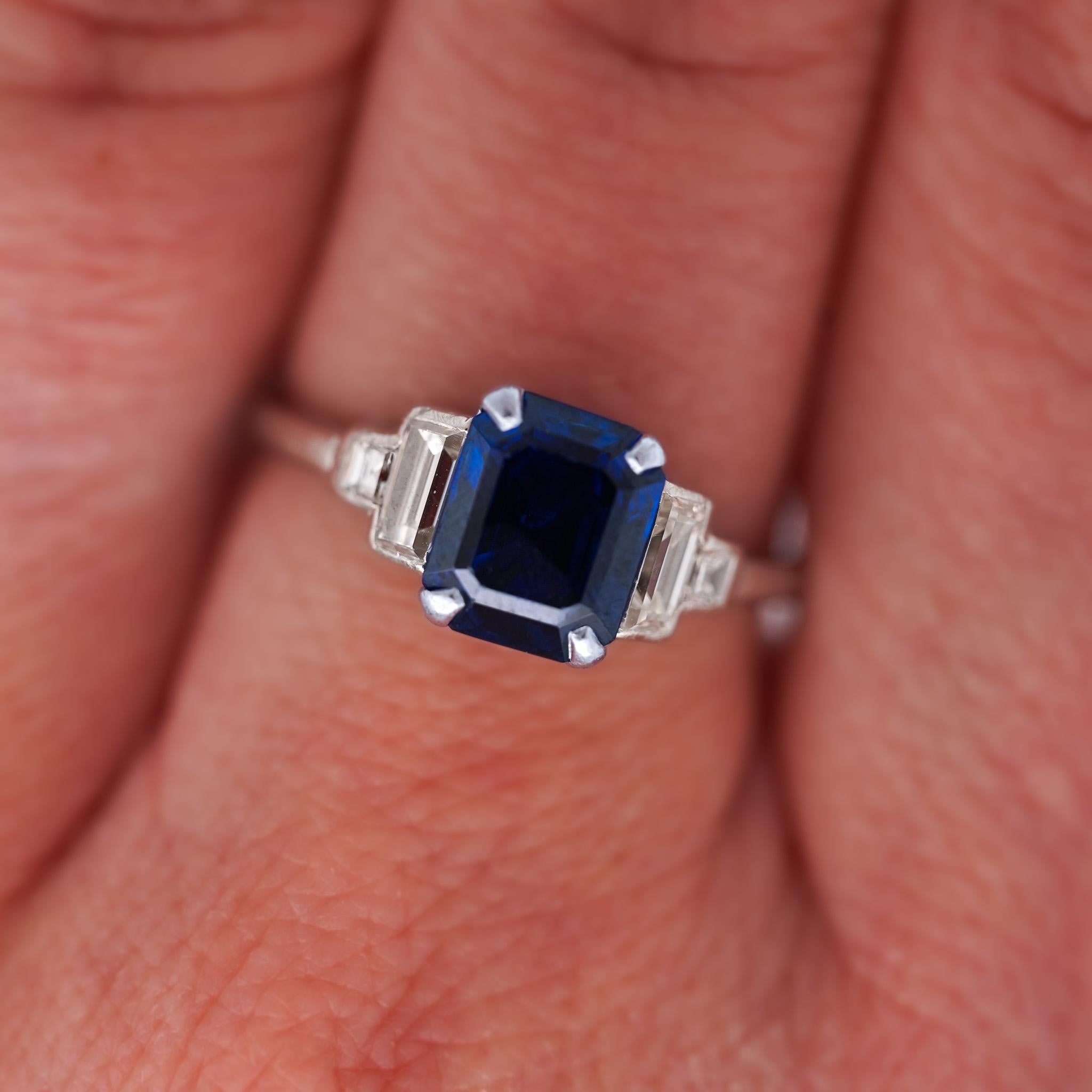 Cartier Paris Art Deco platinum ring set with a GIA certified no heat Royal Blue sapphire, approximately 2.30 carats by formula, in an emerald octagonal step cut. The center sapphire is flanked by baguette and asscher cut diamonds totaling approximately 0.80 carats in a three-stone Art Deco design. Signed Cartier Paris, circa 1920s–1930s. Total weight 4.04 grams.