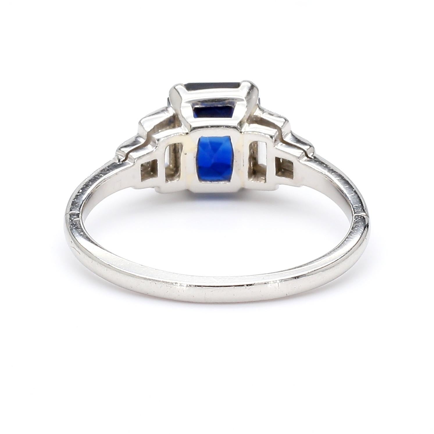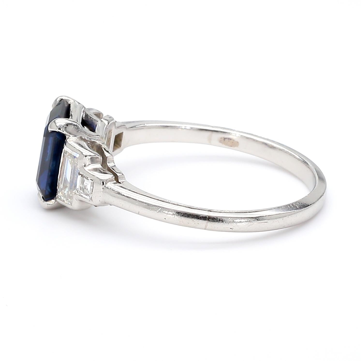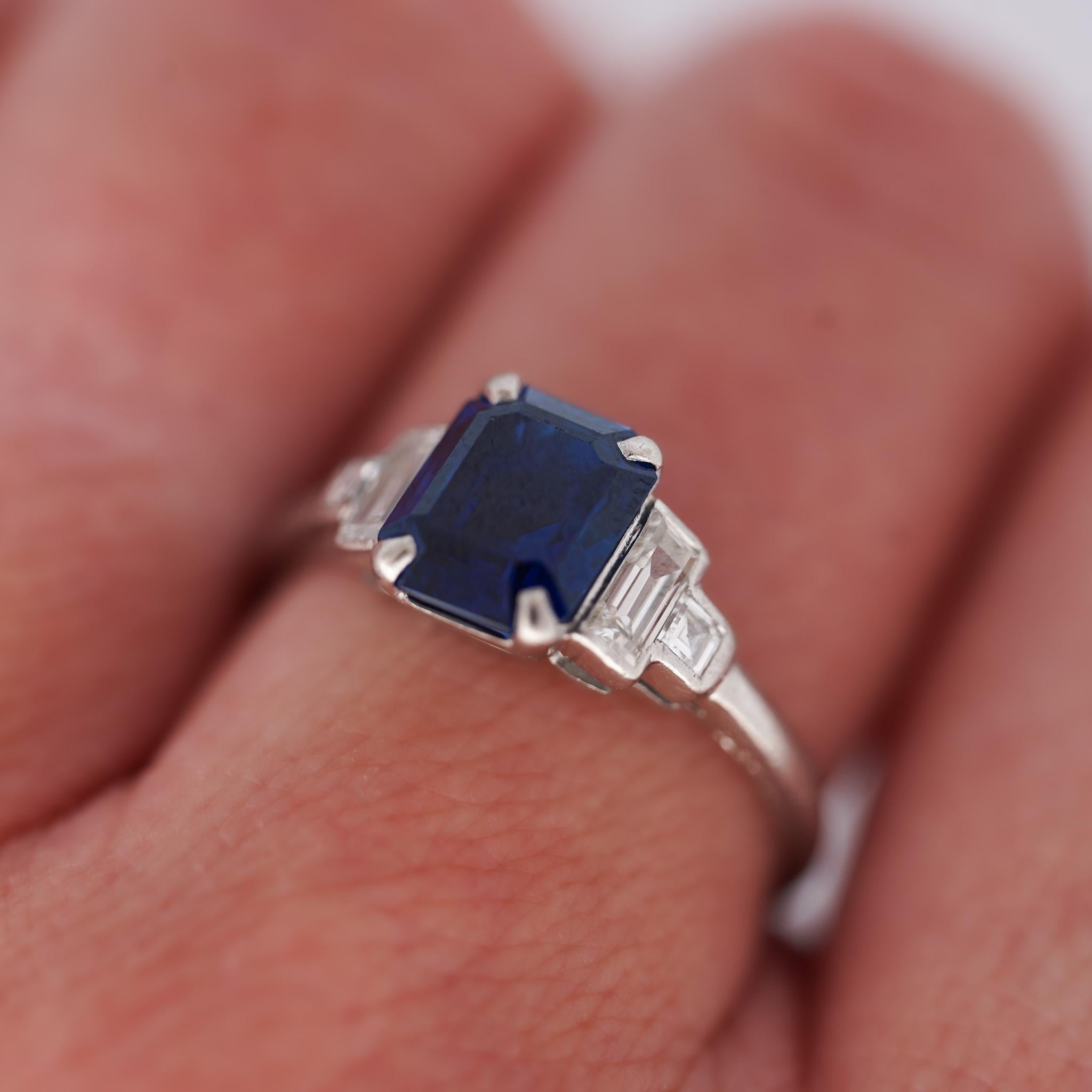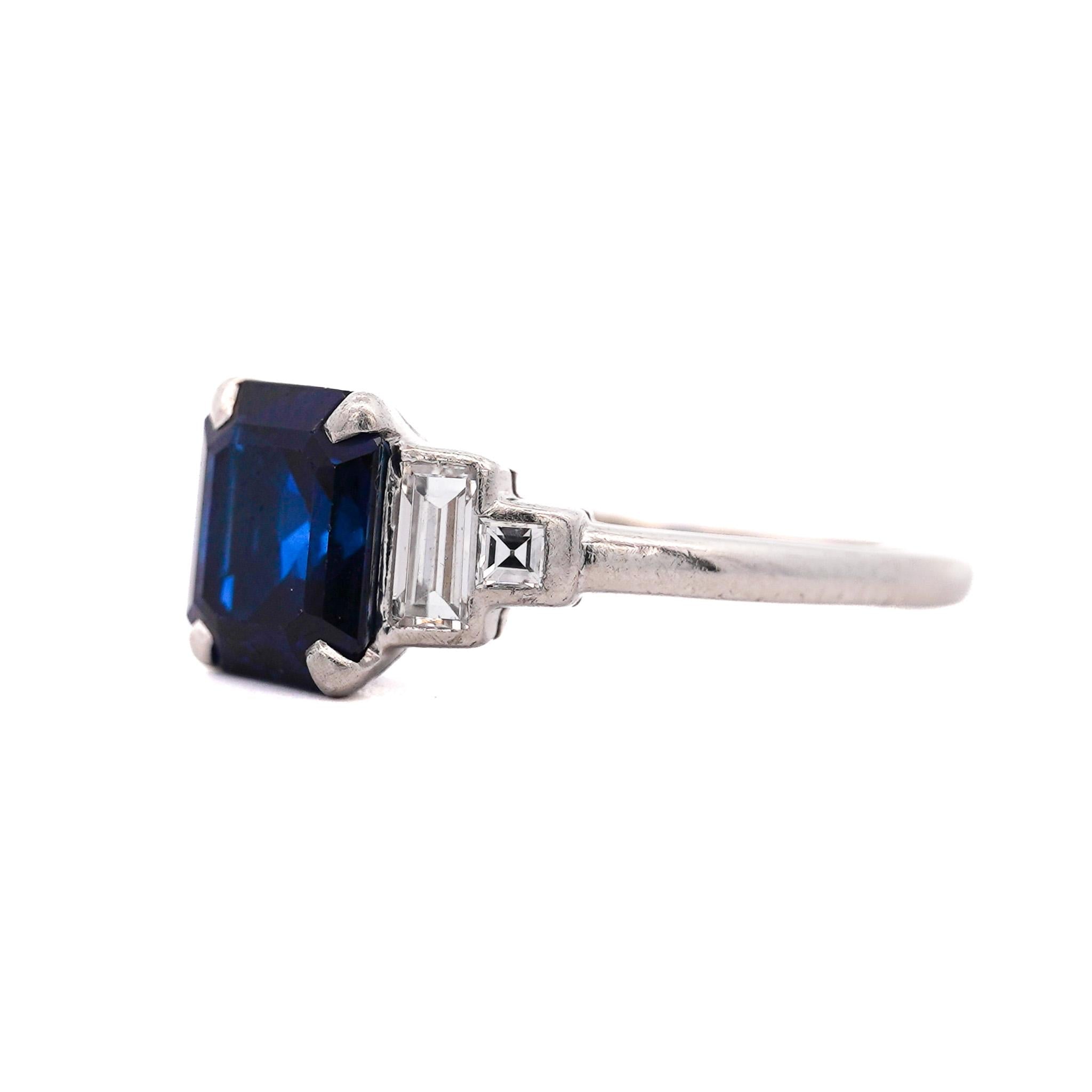 Cartier Paris Art Deco platinum ring set with a GIA certified no heat Royal Blue sapphire, approximately 2.30 carats by formula, in an emerald octagonal step cut. The center sapphire is flanked by baguette and asscher cut diamonds totaling approximately 0.80 carats in a three-stone Art Deco design. Signed Cartier Paris, circa 1920s–1930s. Total weight 4.04 grams.