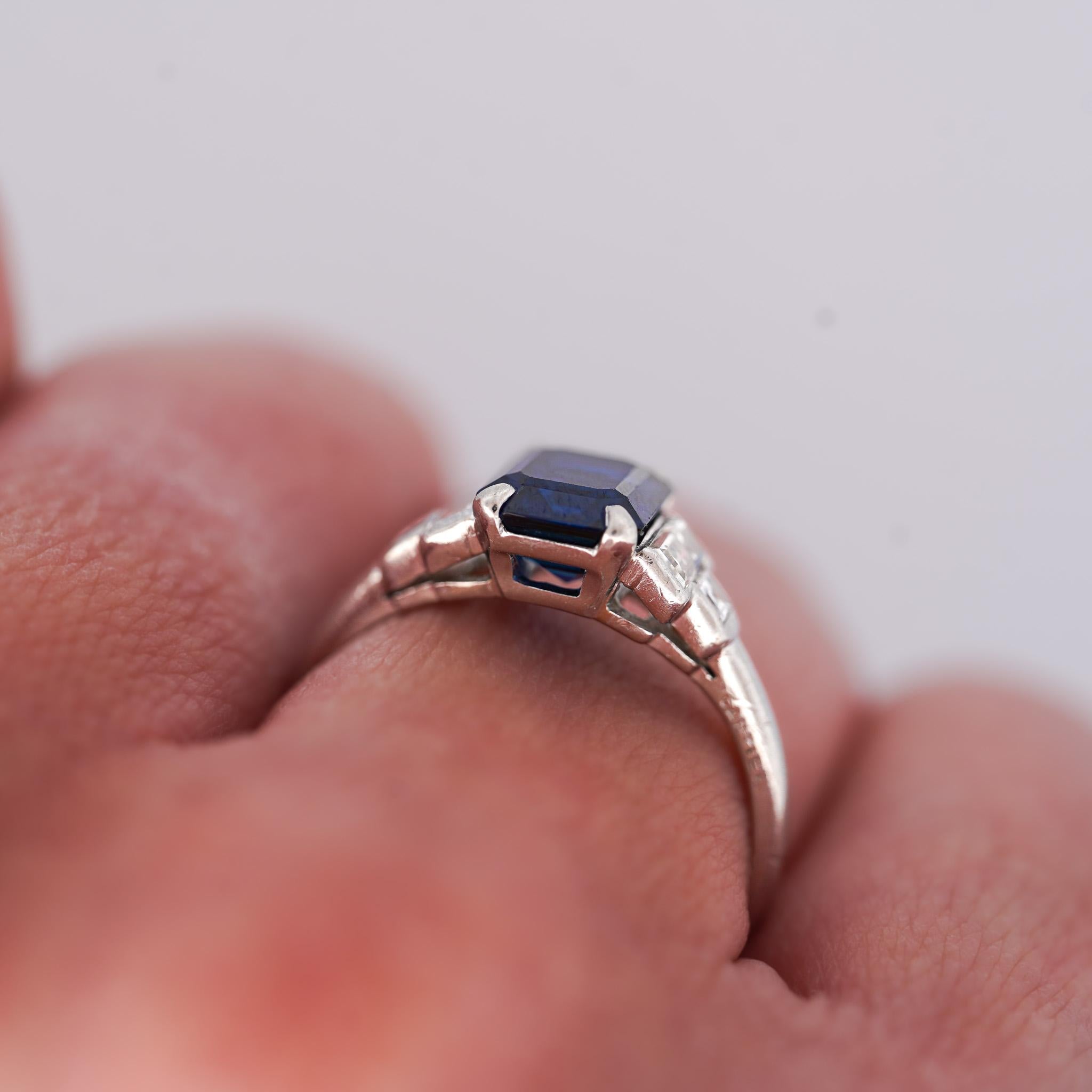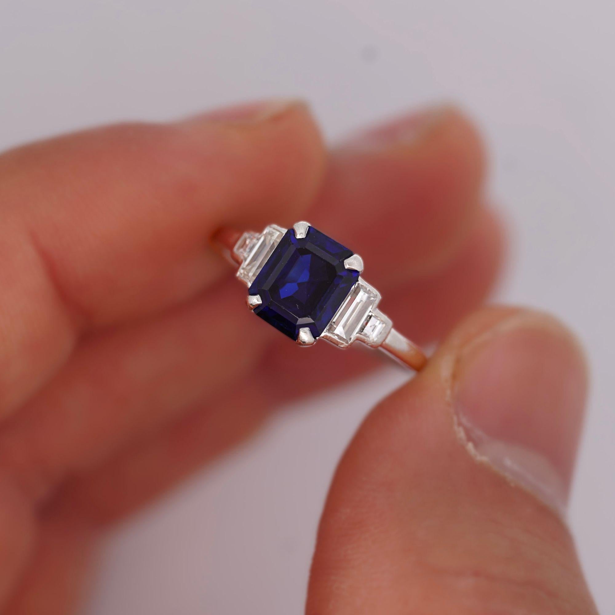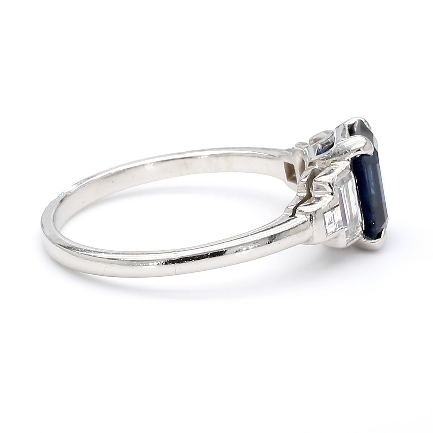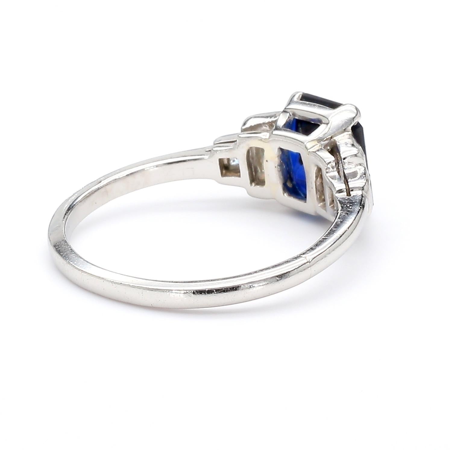 This Cartier Paris Art Deco sapphire and diamond ring represents the design language that made Cartier one of the defining jewelry houses of the 1920s and 1930s. The ring uses a three-stone platinum construction with an emerald-cut royal blue sapphire at the center and geometric diamond shoulders on each side. The baguette and asscher cut diamonds create the stepped architectural profile associated with Art Deco Cartier jewelry, where symmetry, proportion, and gemstone contrast mattered more than decoration for decoration’s sake. Signed Cartier Paris period sapphire rings are highly collected, especially when paired with no heat blue sapphires and original Art Deco construction.