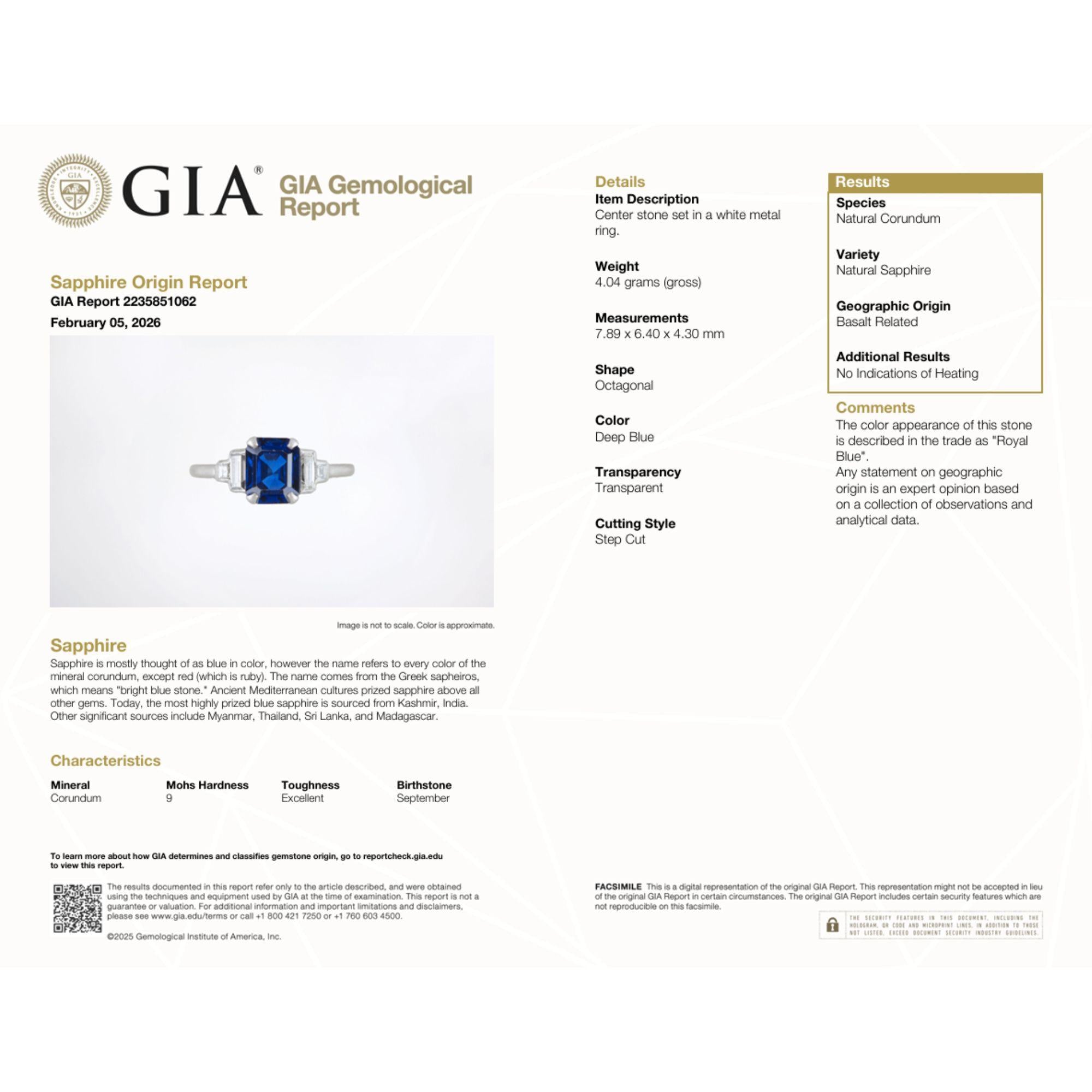 Basaltic sapphires come from basalt-related geological environments and are commonly associated with sources such as Cambodia, Thailand, Australia, Vietnam, and other volcanic sapphire deposits. These sapphires can show deep, saturated blue color, which is why they can be visually effective in Art Deco-style platinum and diamond settings. Historically, the most famous prestige sapphire origins were Kashmir, Burma/Myanmar, and Ceylon/Sri Lanka, while modern gemological origin reporting also recognizes basaltic sources more specifically through trace element chemistry and inclusion analysis. For this ring, “Basaltic” should be presented as the GIA origin classification, not as a substitute for Kashmir or Burma. The Cartier relevance is visual and historical: Cartier favored sapphires with strong color, clean presentation, and enough transparency to hold up against platinum and diamonds, and this basaltic Royal Blue sapphire fits that design logic.
