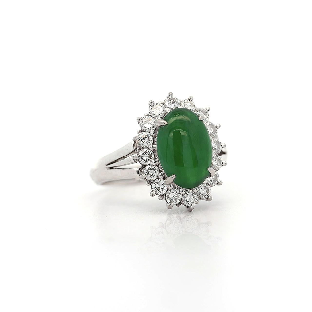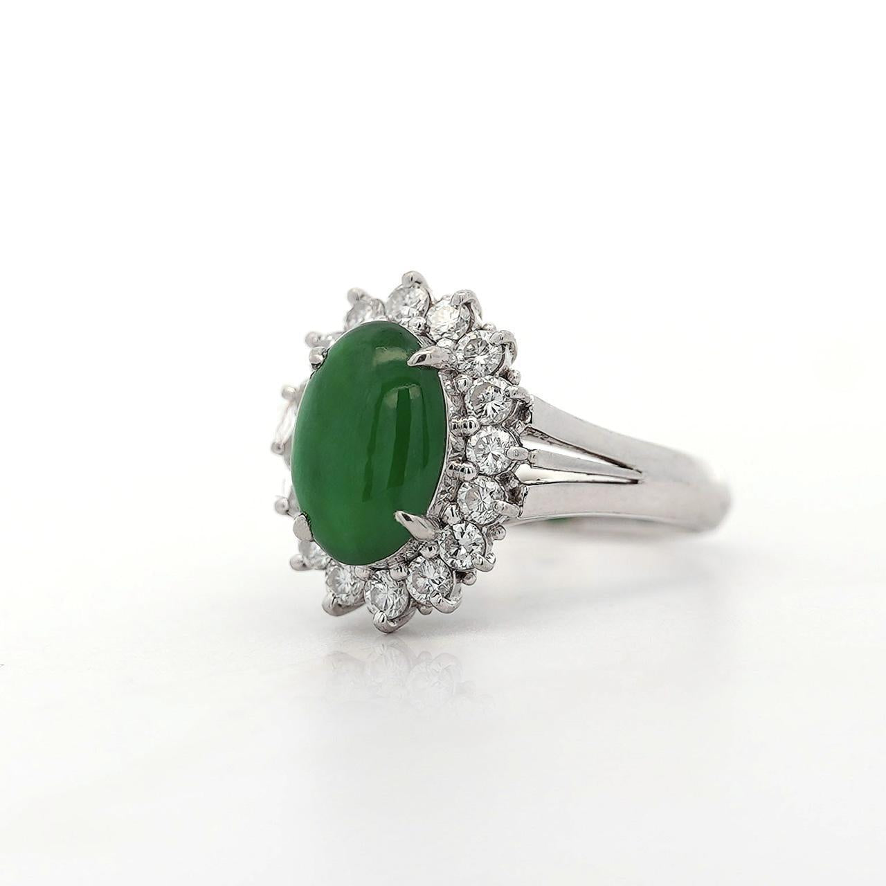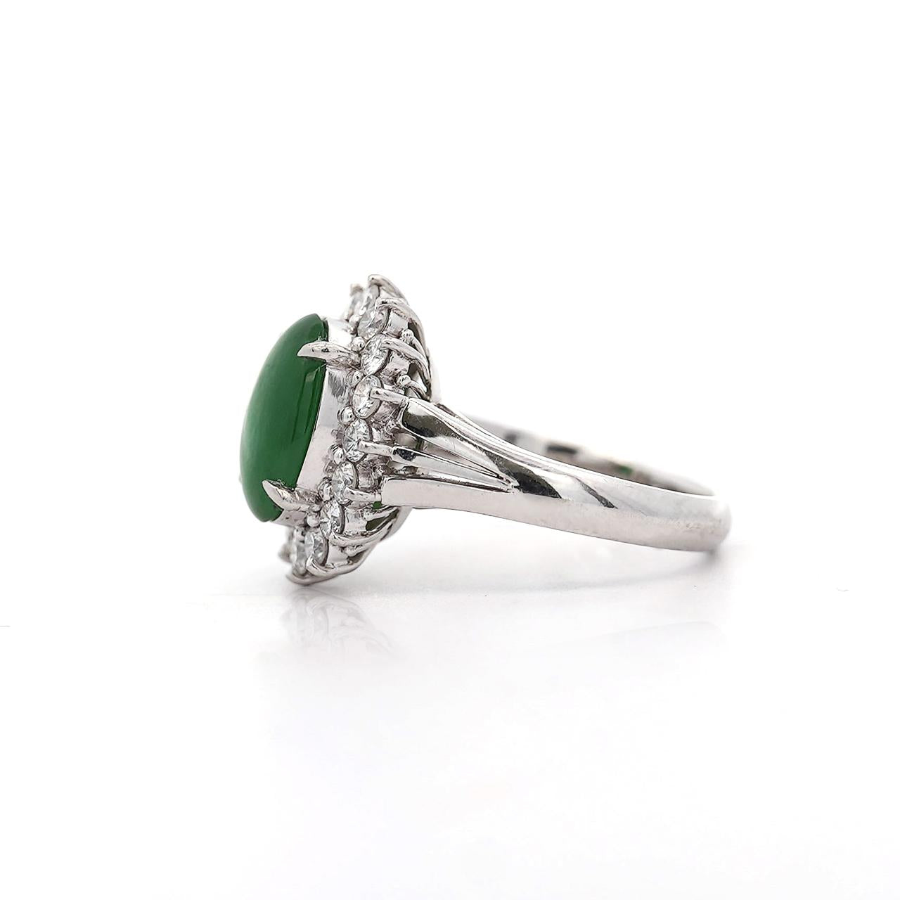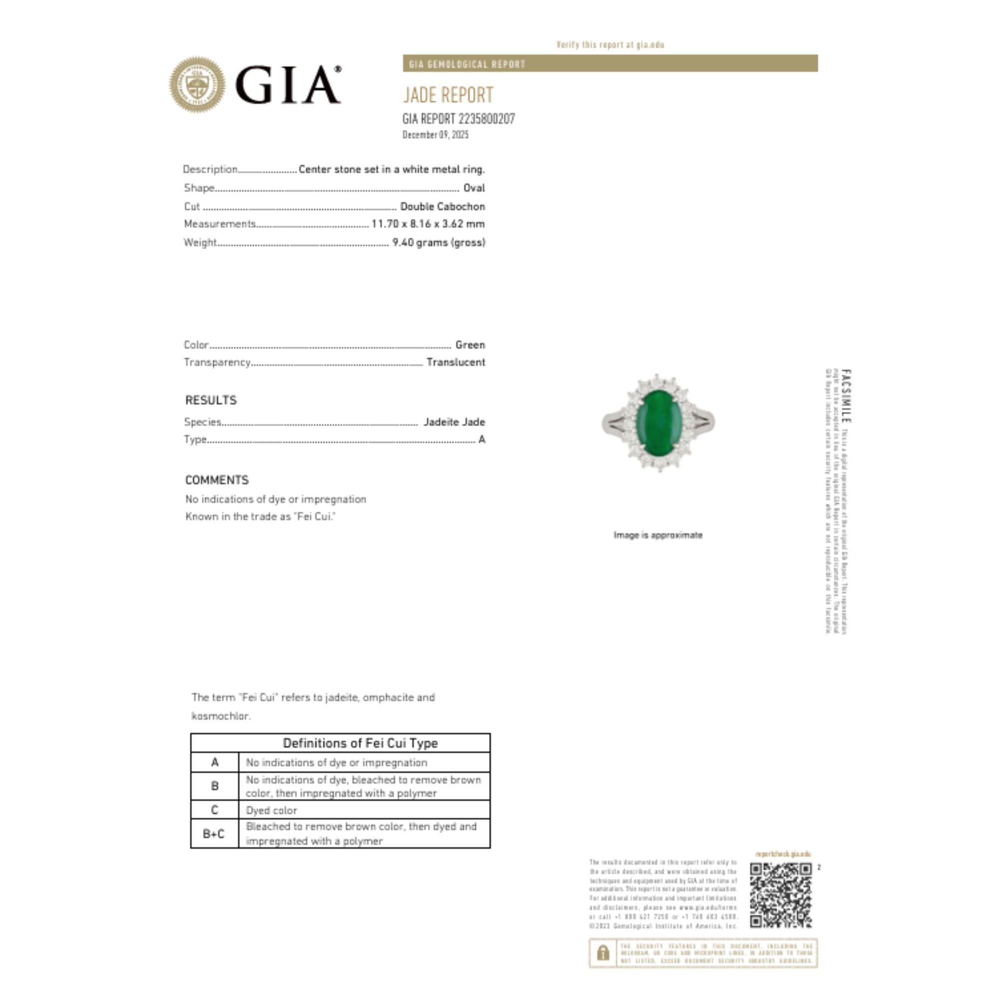 GIA certified Type A Fei Cui Jadeite Jade ring in platinum featuring oval cabochon measuring 11.70 x 8.16 x 3.62mm surrounded by diamond halo with split shank design. Natural untreated jade known as fei cui, total weight 9.40 grams, ring size 6.75, adjustable.