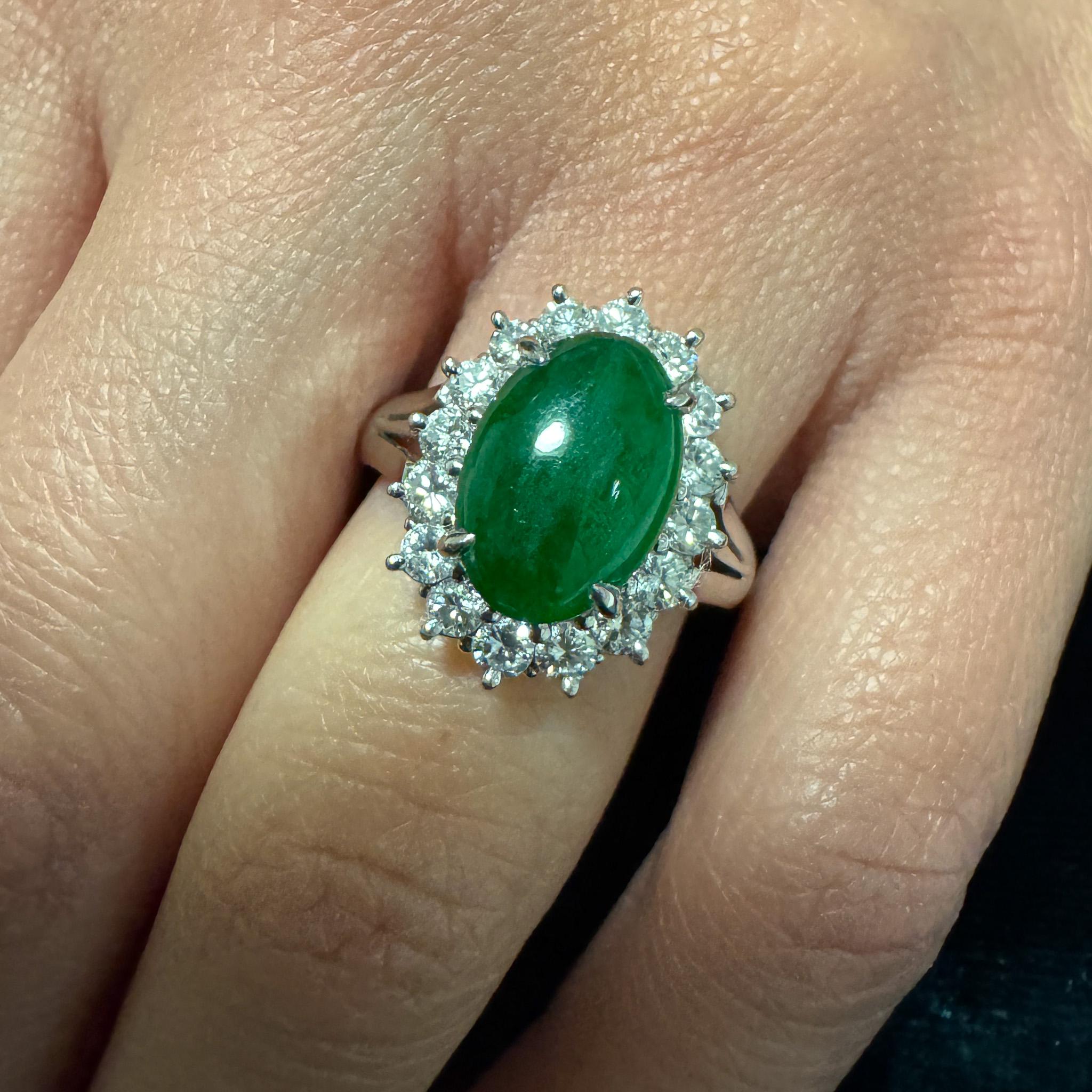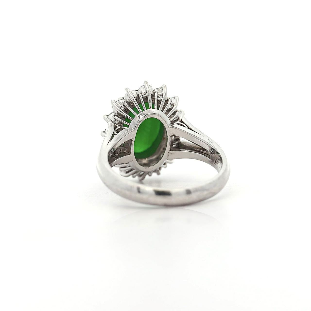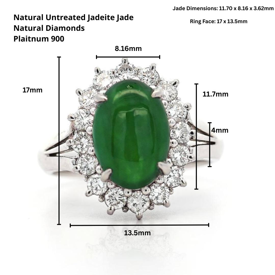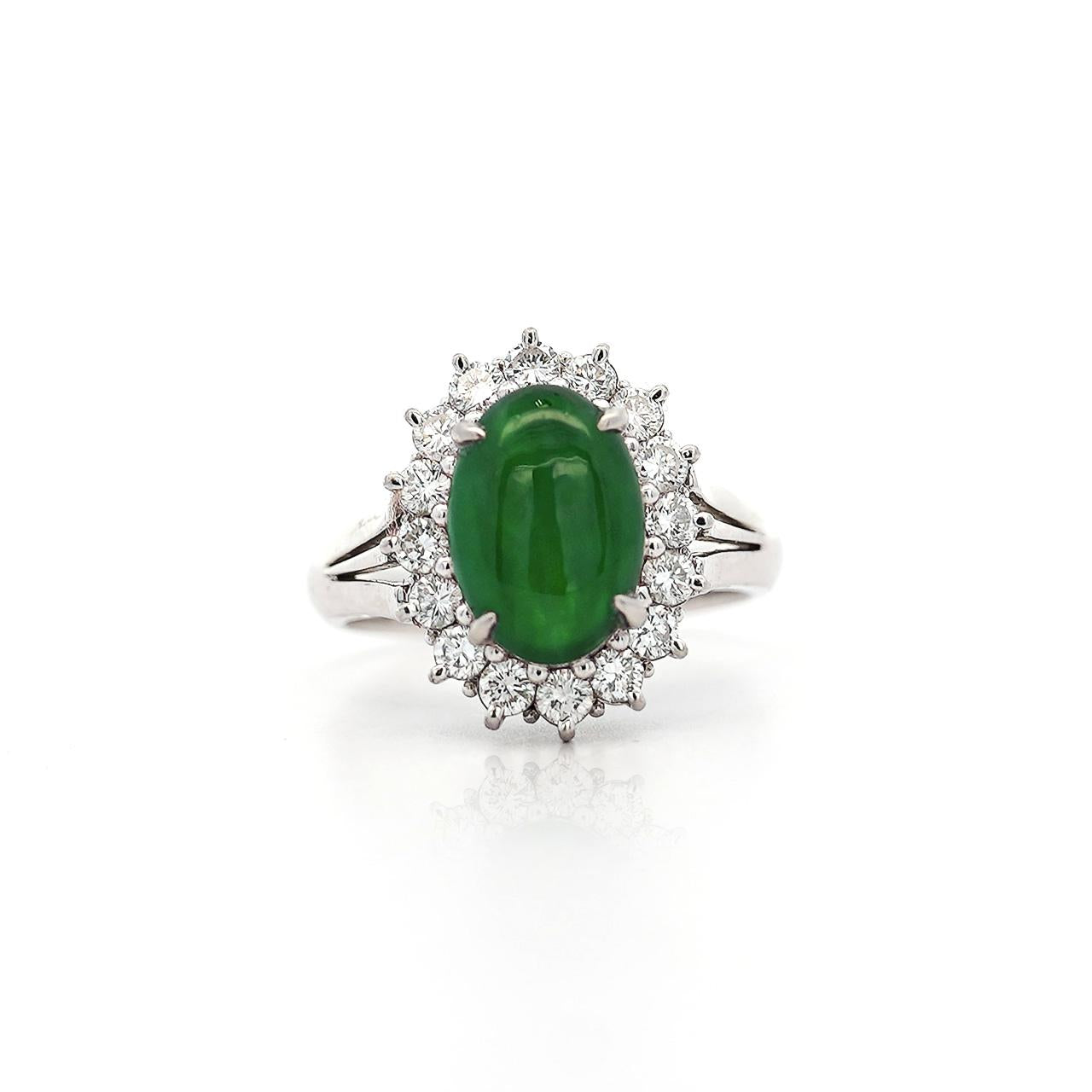 GIA certified Type A Fei Cui Jadeite Jade ring in platinum featuring oval cabochon measuring 11.70 x 8.16 x 3.62mm surrounded by diamond halo with split shank design. Natural untreated jade known as fei cui, total weight 9.40 grams, ring size 6.75, adjustable.