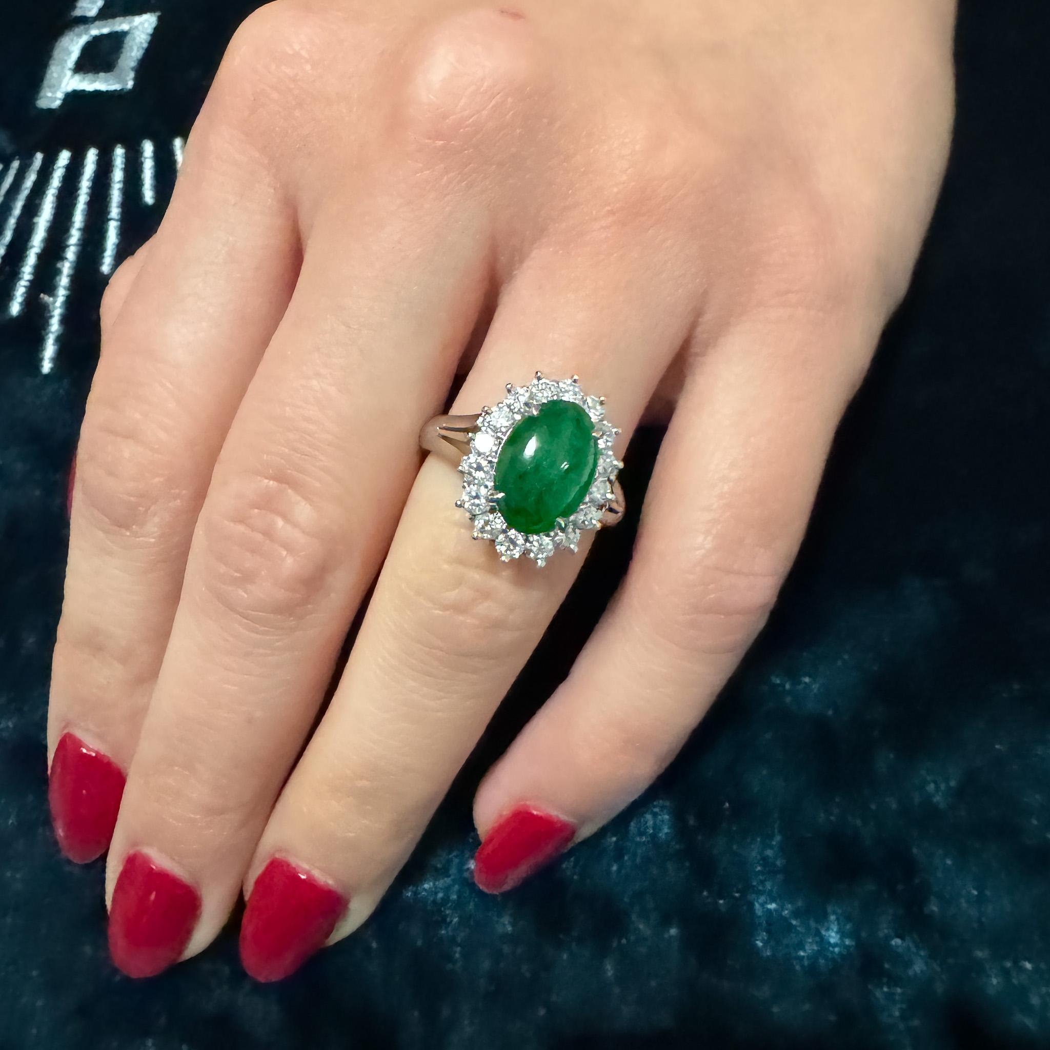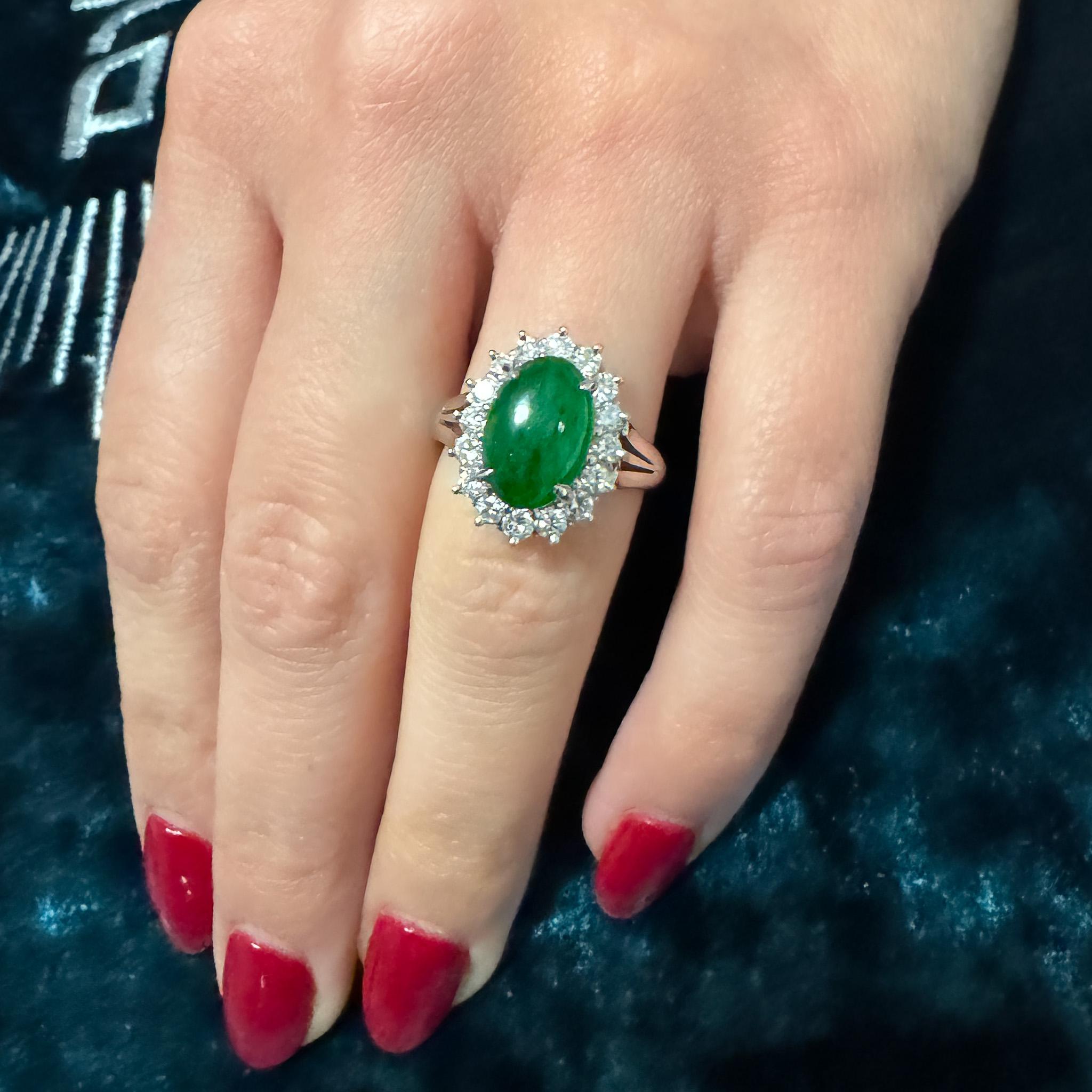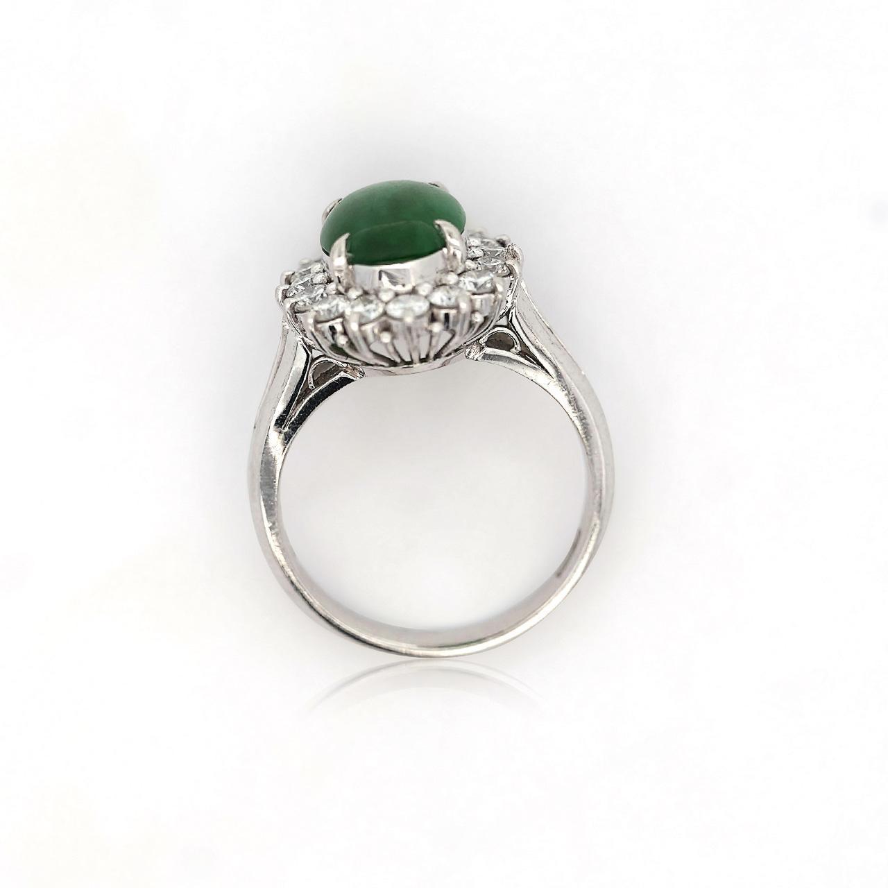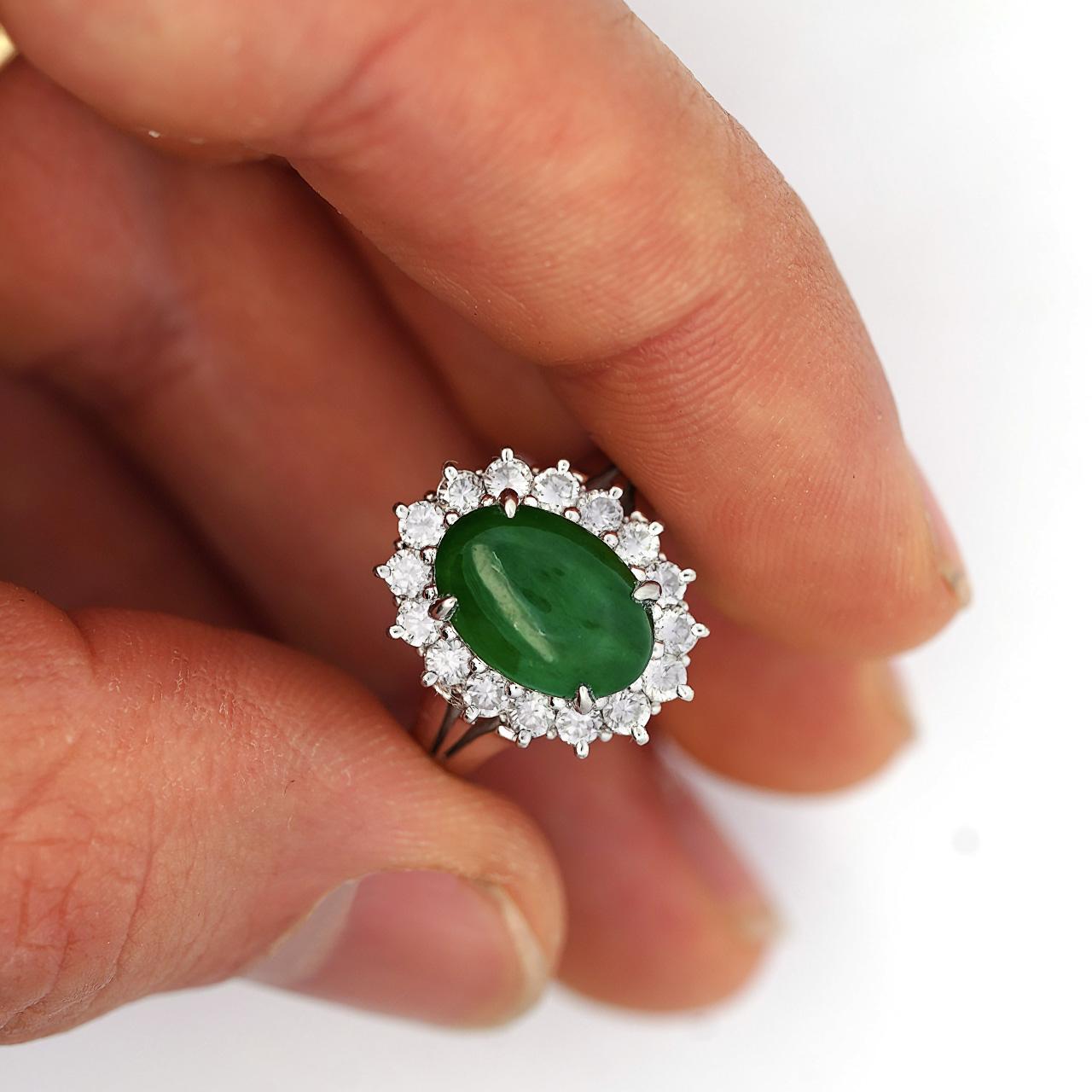 GIA certified Type A Fei Cui Jadeite Jade ring in platinum featuring oval cabochon measuring 11.70 x 8.16 x 3.62mm surrounded by diamond halo with split shank design. Natural untreated jade known as fei cui, total weight 9.40 grams, ring size 6.75, adjustable.