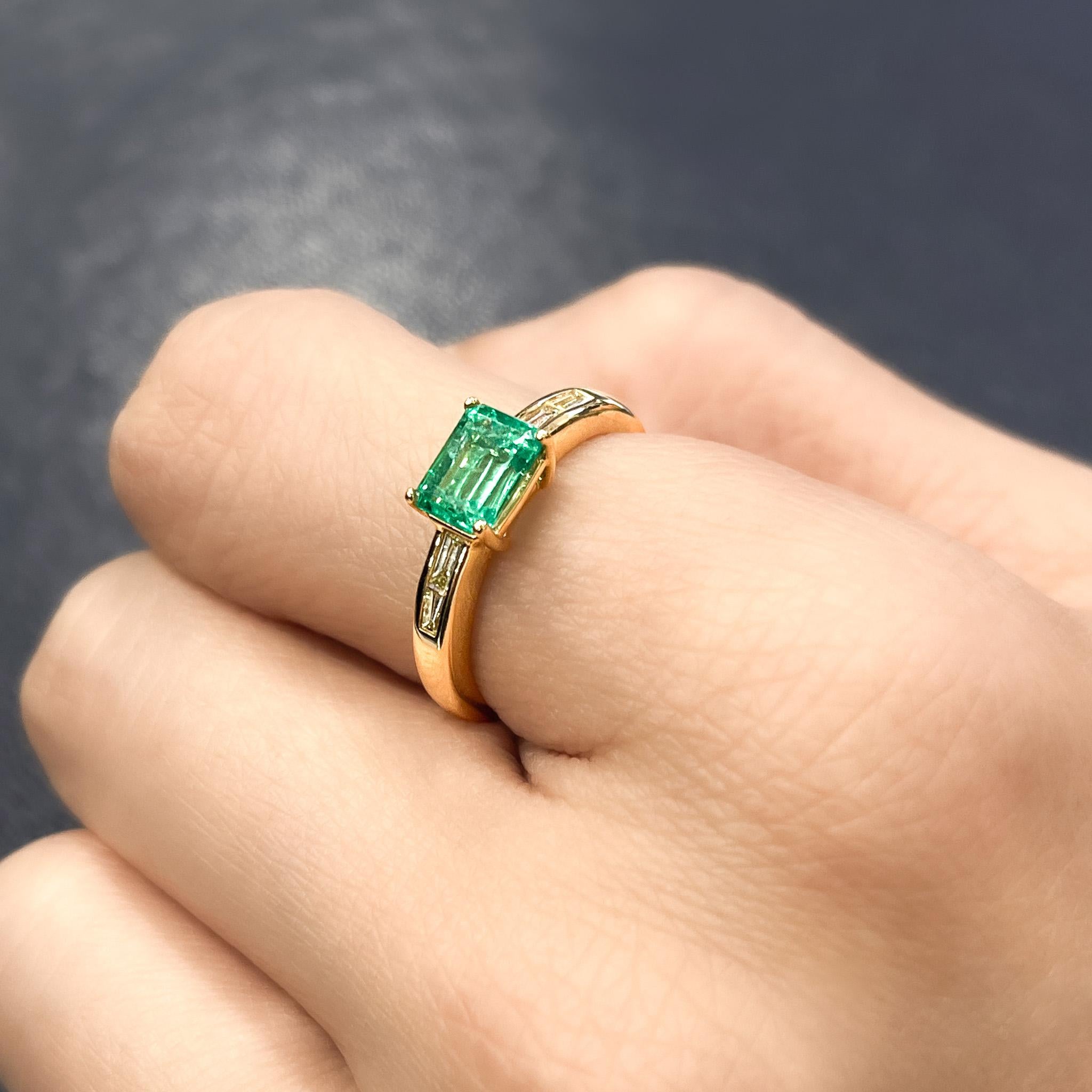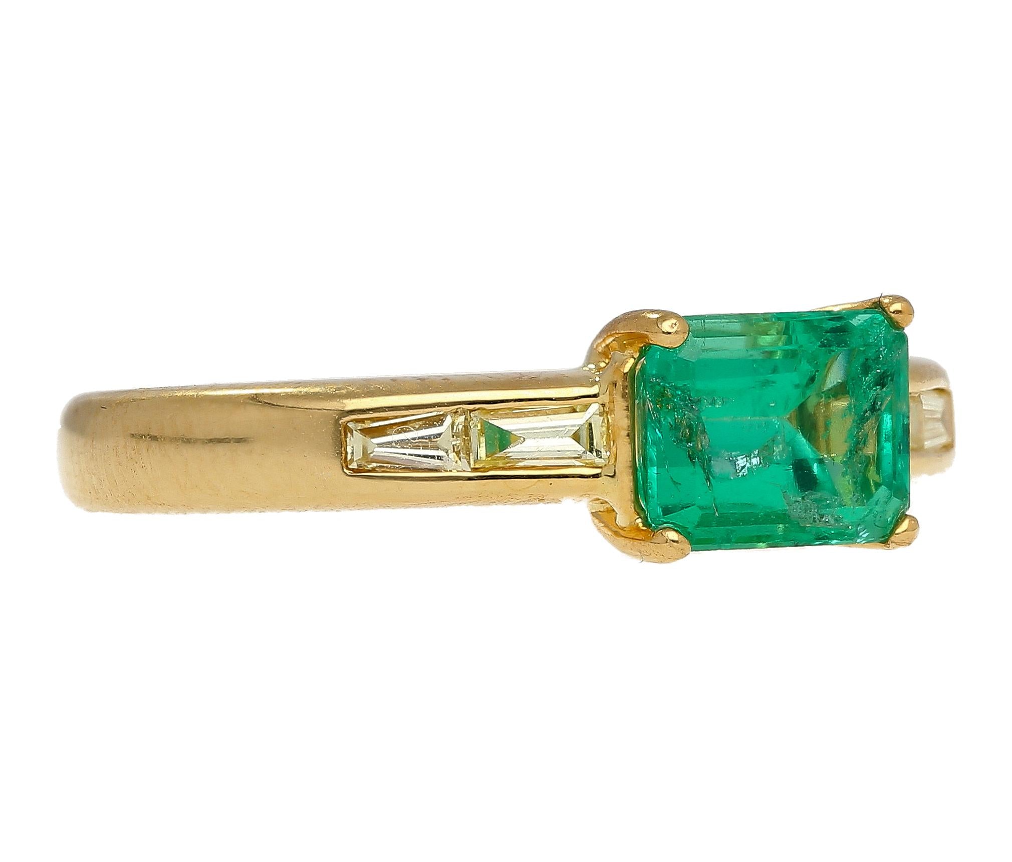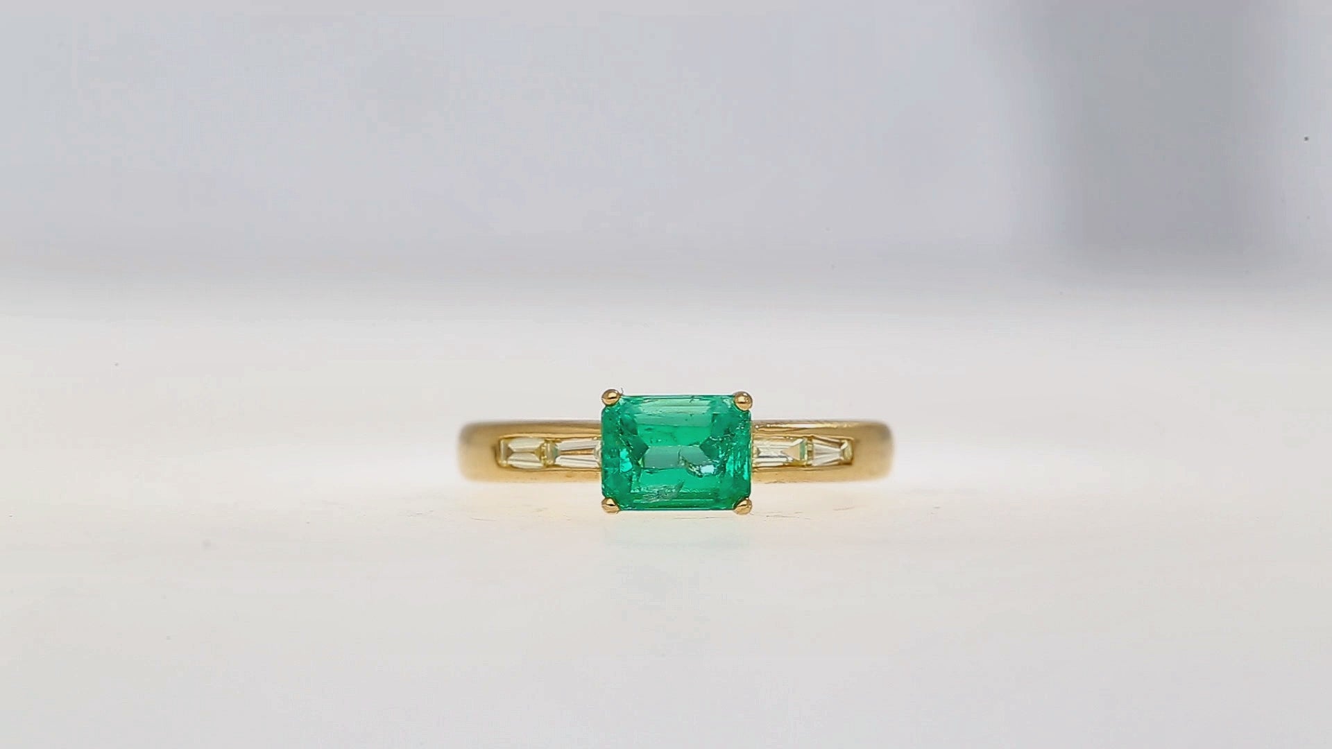 Natural 1 Carat Emerald & Baguette Diamond 18K Gold East West Ring