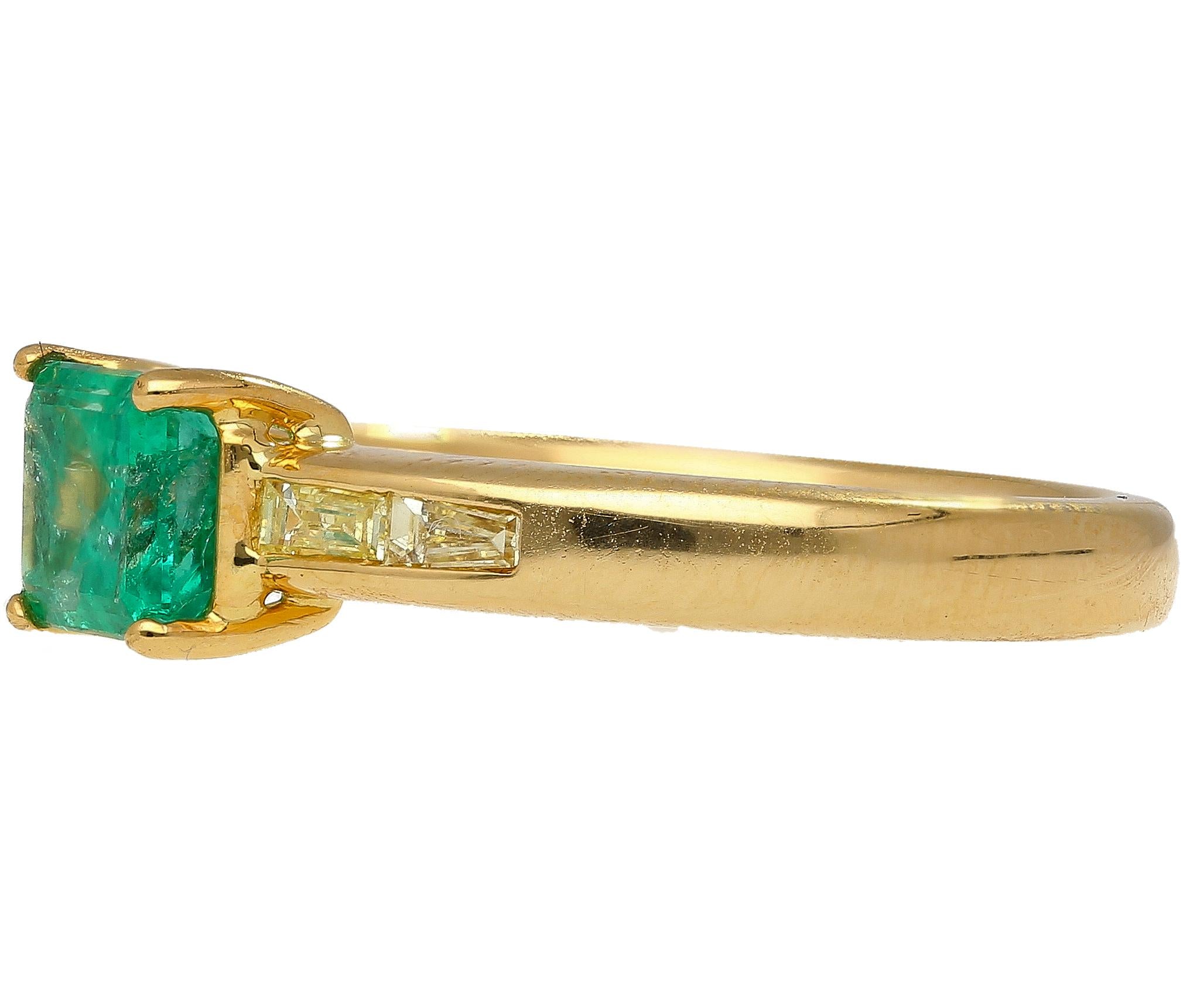 1.0 carat natural emerald cut emerald east-west engagement ring with baguette diamond side stones in 18K yellow gold.