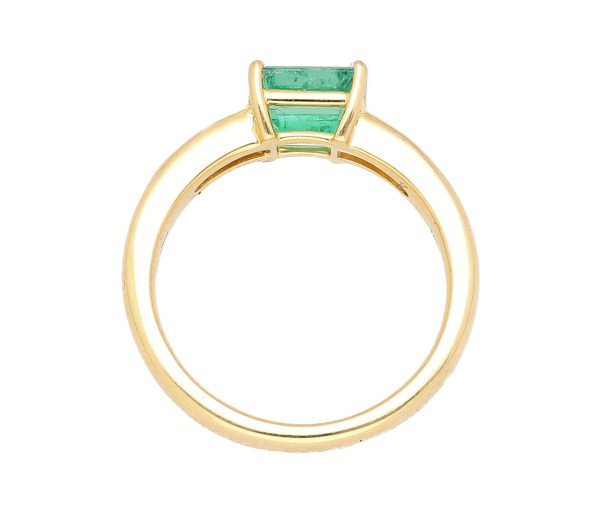 This elegant east-west ring showcases the emerald cut emerald horizontally in a polished 18K yellow gold setting with elevated four-prong basket. The smooth tapered shank creates refined lines while two baguette-cut diamonds on each side add sophisticated sparkle. The horizontal orientation creates distinctive visual impact while the yellow gold construction enhances the emerald's rich green color. The channel-set baguettes provide clean, modern lines while the tapered band ensures comfortable everyday wear.