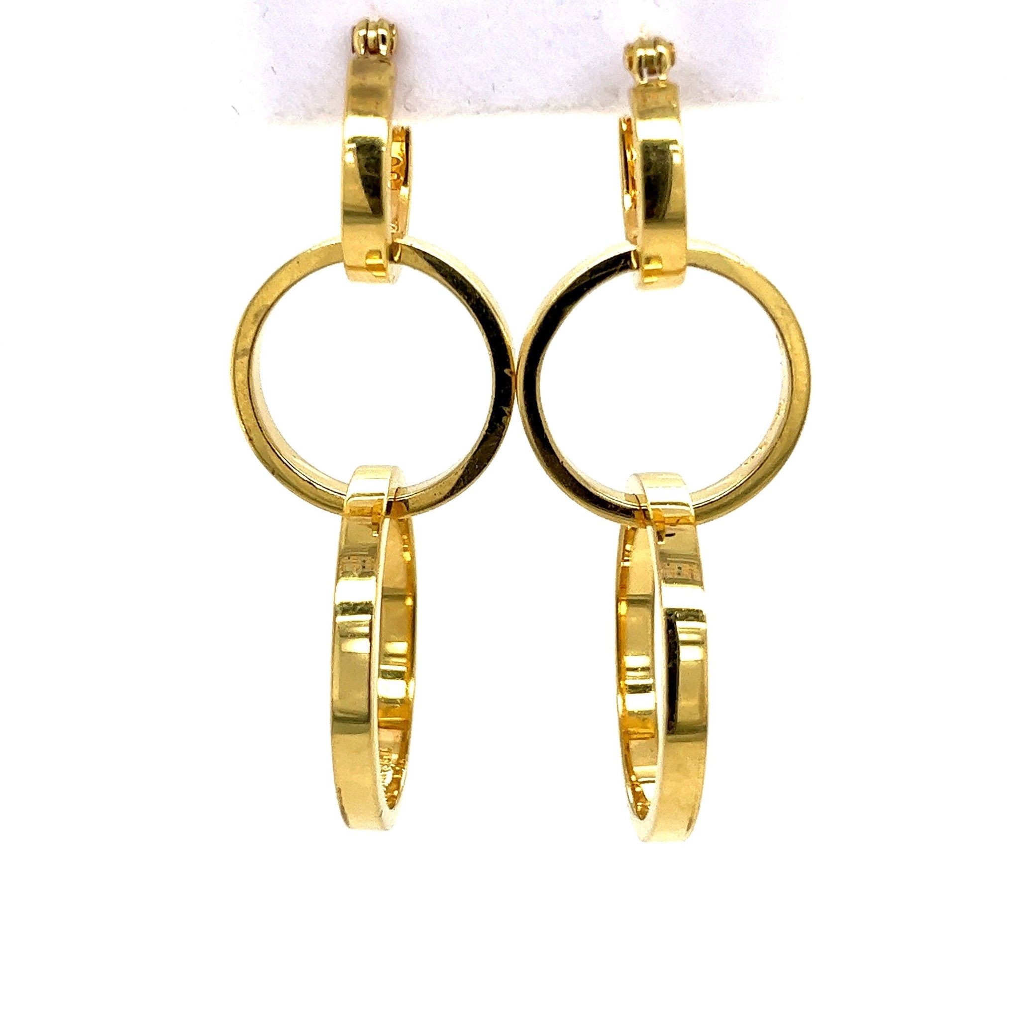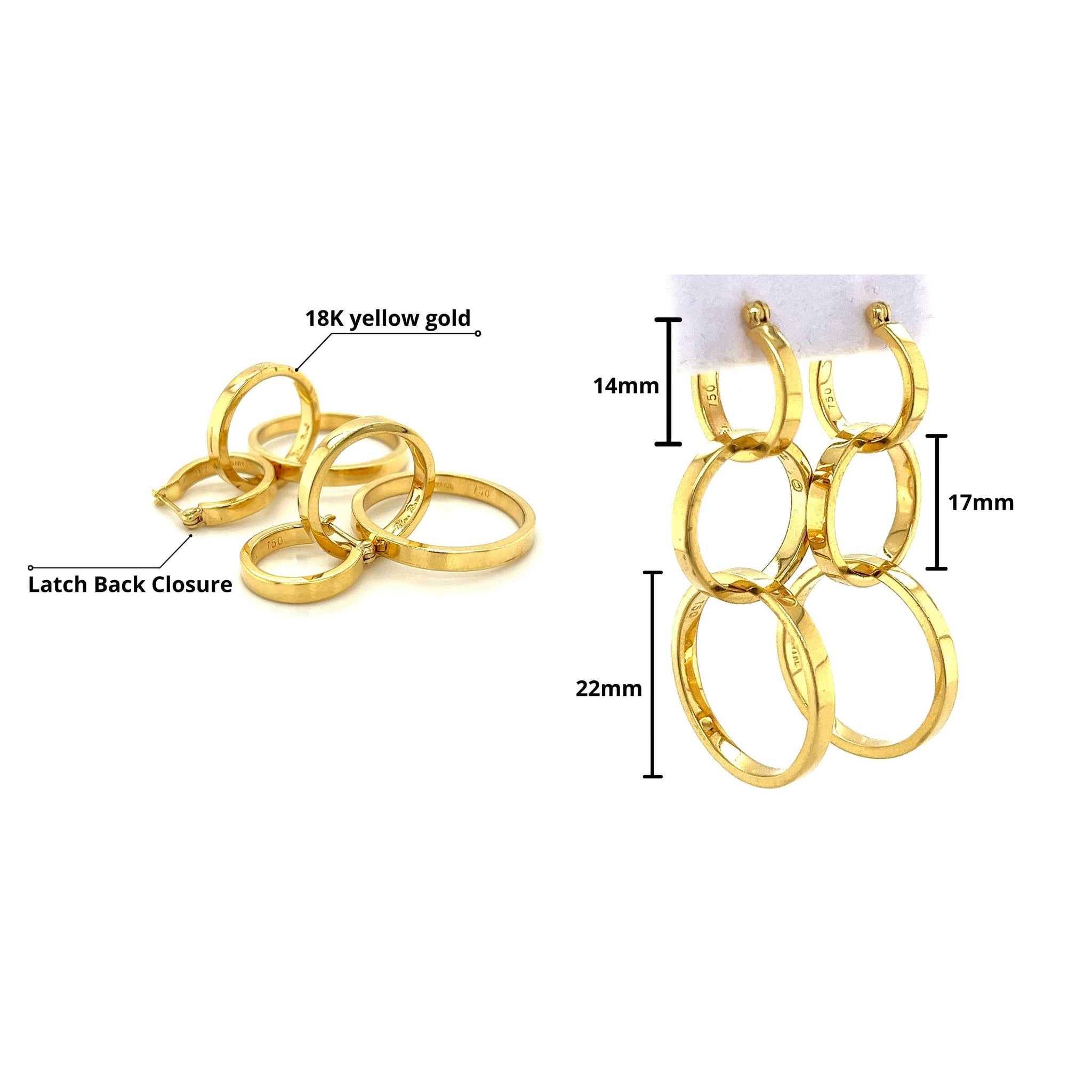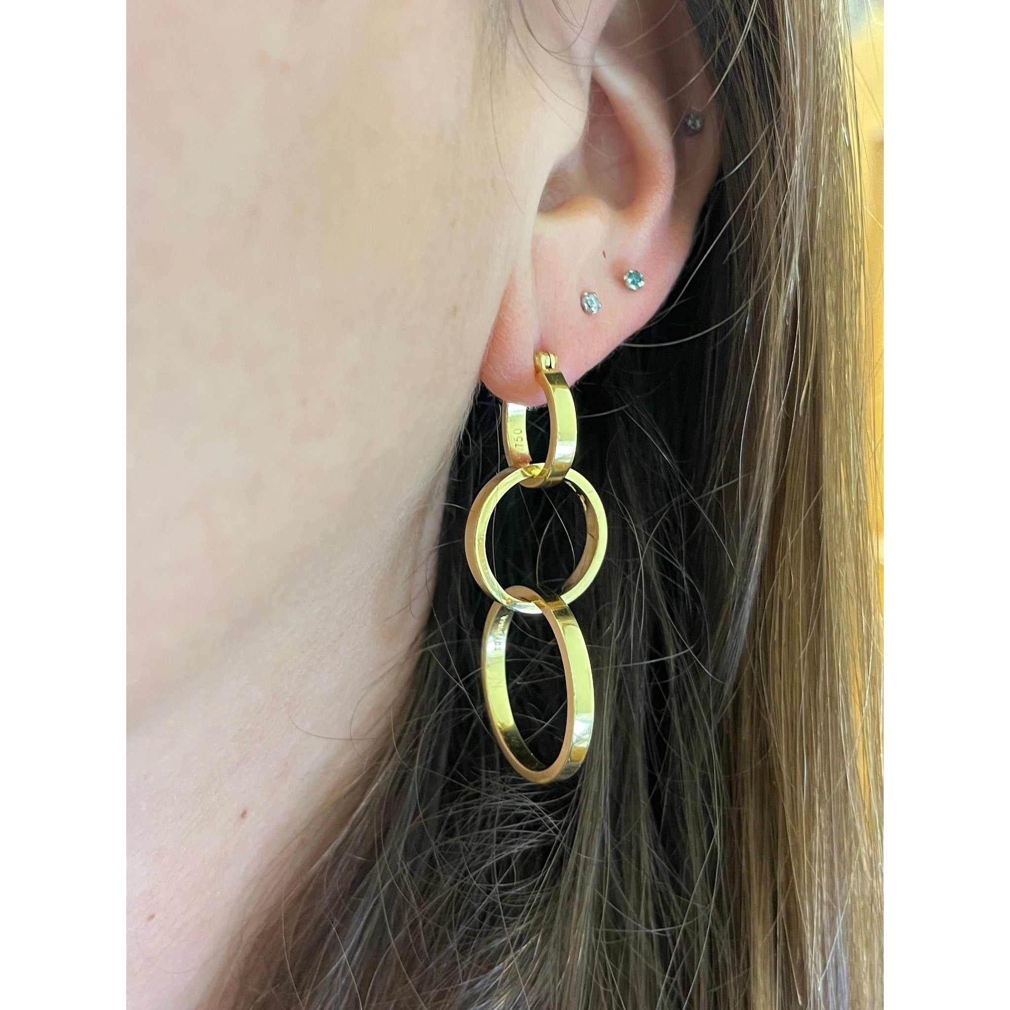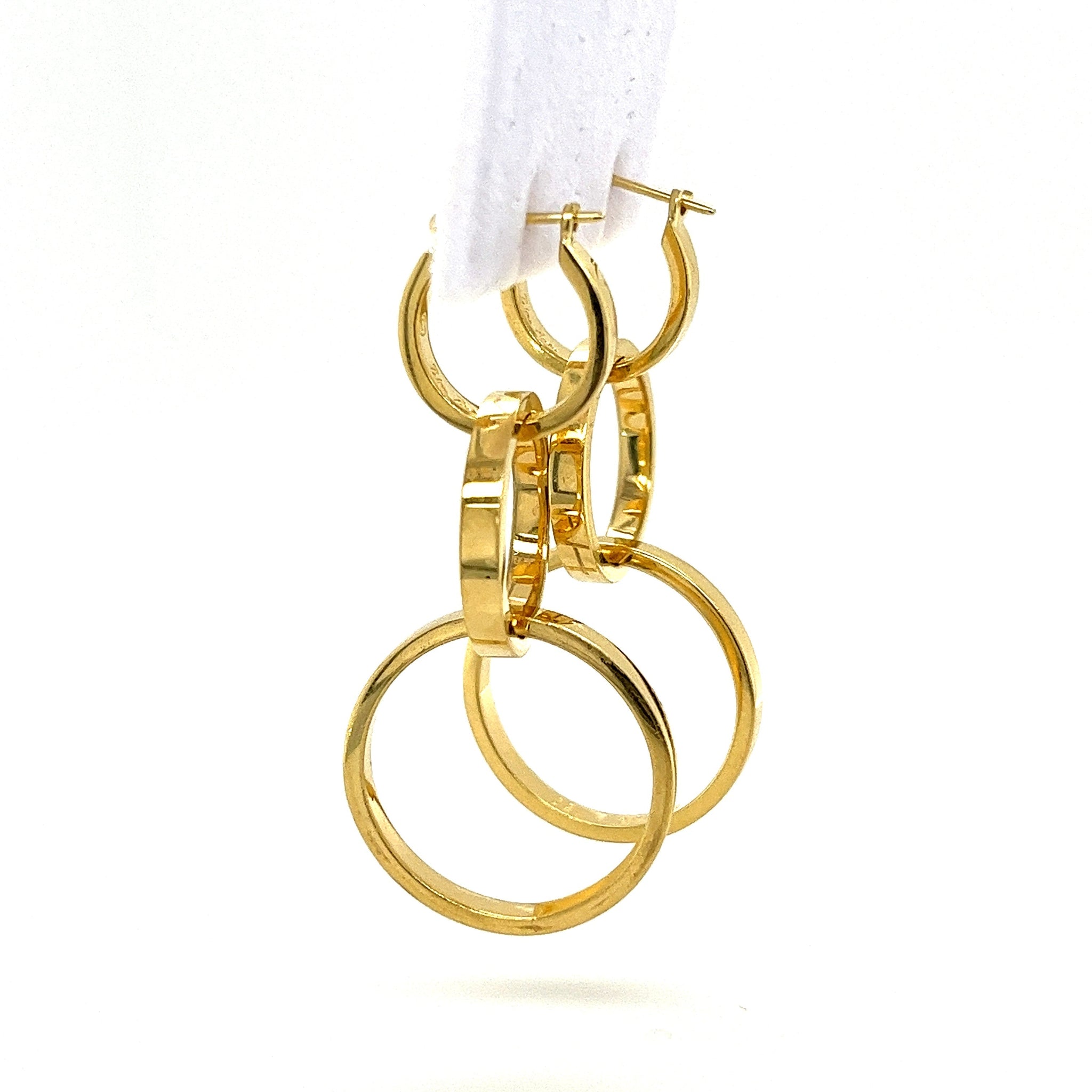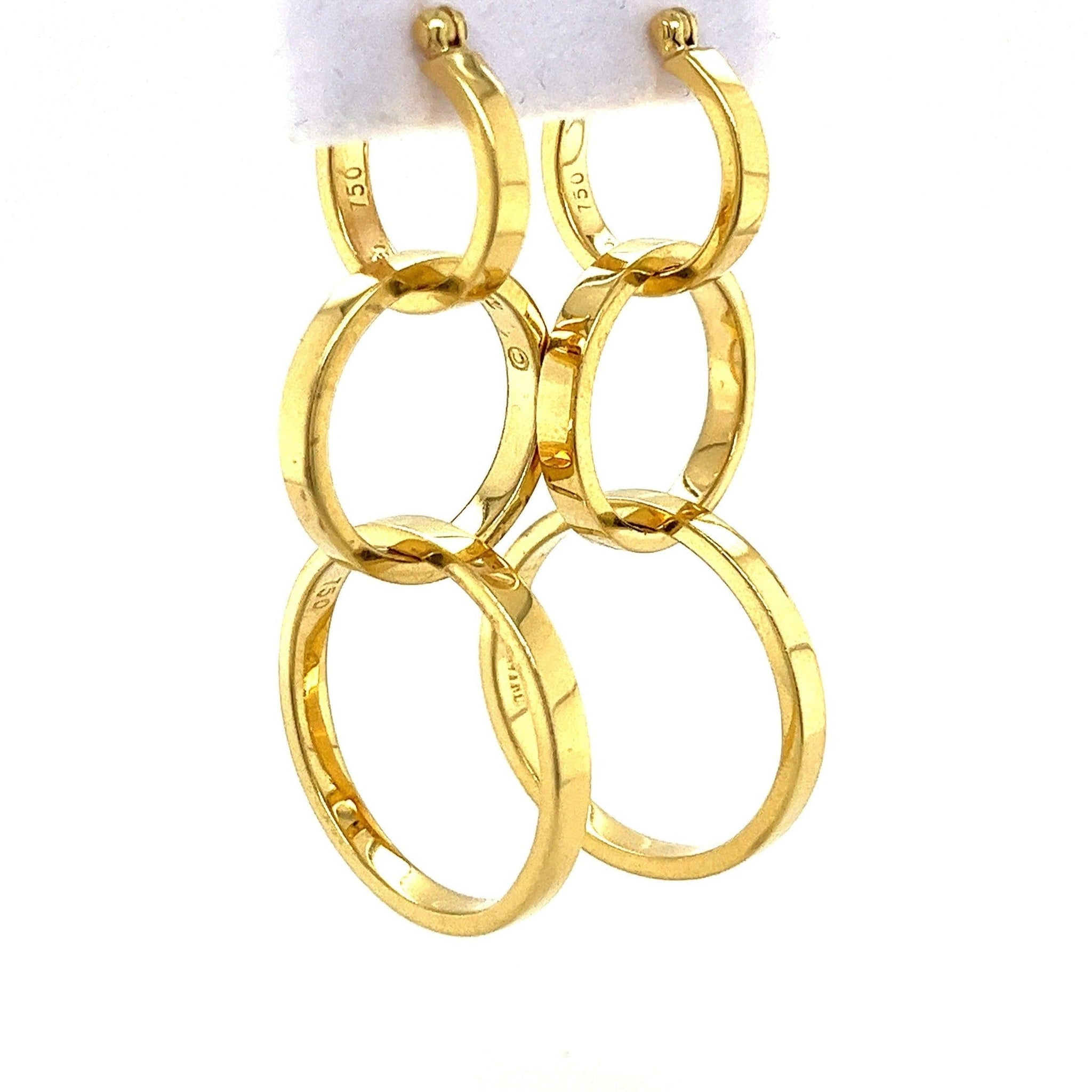 أقراط حلقية متدلية من الذهب الخالص عيار 18 قيراط بثلاثة Ring. موقعة من قبل بالوما بيكاسو لتيفاني وشركاه، مصنوعة بمزيج عصري من المرح والتناظر. مع كل حلقة تزداد في الحجم نحو الأسفل. قطعة حقيقية لافتة للنظر أو بجودة الإرث.