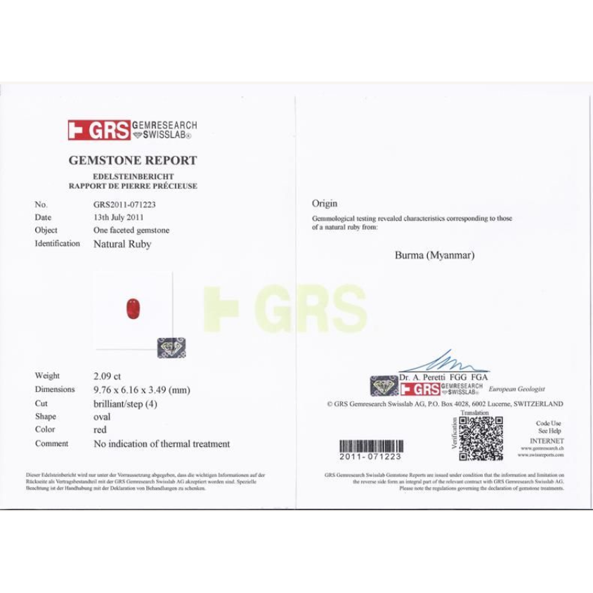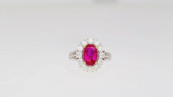 2,09 Karat Ovalschliff Burma Rubin unbehandelt GRS zertifiziert & Diamant-Halo Platin Ring