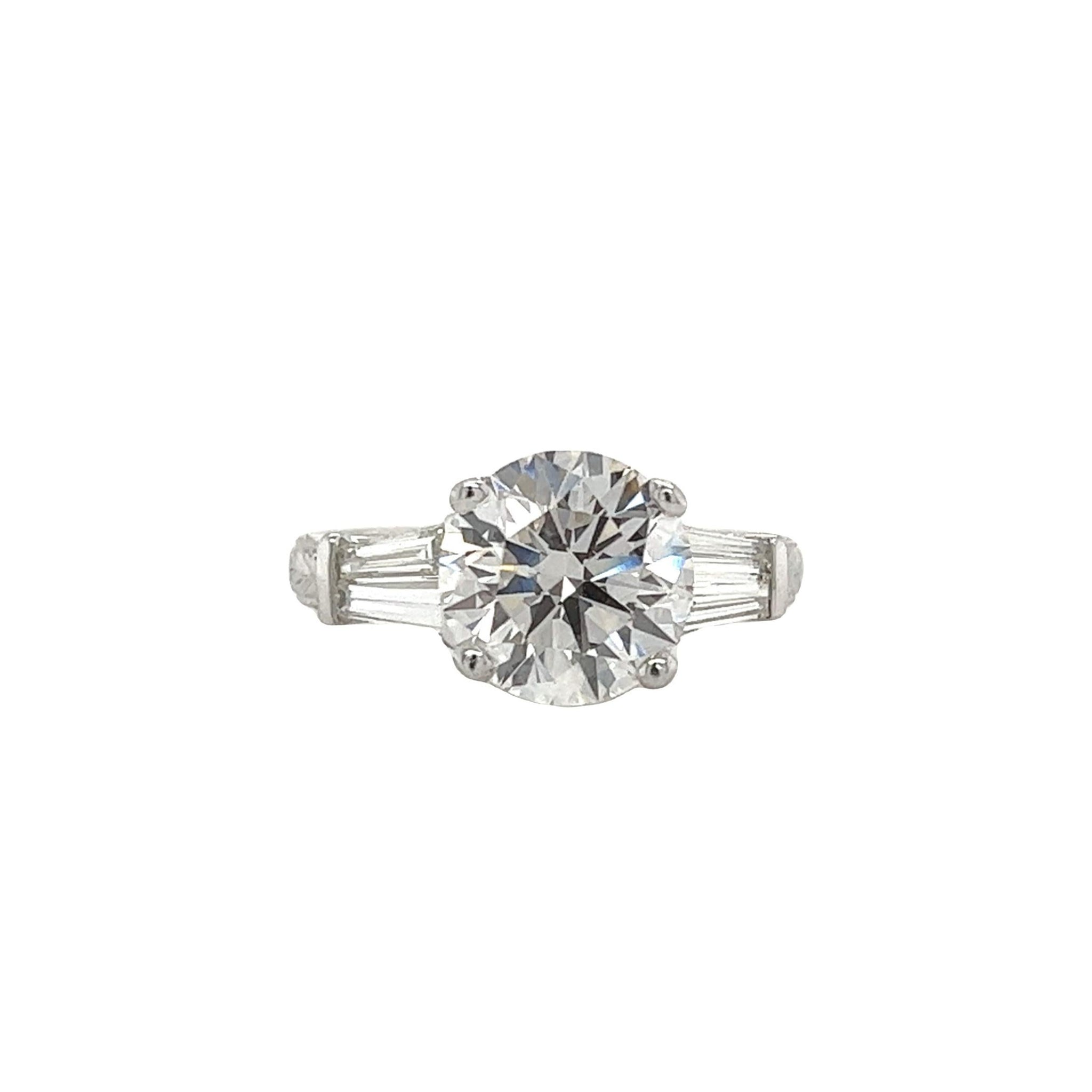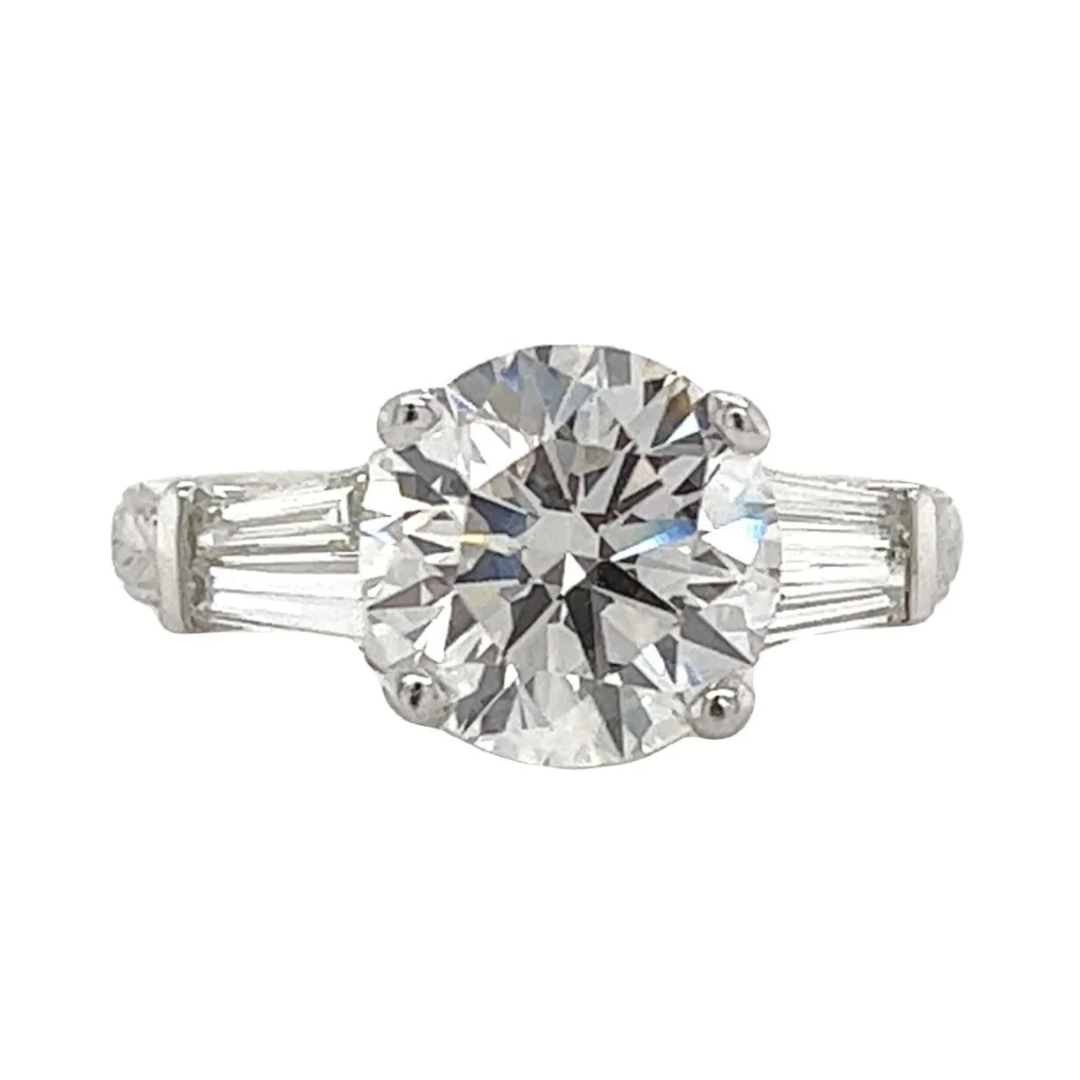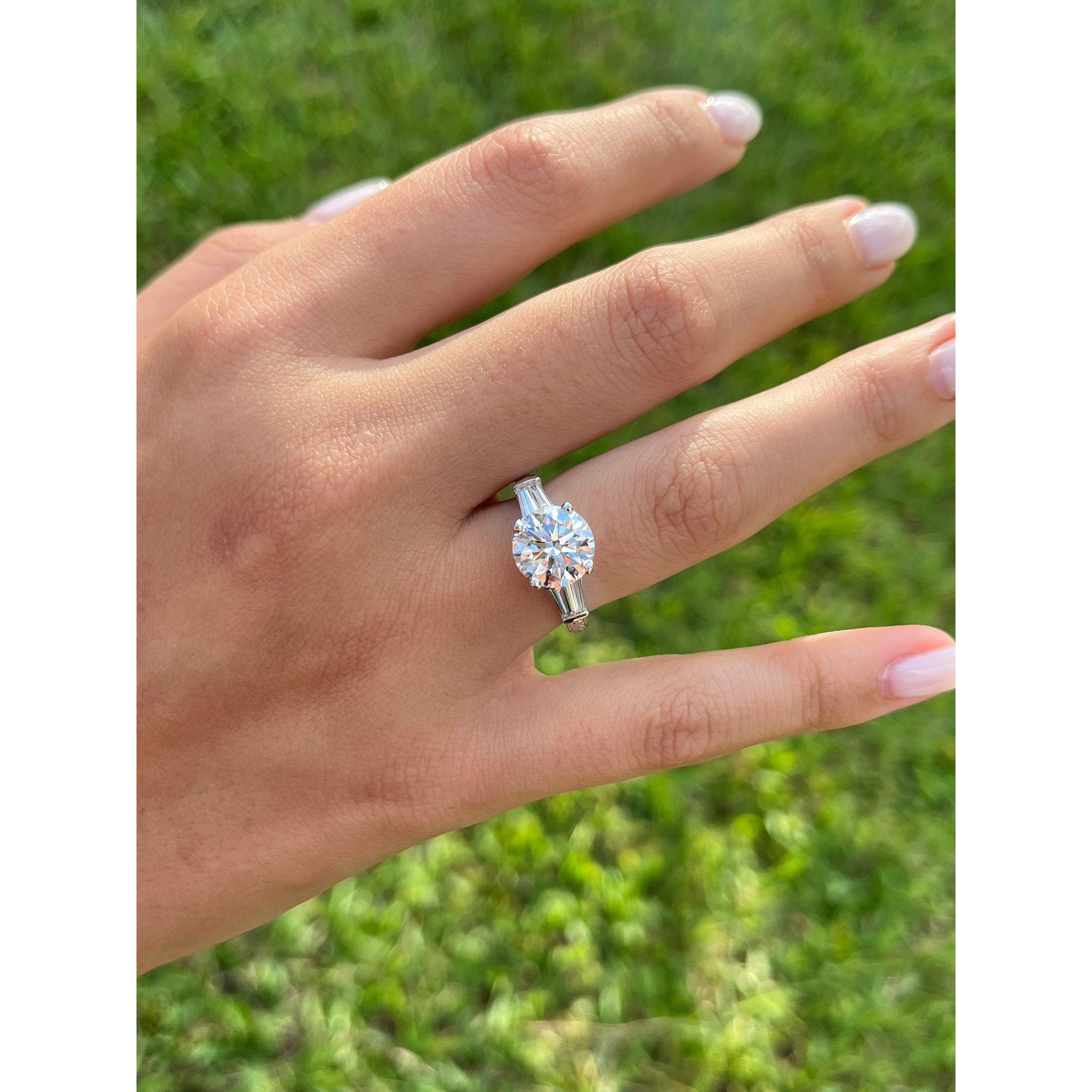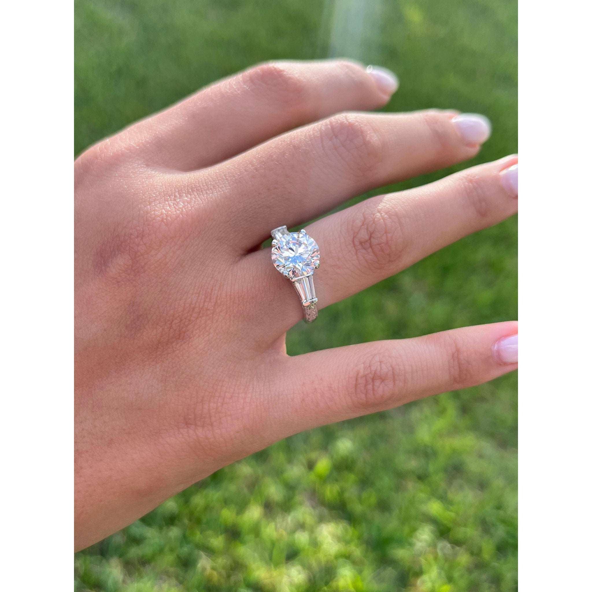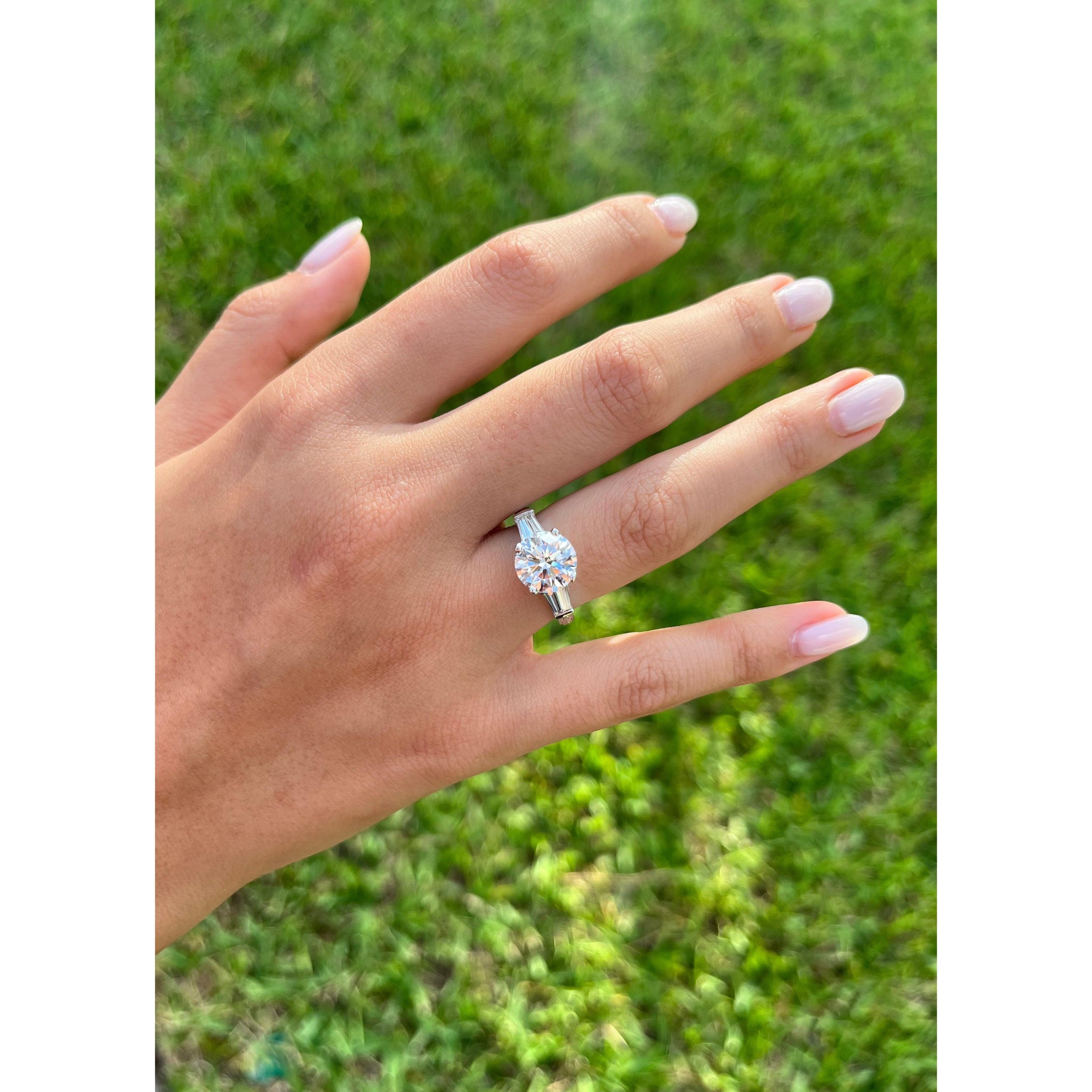 Lebhaft und strahlend 3 Karat runder, geschliffener, im Labor gezüchteter Diamant, eingesetzt in einer Baguette-Schliff, Seitenstein, Platinfassung.