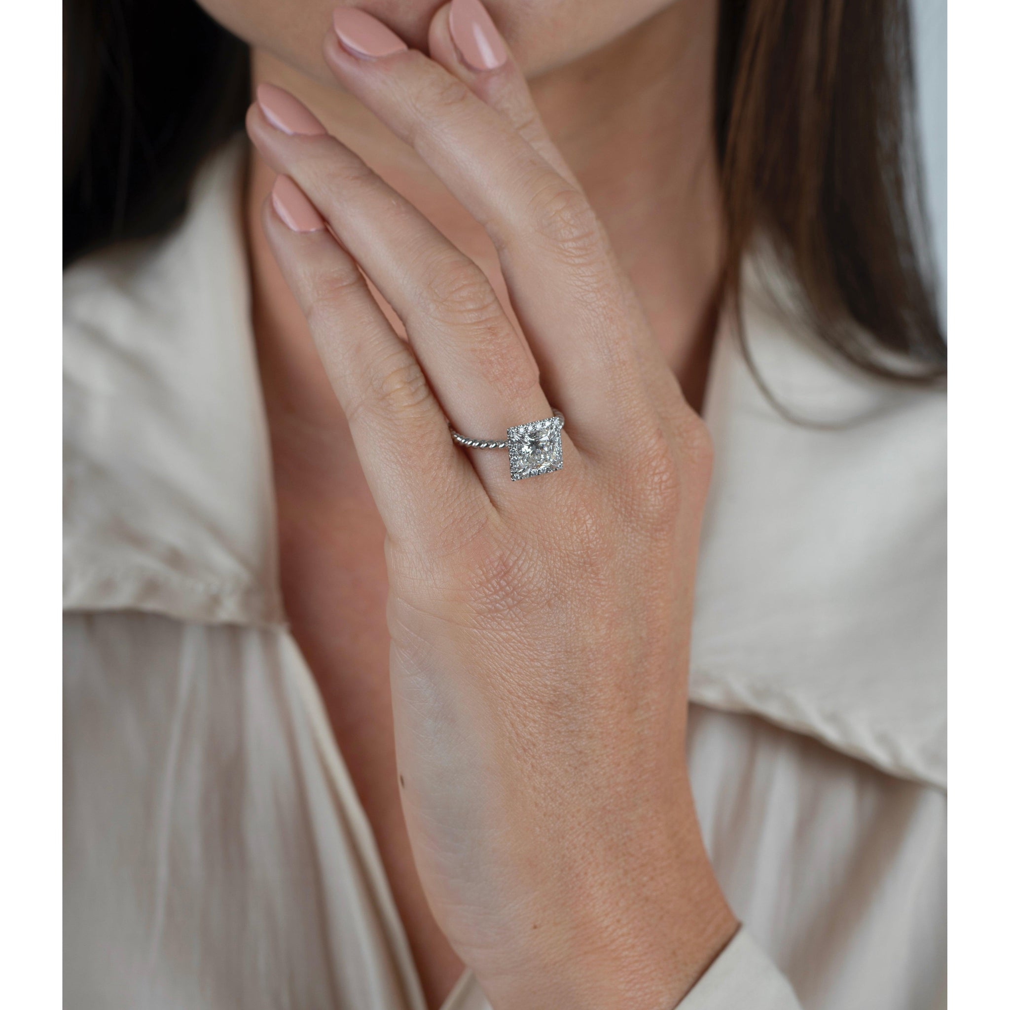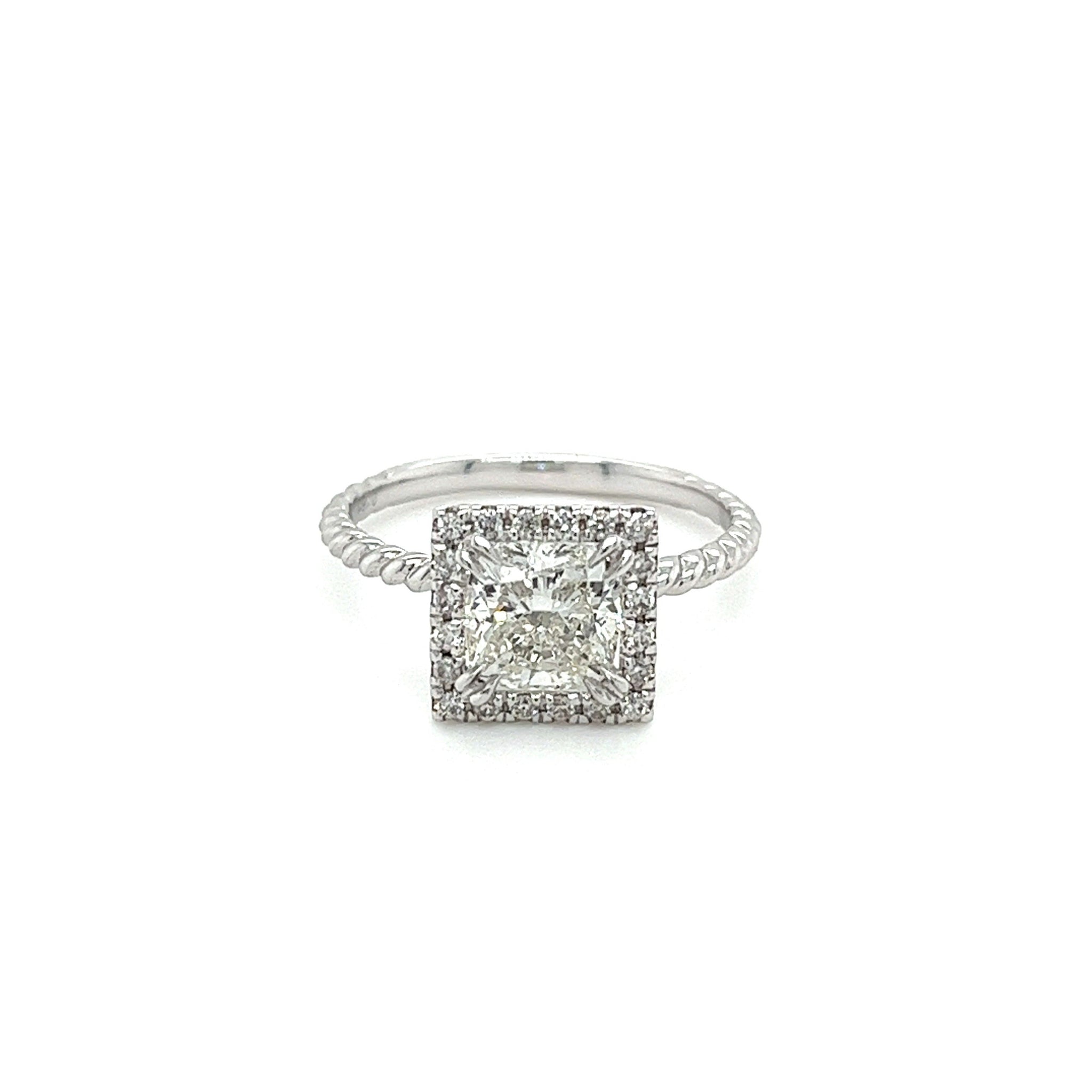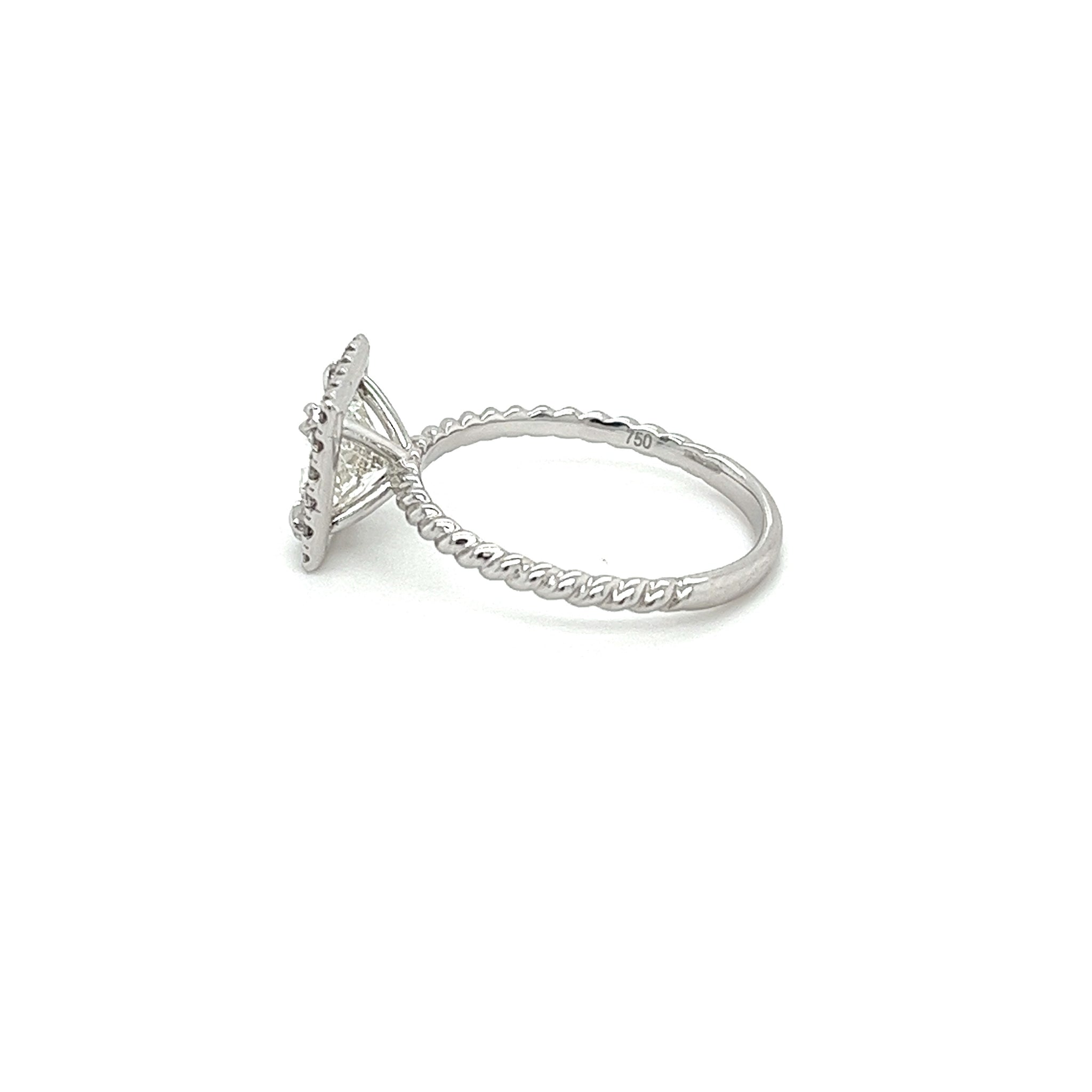 1,50 Karat Prinzessschliff Labor-Diamant-Verlobungsring mit einem runden, quadratisch geformten Diamant-Halo. Eingefasst in 18k Weißgold, präsentiert dieser fesselnde Verlobungsring ein kunstvolles Seilkettendesign am Schaft, das sich elegant krümmt, um einen faszinierenden Kontrast zum scharfen, symmetrischen Prinzessschliff-Mittelstein zu bieten. Mit seiner anspruchsvollen Ausstrahlung und außergewöhnlichen Handwerkskunst ist dieser Ring ein unvergessliches Symbol für Liebe und Engagement, bereit, Herzen über Generationen hinweg zu fesseln.