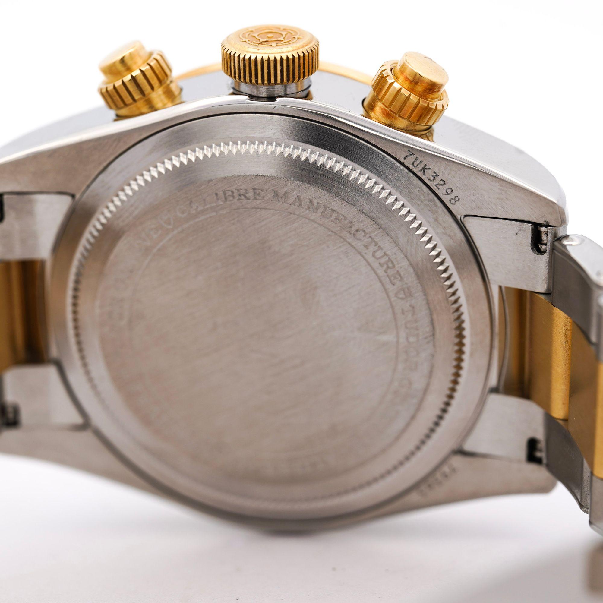 The Tudor Black Bay Chrono Steel and Gold reference 79363N is Tudor's flagship chronograph, pairing the brand's beloved Black Bay sports architecture with 18K yellow gold pushers, crown, bezel frame, and alternating bracelet links — creating a two-tone composition that is as functional as it is visually commanding. The black dial with contrasting champagne gold sub-dials at 3 and 9 o'clock creates a bold panda-style contrast that references racing chronograph design from the 1960s and 1970s, while the red-tipped seconds hand and red water resistance text add subtle but purposeful color accents that animate the dial. The black enamel tachymeter bezel with yellow gold numerals and scale is one of the most distinctive bezel designs in contemporary watchmaking, giving this reference an immediately recognizable identity on the wrist that few sport watches can match.