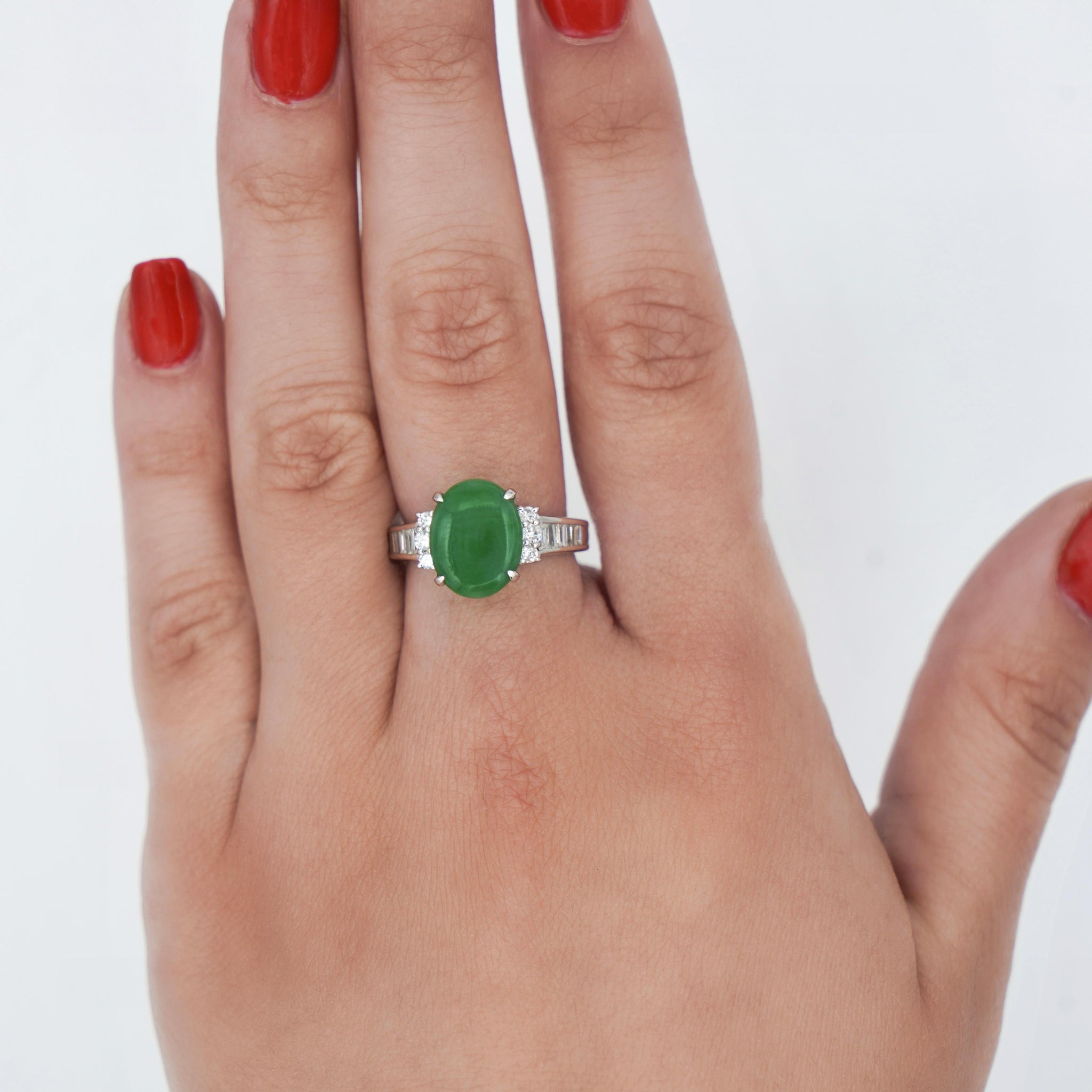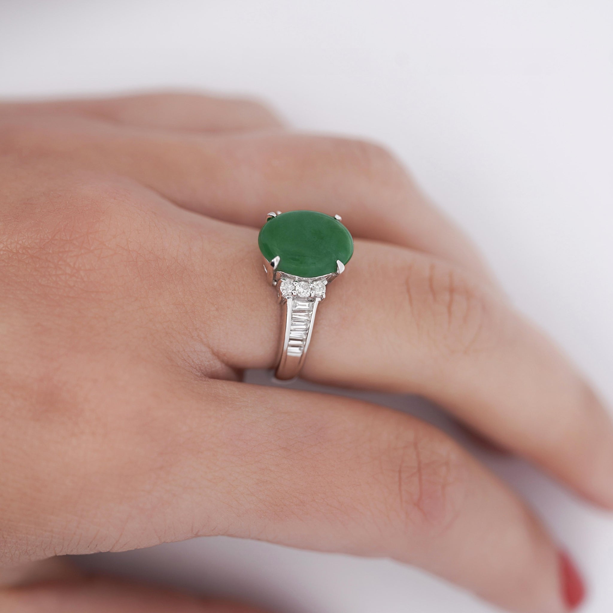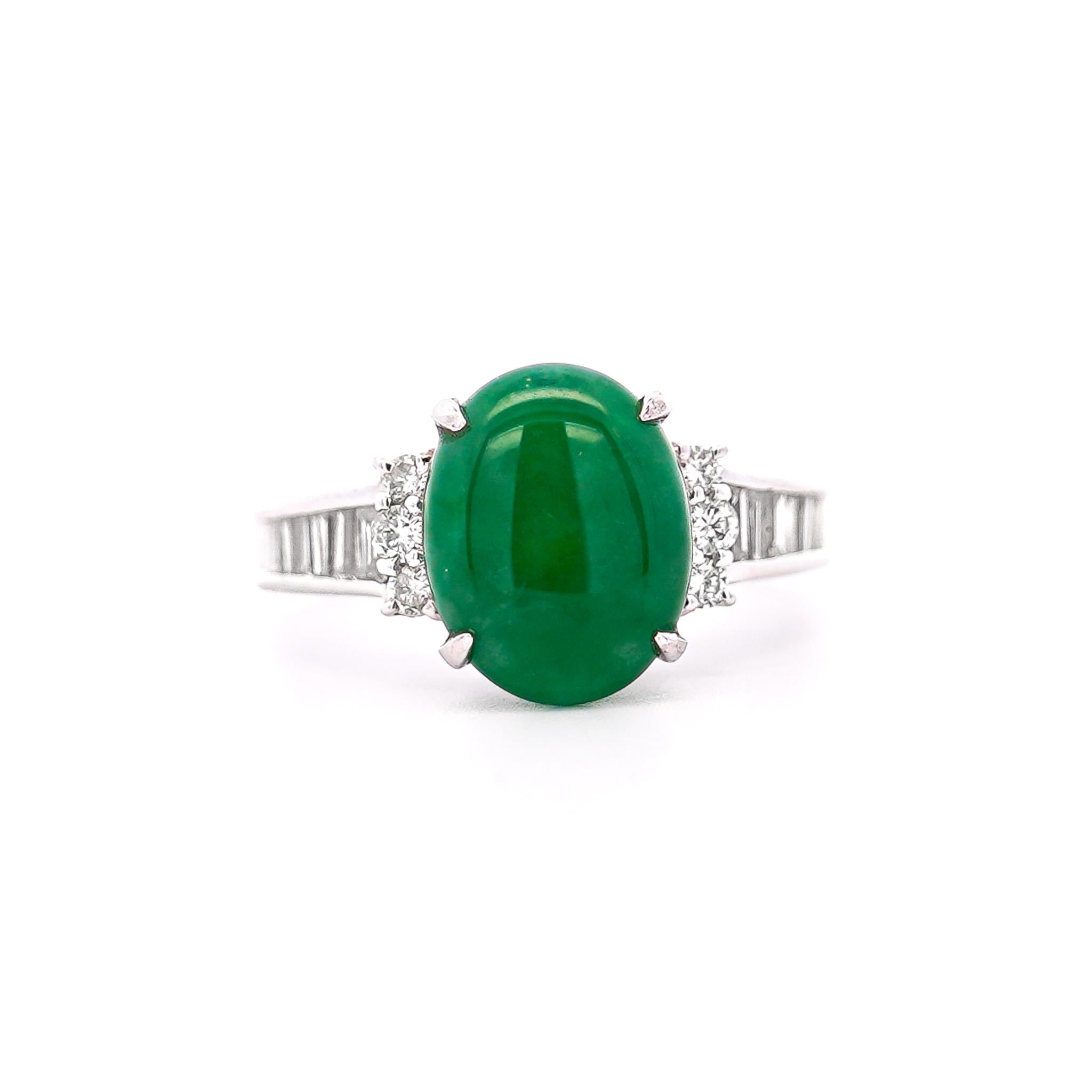 HKJ&S Zertifizierter 4,17 Karat Natürlicher Ovaler Cabochon-Schliff Jadeit Jade Grade A (Fei Cui) und Kanalgefasste Baguette-Diamant-Seitensteine Platin Statement Ring.