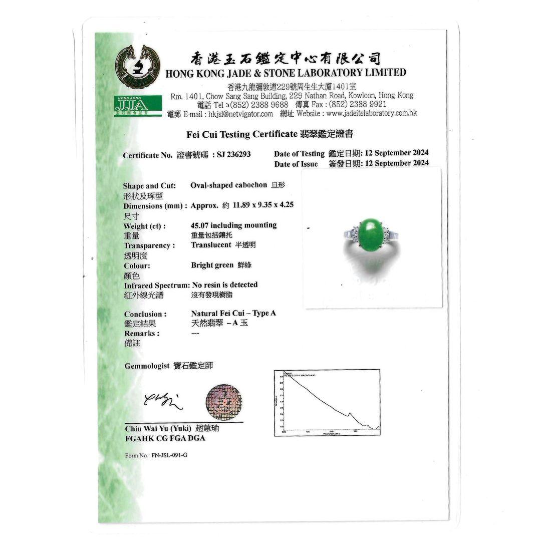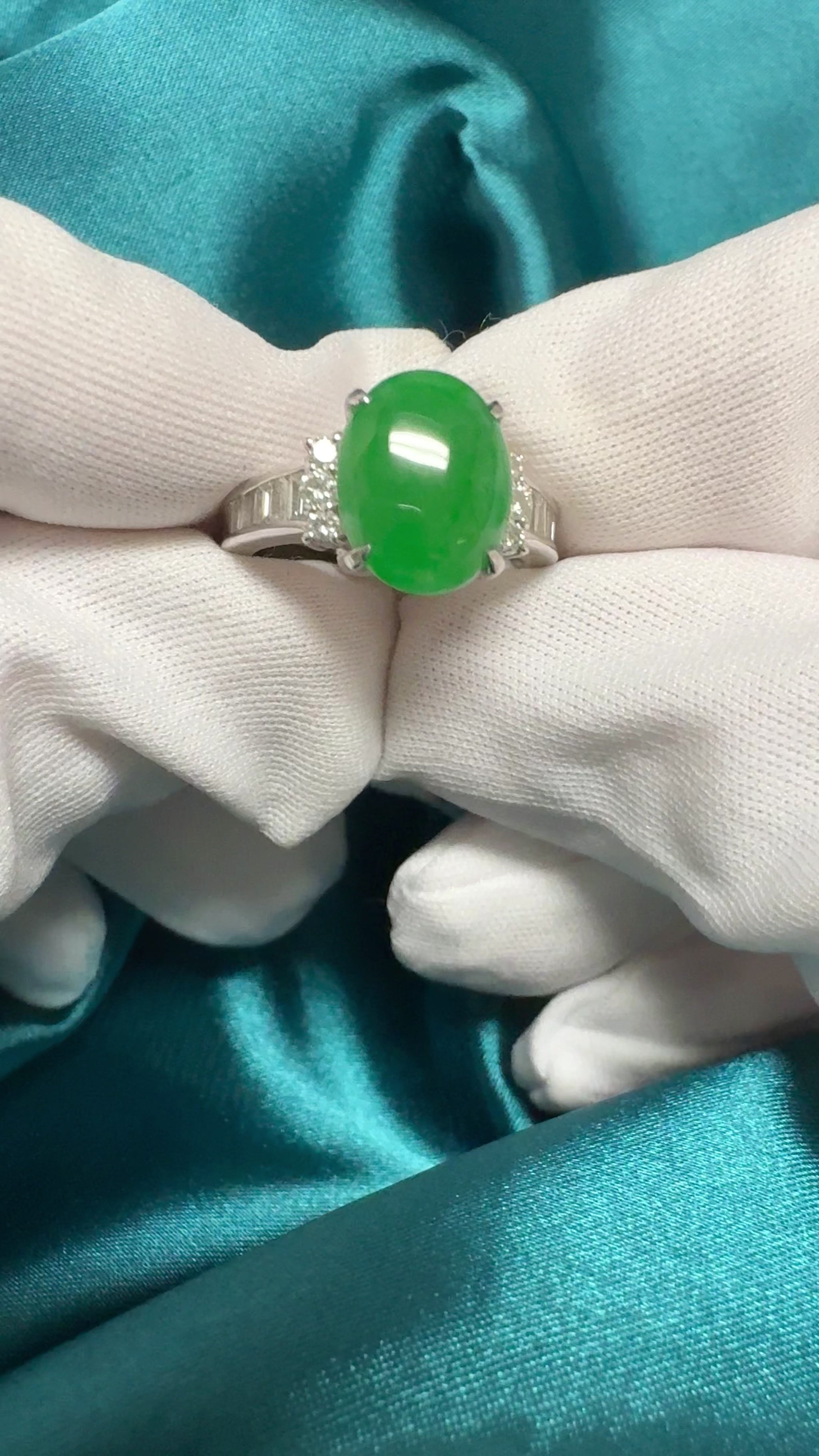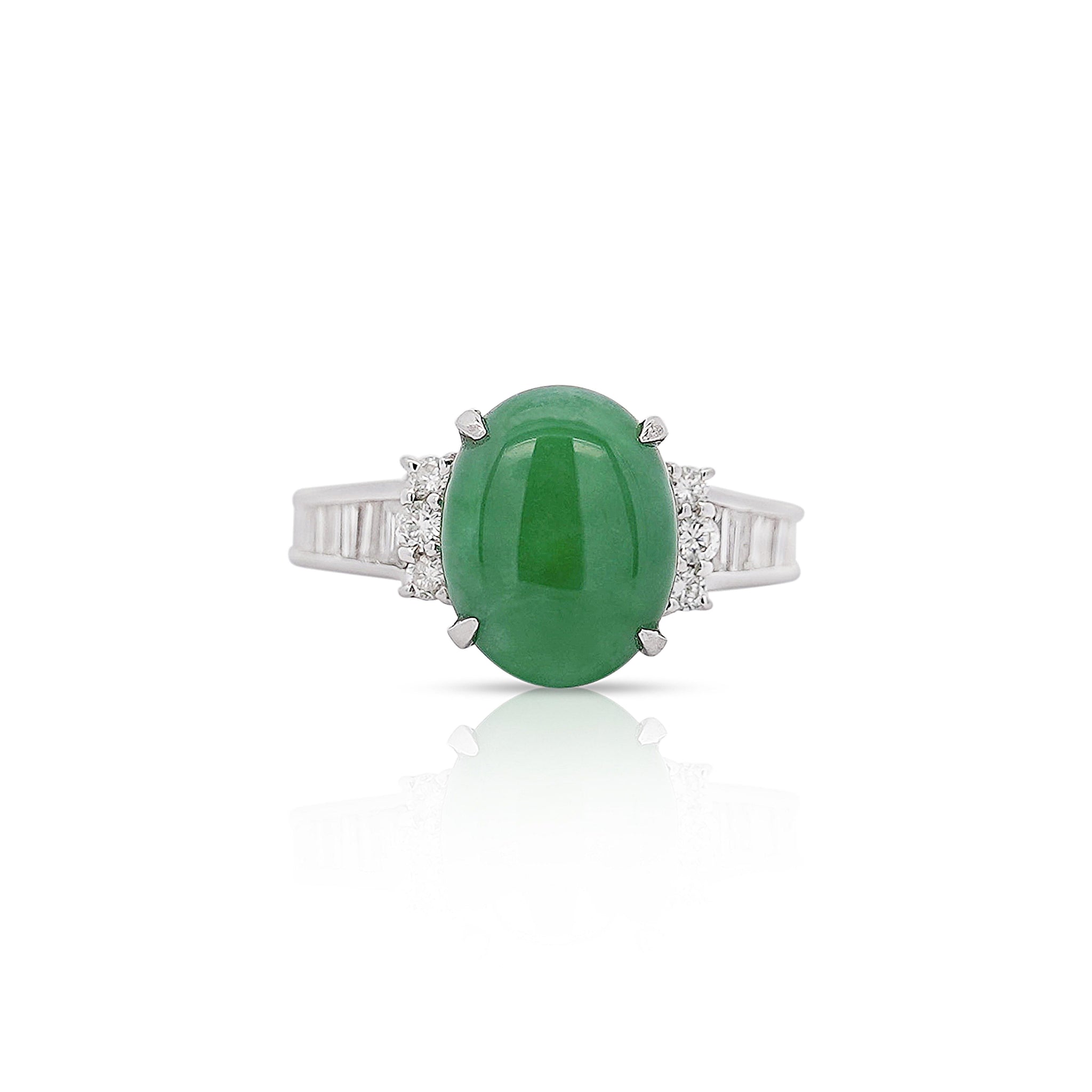HKJ&S Zertifizierter 4,17 Karat Natürlicher Ovaler Cabochon-Schliff Jadeit Jade Grade A (Fei Cui) und Kanalgefasste Baguette-Diamant-Seitensteine Platin Statement Ring.
