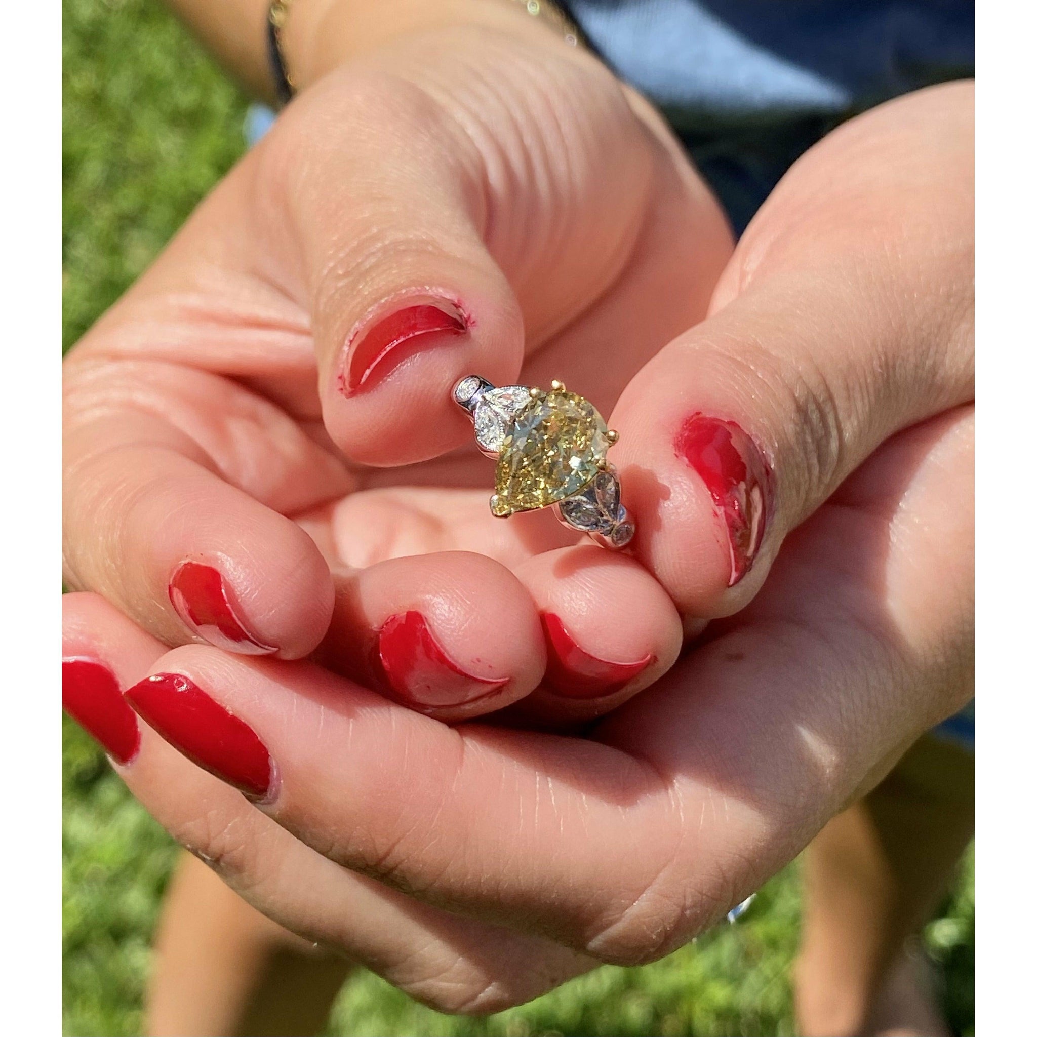 Le presentamos este sorprendentemente hermoso Anillo de compromiso de diamante de color fancy. Es bastante raro encontrar un diamante fancy amarillo en forma de pera y con tal brillo y color intenso. Una piedra central notablemente vibrante que, a simple vista, puede parecer un diamante fancy vivid amarillo. Un verdadero centro de atención.