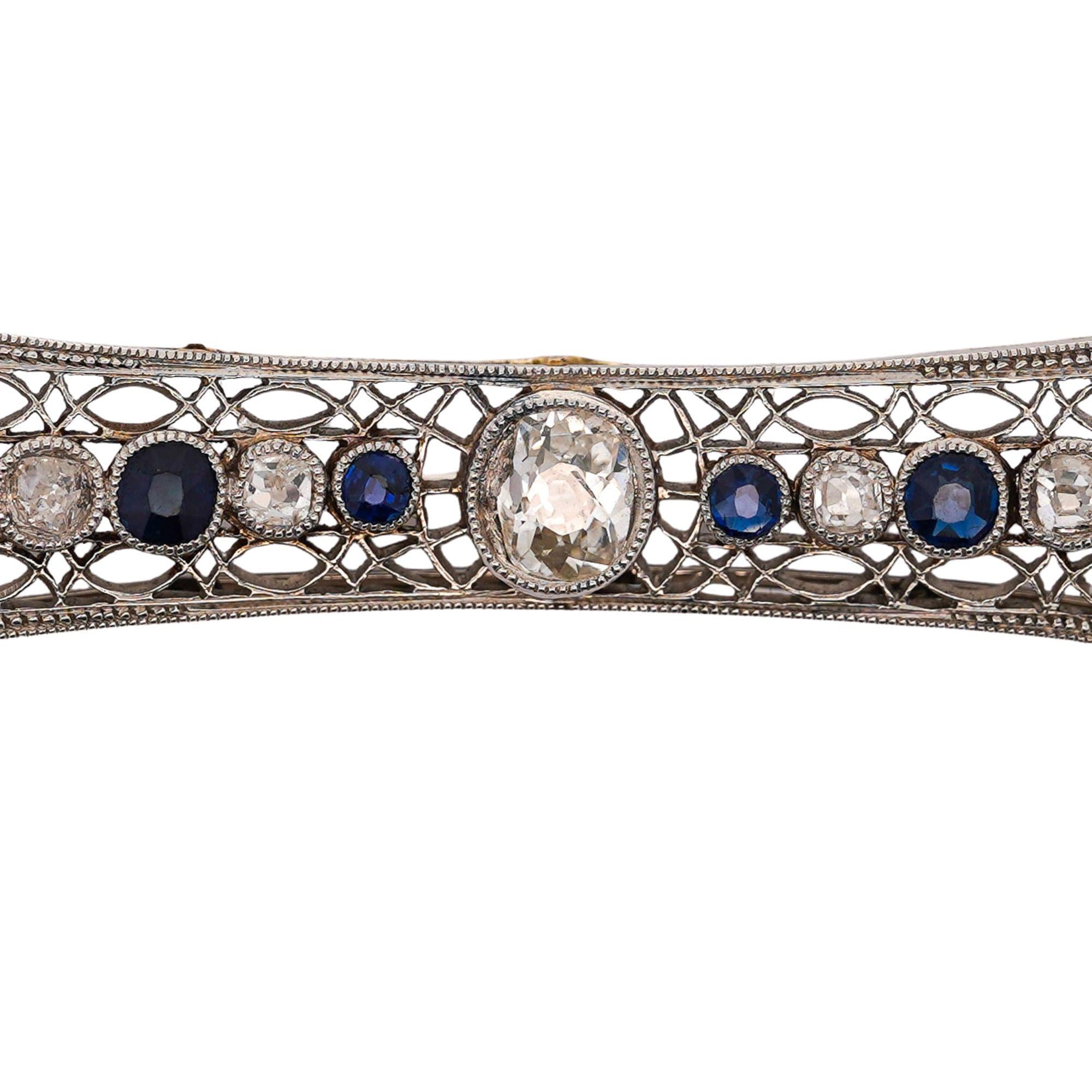 Art Deco jewelry from the 1930s represents the pinnacle of geometric design and technical craftsmanship, featuring clean lines, symmetrical patterns, and exceptional gemstones. The combination of old-cut diamonds with sapphires reflects the era's fascination with color contrast and bold design. Open-work filigree construction demonstrates the meticulous hand-fabrication techniques of the period, making authentic Art Deco pieces increasingly valuable as both wearable art and historical artifacts.