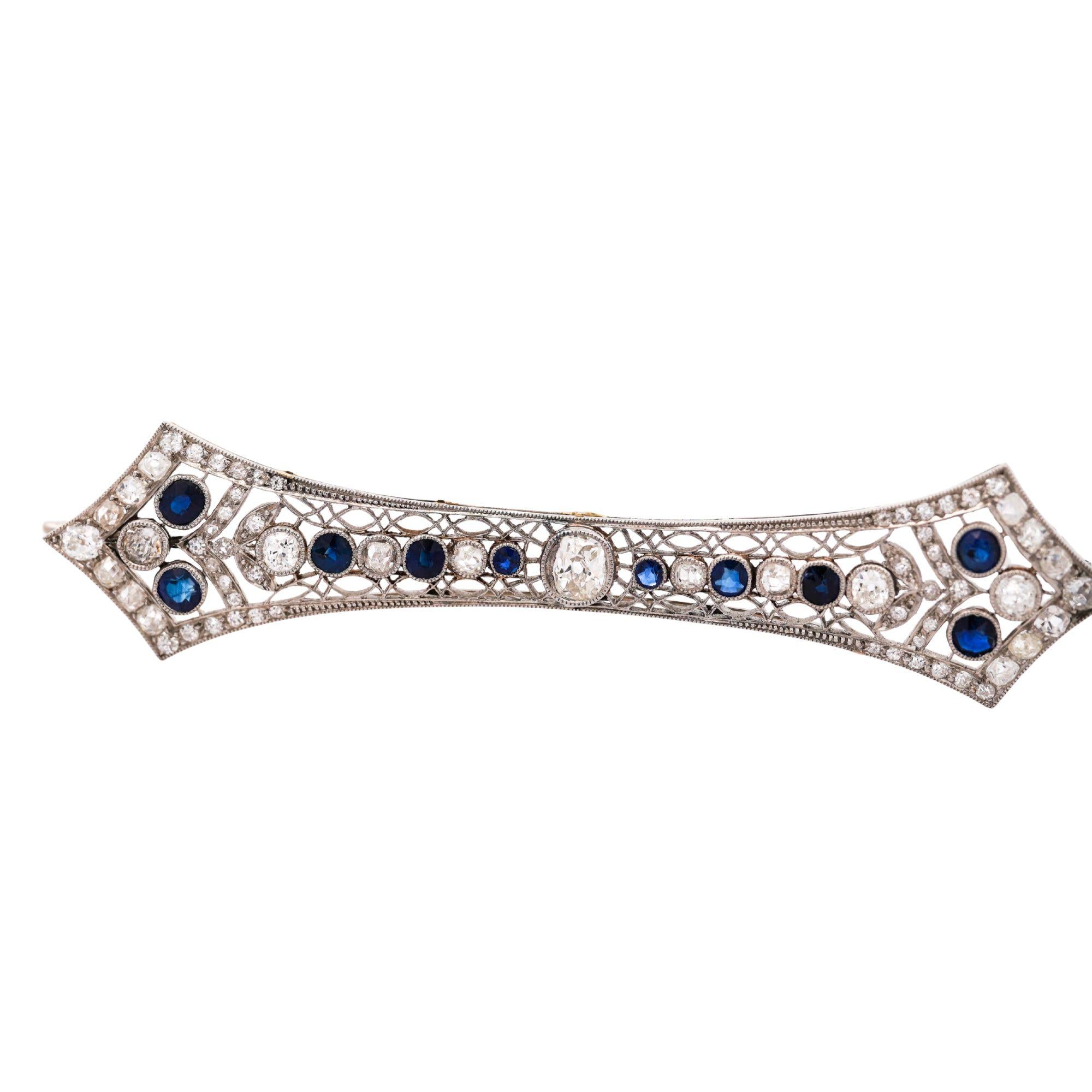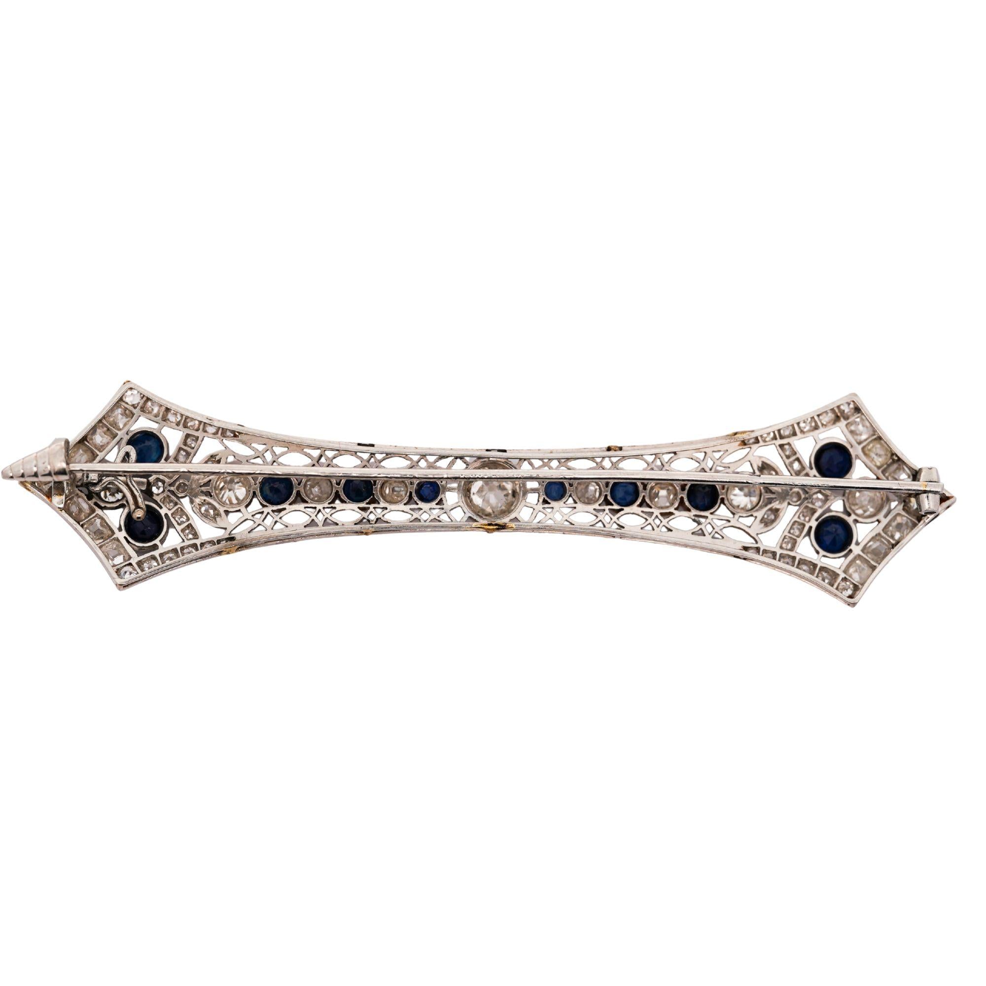 Art Deco diamond and sapphire brooch in 18K white gold featuring 4.00 carats of old mine and old European cut diamonds with approx. 2 carats of sapphires. Elaborate open-work design measures 3.4 x 0.77 inches, weighs 14.29 grams, and dates to 1930.