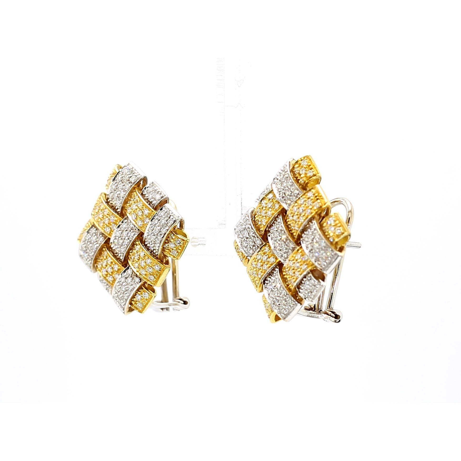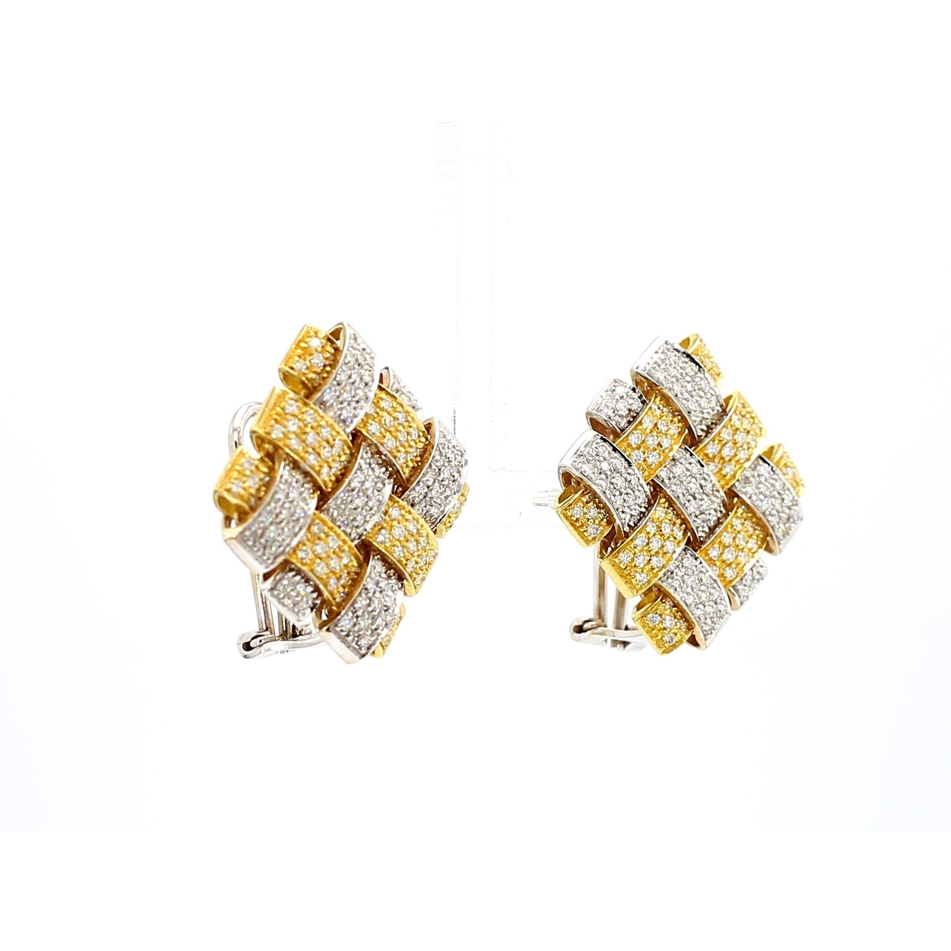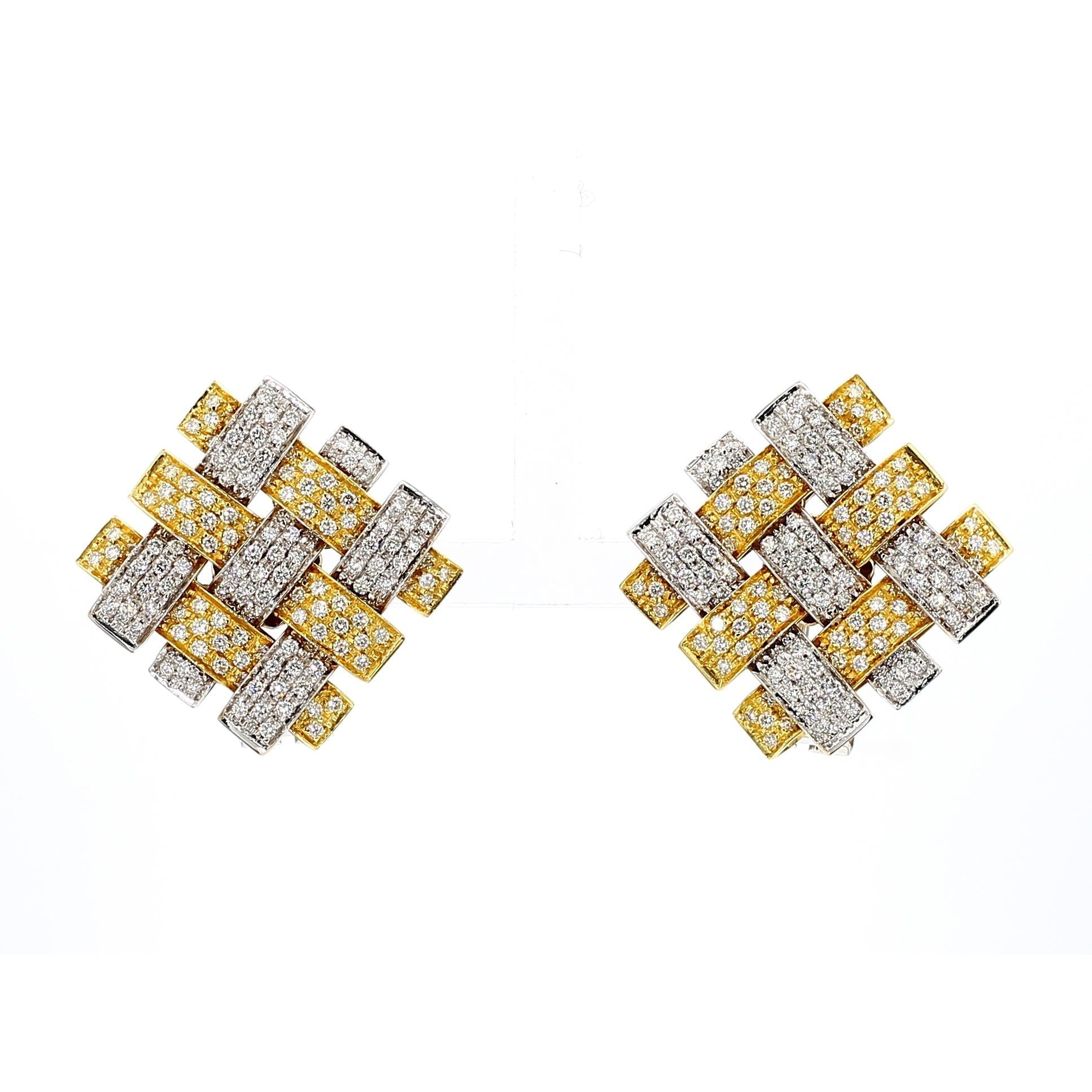 Interlocking rectangular bars create an architectural basket-weave pattern with three-dimensional depth and visual complexity that changes appearance from every viewing angle. Alternating 18K yellow and white gold bars provide color contrast while micro-pave diamonds cover every surface with brilliant sparkle totaling 3.5 carats across both earrings. The geometric arrangement creates negative space between the woven elements, enhancing the sculptural quality and reducing visual weight despite substantial gold content. Each 23mm square earring features leverback clip-on closures that provide secure wear without requiring pierced ears. The signed Garavelli craftsmanship ensures meticulous execution with precisely aligned pavé setting and seamless joins between two-tone gold elements.