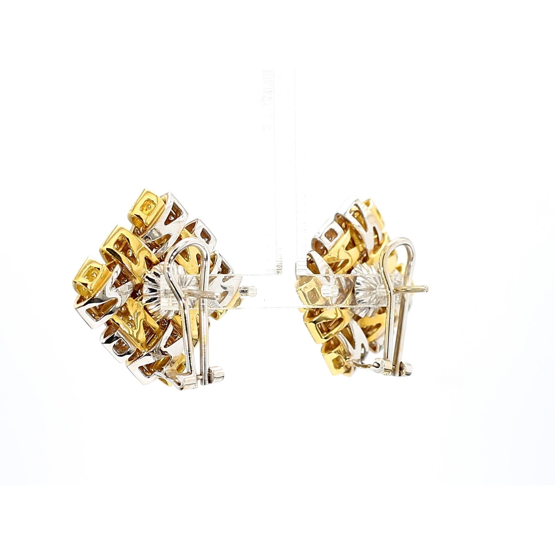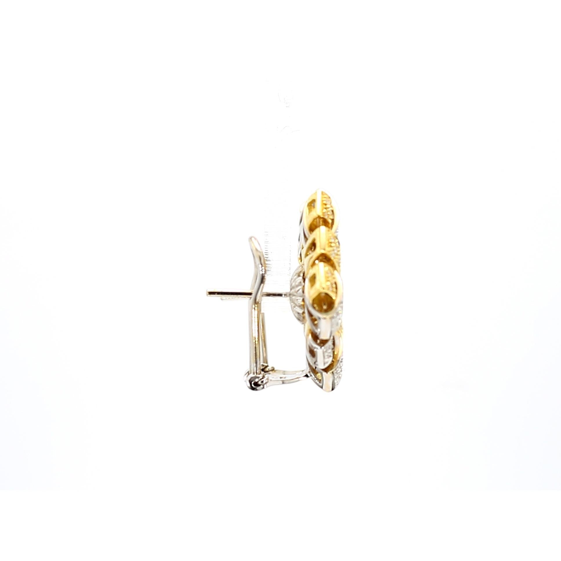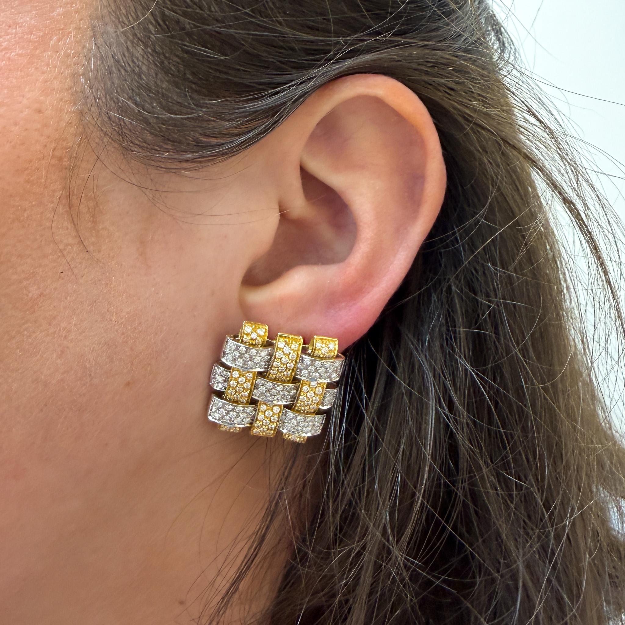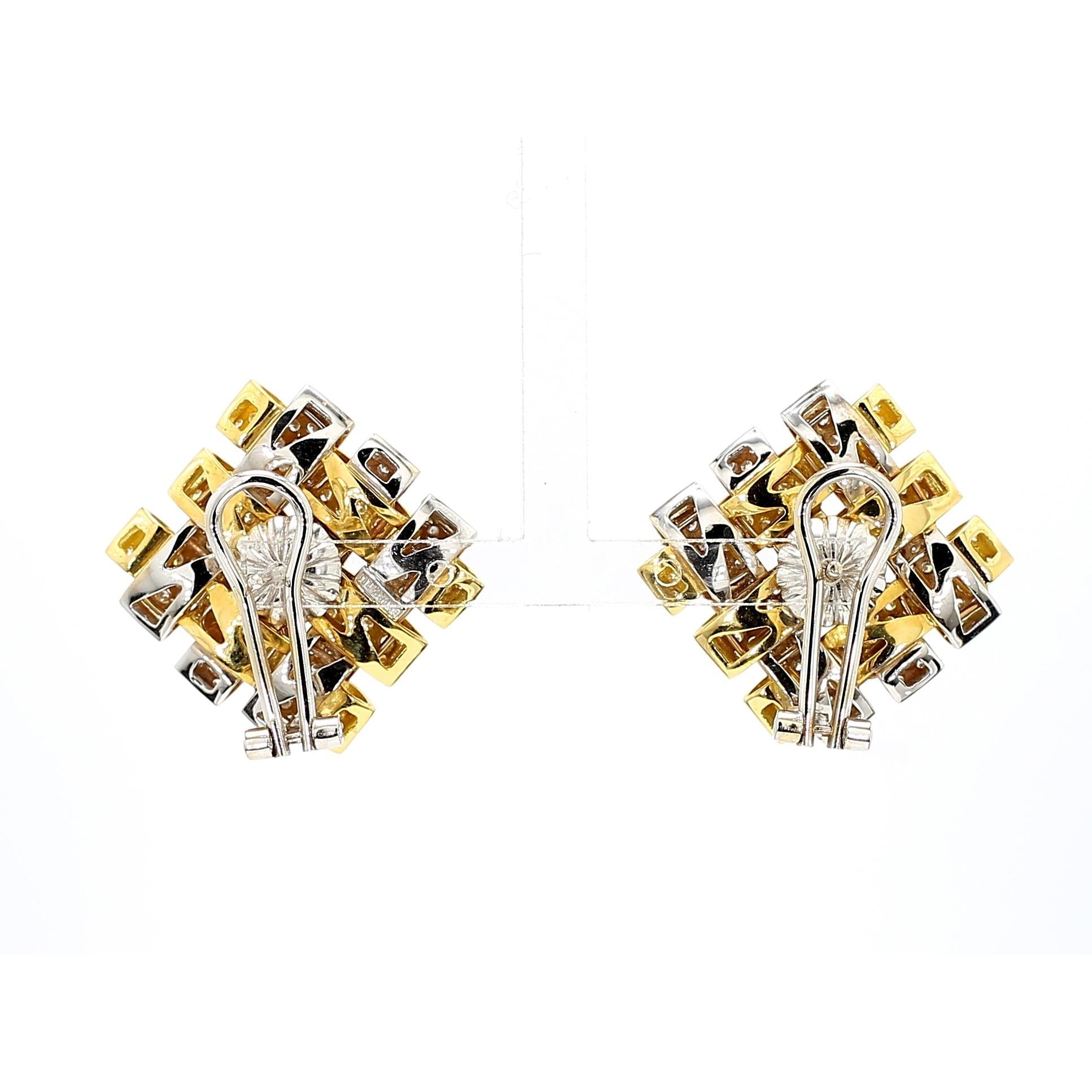 Interlocking rectangular bars create an architectural basket-weave pattern with three-dimensional depth and visual complexity that changes appearance from every viewing angle. Alternating 18K yellow and white gold bars provide color contrast while micro-pave diamonds cover every surface with brilliant sparkle totaling 3.5 carats across both earrings. The geometric arrangement creates negative space between the woven elements, enhancing the sculptural quality and reducing visual weight despite substantial gold content. Each 23mm square earring features leverback clip-on closures that provide secure wear without requiring pierced ears. The signed Garavelli craftsmanship ensures meticulous execution with precisely aligned pavé setting and seamless joins between two-tone gold elements.