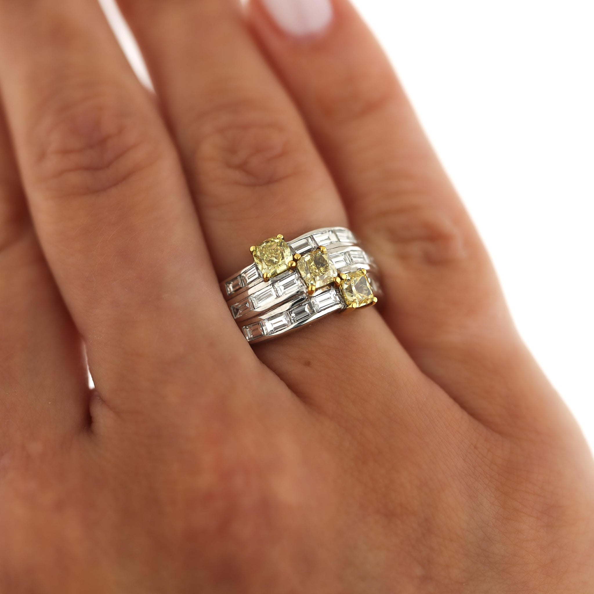 The three IGI-certified fancy colored cushion diamonds — totaling 1.31 carats — represent some of the most sought-after color designations in the natural diamond market: fancy intense deep yellow and fancy intense deep greenish yellow are high-saturation grades that appear in only a tiny fraction of all mined fancy colored diamonds. The cushion cut is ideally suited for maximizing color saturation in fancy colored diamonds, as its broad facet structure concentrates and deepens the color display more effectively than brilliant cuts. The subtle variation between the two fancy intense deep yellow stones and the one fancy intense deep greenish yellow stone creates a sophisticated tonal play within the trio that rewards close observation. The 1.27 carats of white baguette diamonds flanking the colored stones provide the perfect neutral counterpoint, their colorless brilliance amplifying the warmth and intensity of the fancy color centers.