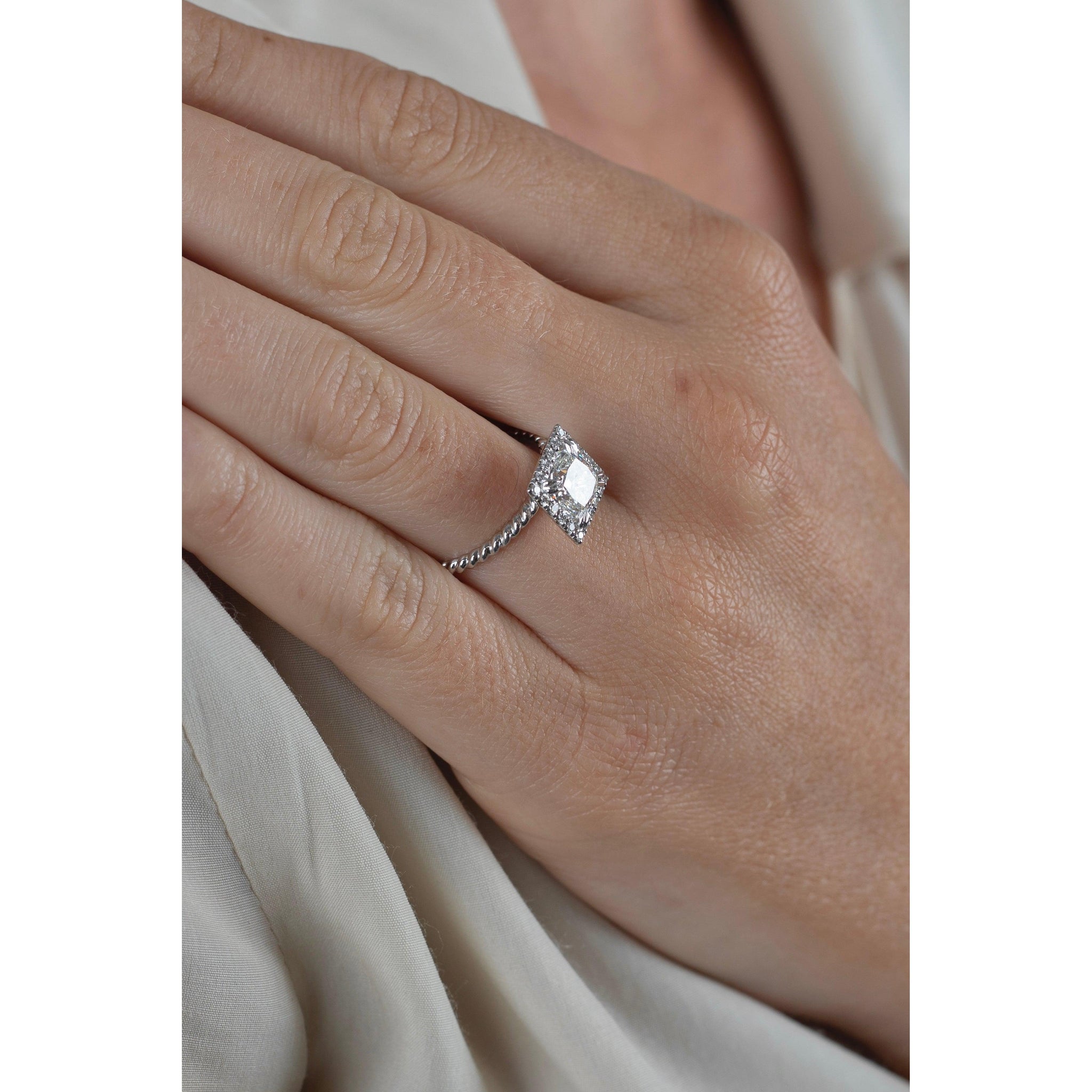 1.60 carat princess cut lab-grown diamond engagement ring with a round cut square-shaped diamond halo. Set in 18k white gold, this captivating engagement ring showcases an artful rope chain design shank, gracefully curved to provide a fascinating contrast to the sharp, symmetrical princess-cut center stone. With its sophisticated allure and exceptional craftsmanship, this ring is an unforgettable symbol of love and commitment, poised to captivate hearts for generations.