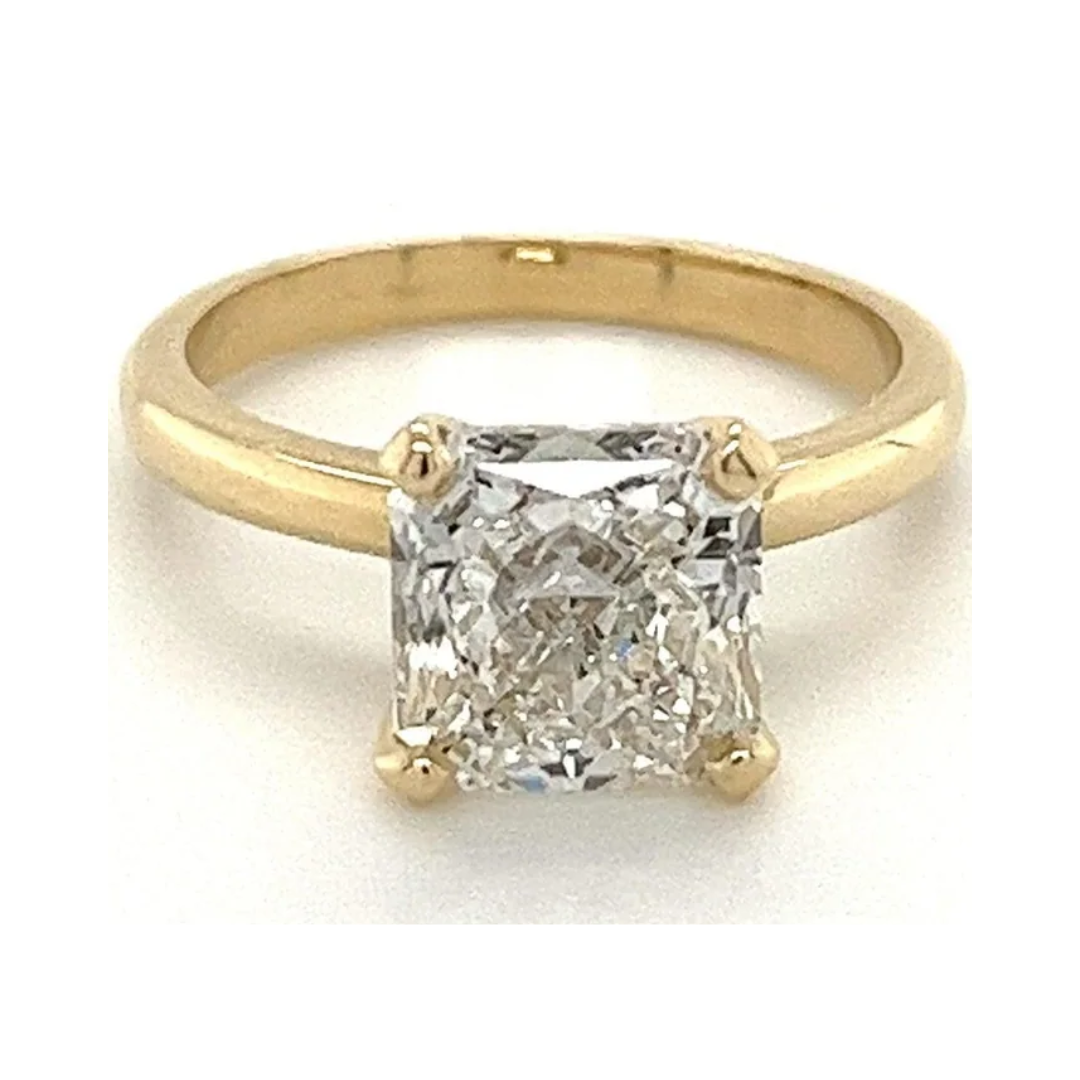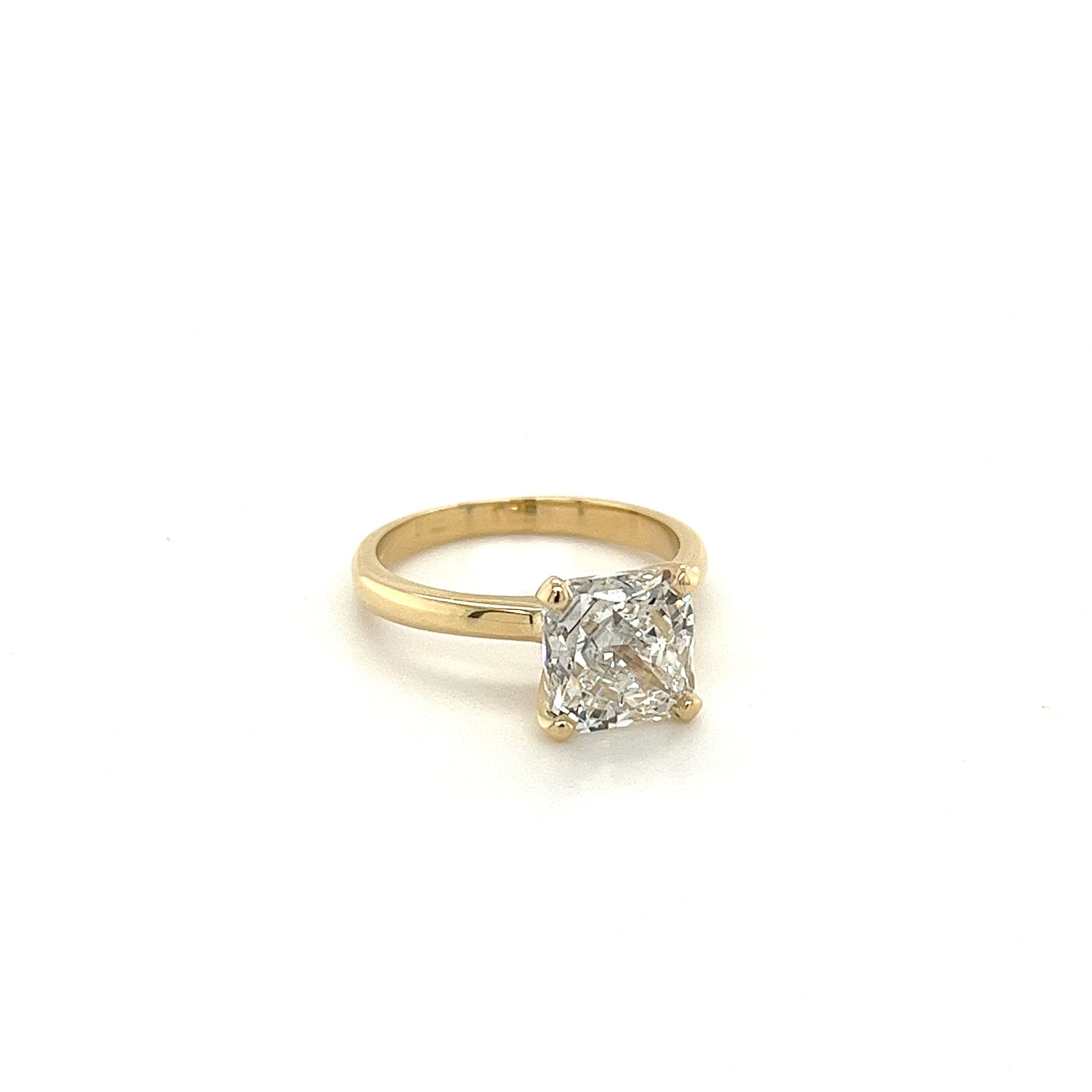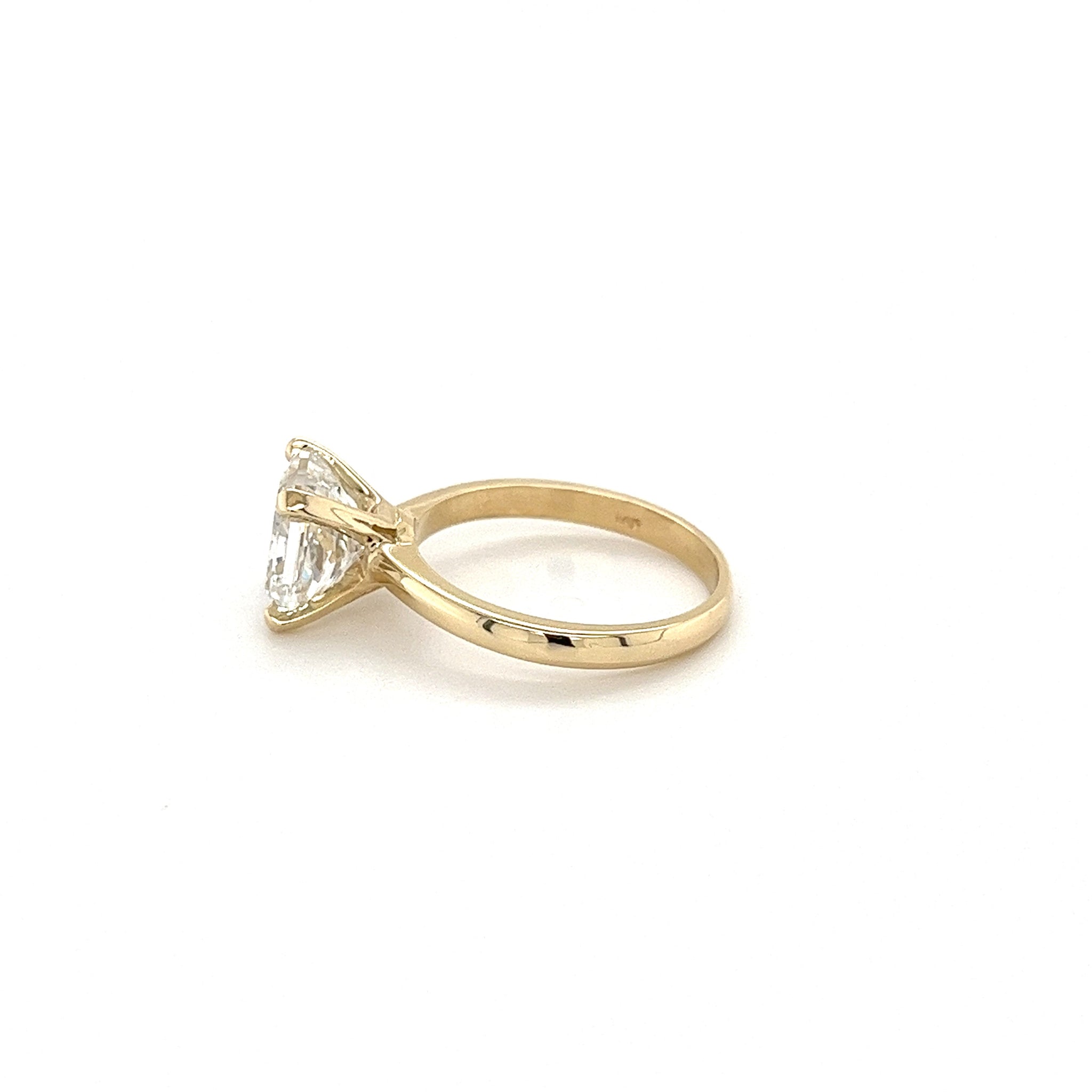 3,12 carats Coussin taillé diamant de laboratoire serti dans une Bague solitaire en or jaune 14k. La pierre centrale porte la majorité de son poids en carats en hauteur et en largeur, ce qui signifie que la taille et le poids de la pierre sont très présents optiquement. Contrairement à une pierre avec plus de profondeur.
