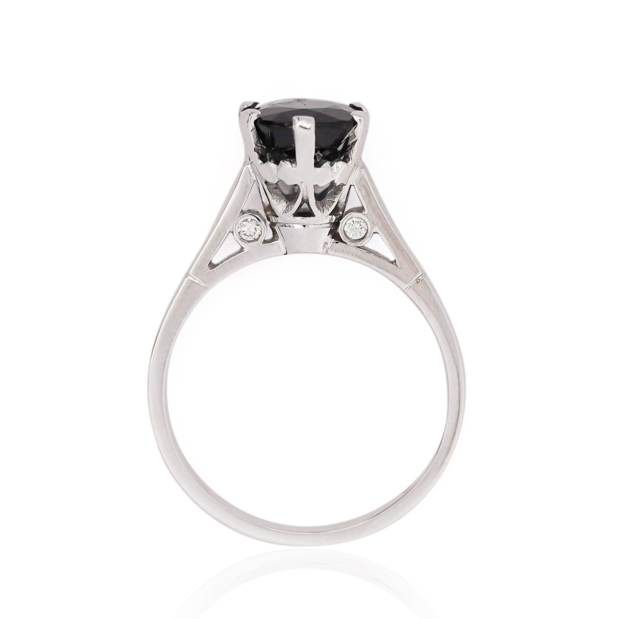 Natural blue sapphire solitaire engagement ring featuring a 1.80 carat oval-cut sapphire in six-prong basket setting with heart-shaped filigree details and two diamond accents in 14K white gold. Size 6, adjustable, weighing 3.05 grams total.