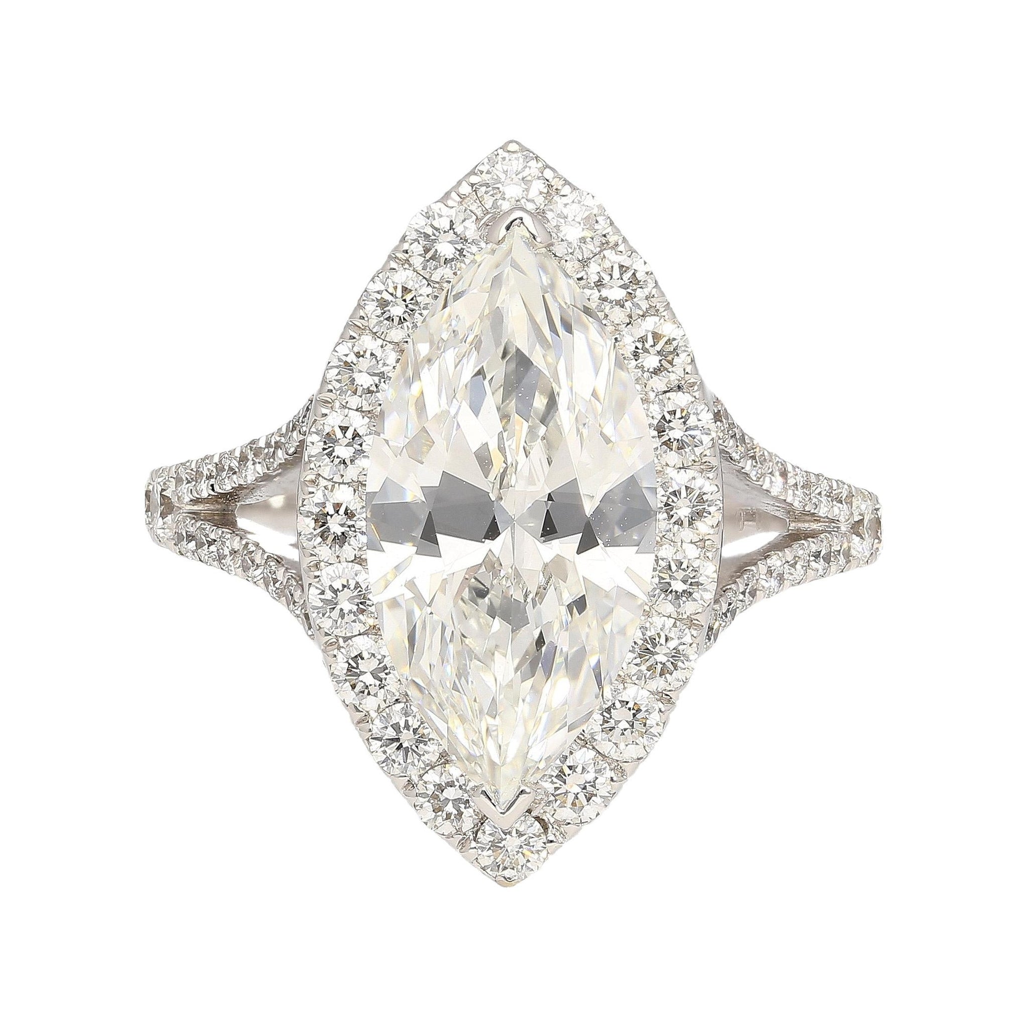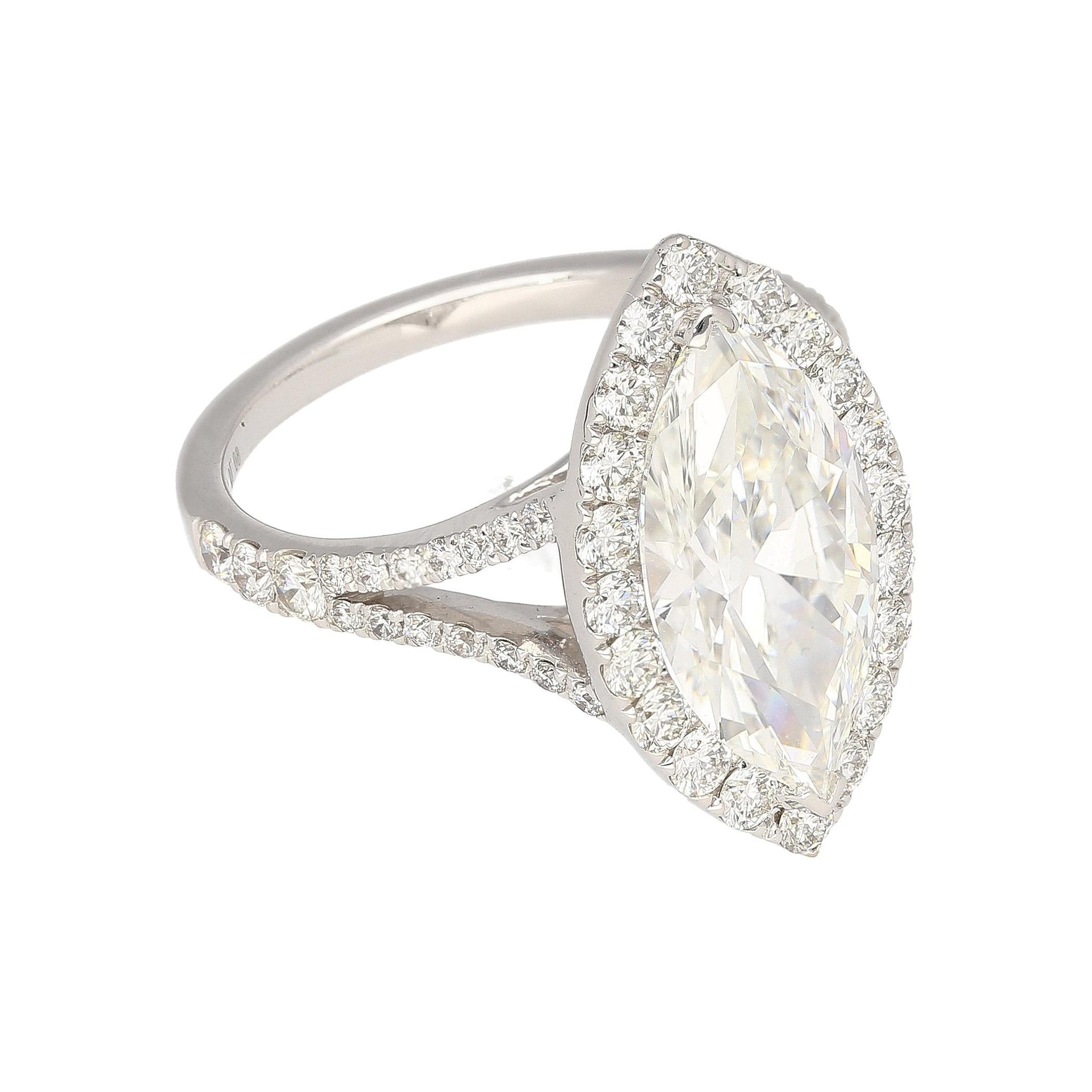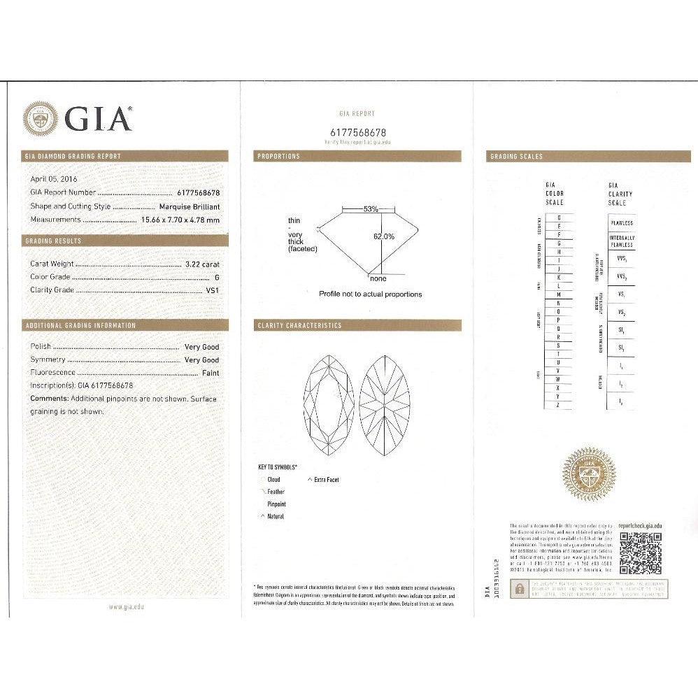 Discover timeless elegance with this GIA Certified 3.22 Carat Marquise Cut Diamond Halo and Pave Ring. Set in 18K White Gold, the centerpiece is a captivating G color, VS1 clarity marquise-cut diamond, certified by GIA with Certificate #6177568678. It is accentuated by a halo and pave setting featuring 62 round-brilliant cut diamonds totaling 1.09 carats. Weighing 4.25 grams and sized at 6, this exquisite ring seamlessly blends classic charm with modern allure, making it a cherished addition to your jewelry collection.