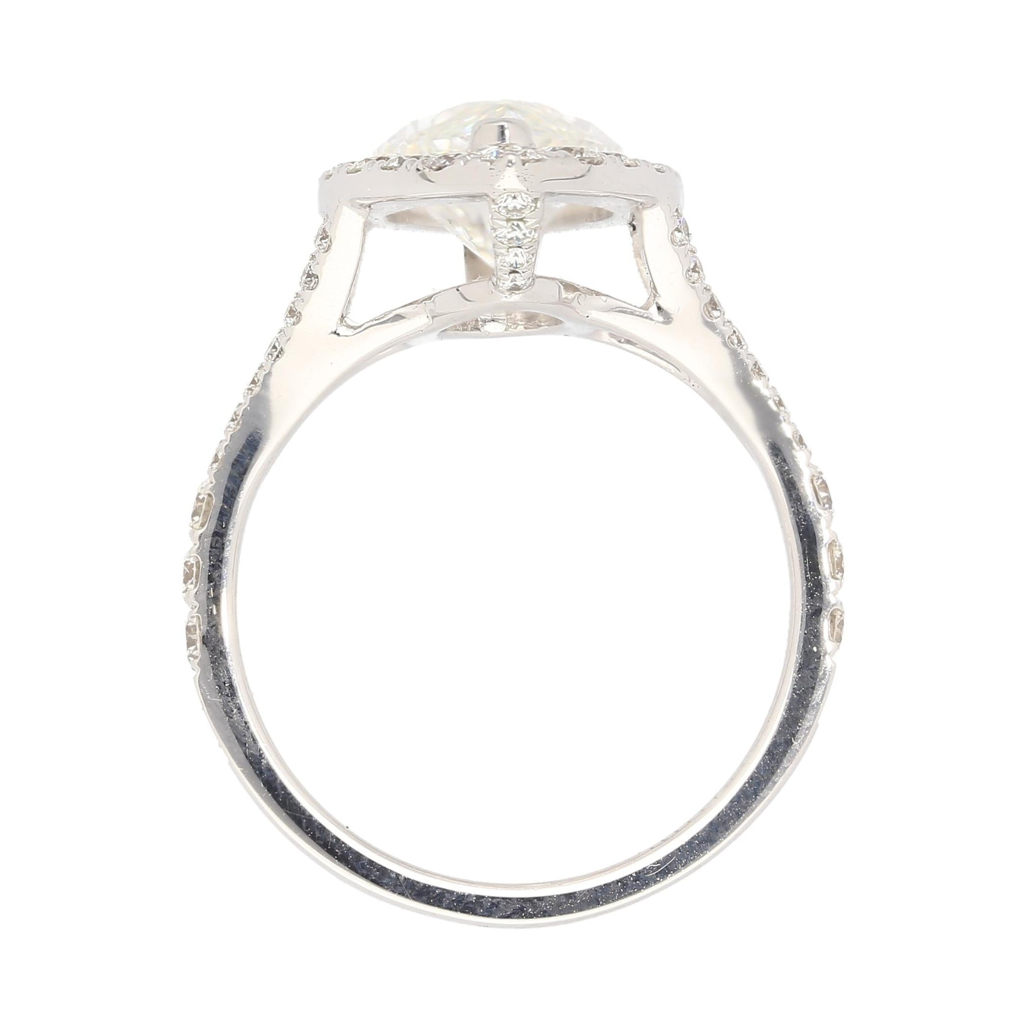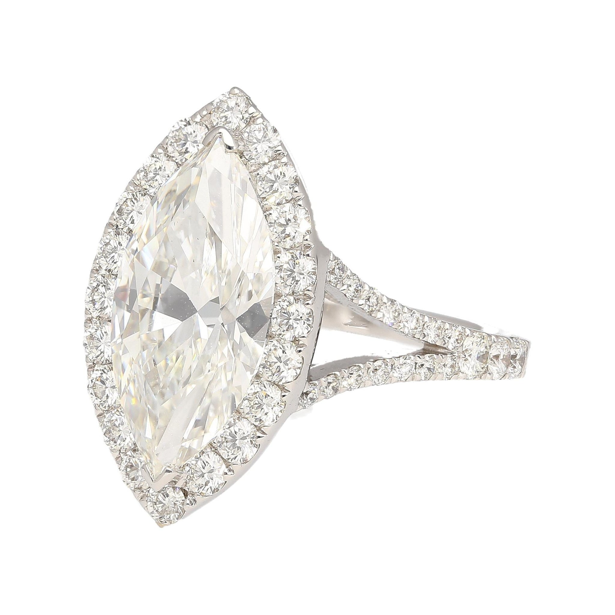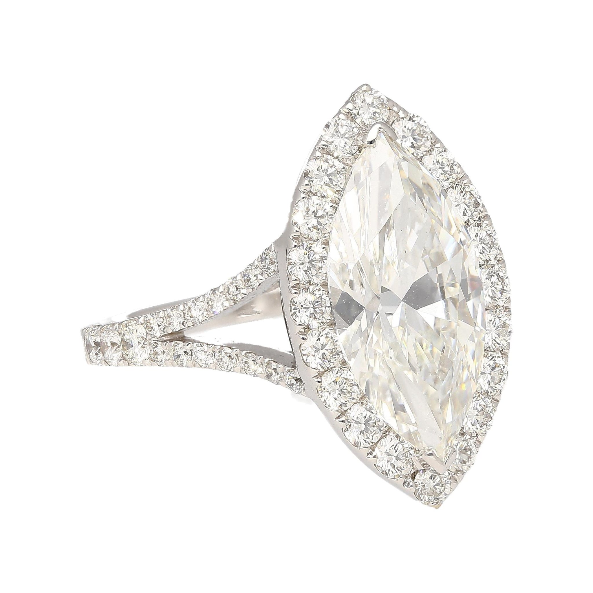 Discover timeless elegance with this GIA Certified 3.22 Carat Marquise Cut Diamond Halo and Pave Ring. Set in 18K White Gold, the centerpiece is a captivating G color, VS1 clarity marquise-cut diamond, certified by GIA with Certificate #6177568678. It is accentuated by a halo and pave setting featuring 62 round-brilliant cut diamonds totaling 1.09 carats. Weighing 4.25 grams and sized at 6, this exquisite ring seamlessly blends classic charm with modern allure, making it a cherished addition to your jewelry collection.