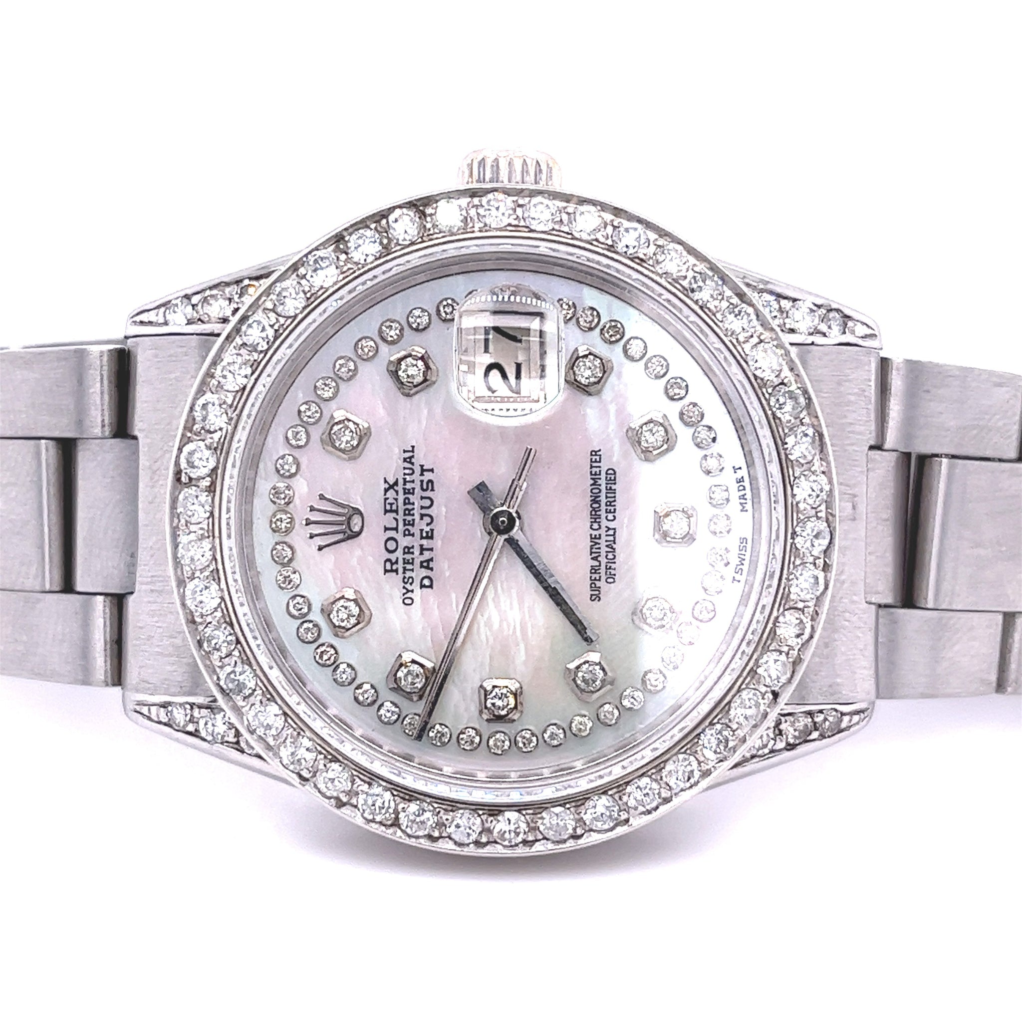 36mm Rolex DateJust with Mother of Pearl dial and Rolex Factory Diamond hour markers. Stainless steel Oyster band with hidden fold over closure. A unique twist on a timeless classic. This watch separates itself from other DateJust models with its breathtaking mother of pearl dial and Rolex Factory Diamond Hour Markers. Not to mention about 4 carats in VS clarity diamonds on the bezel.