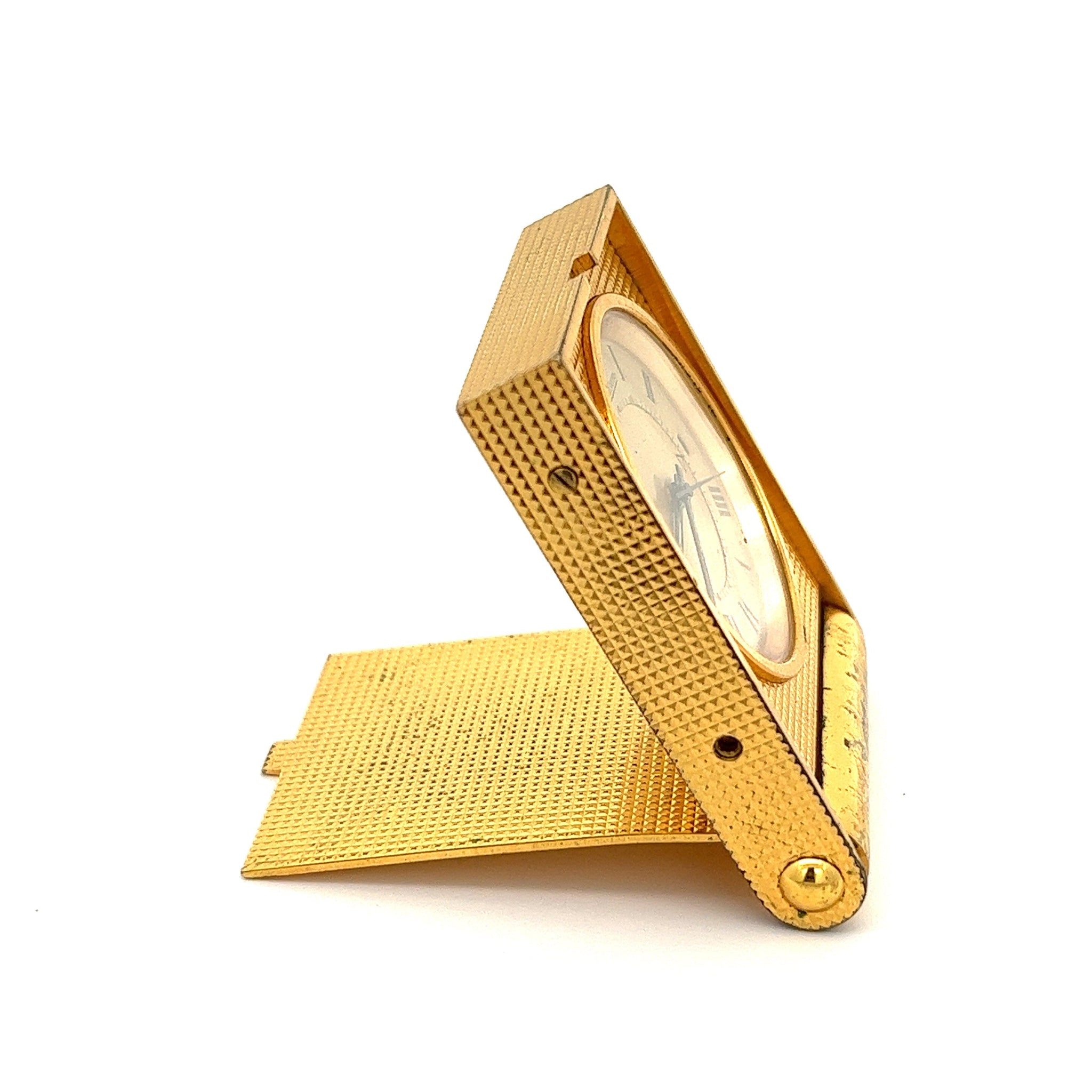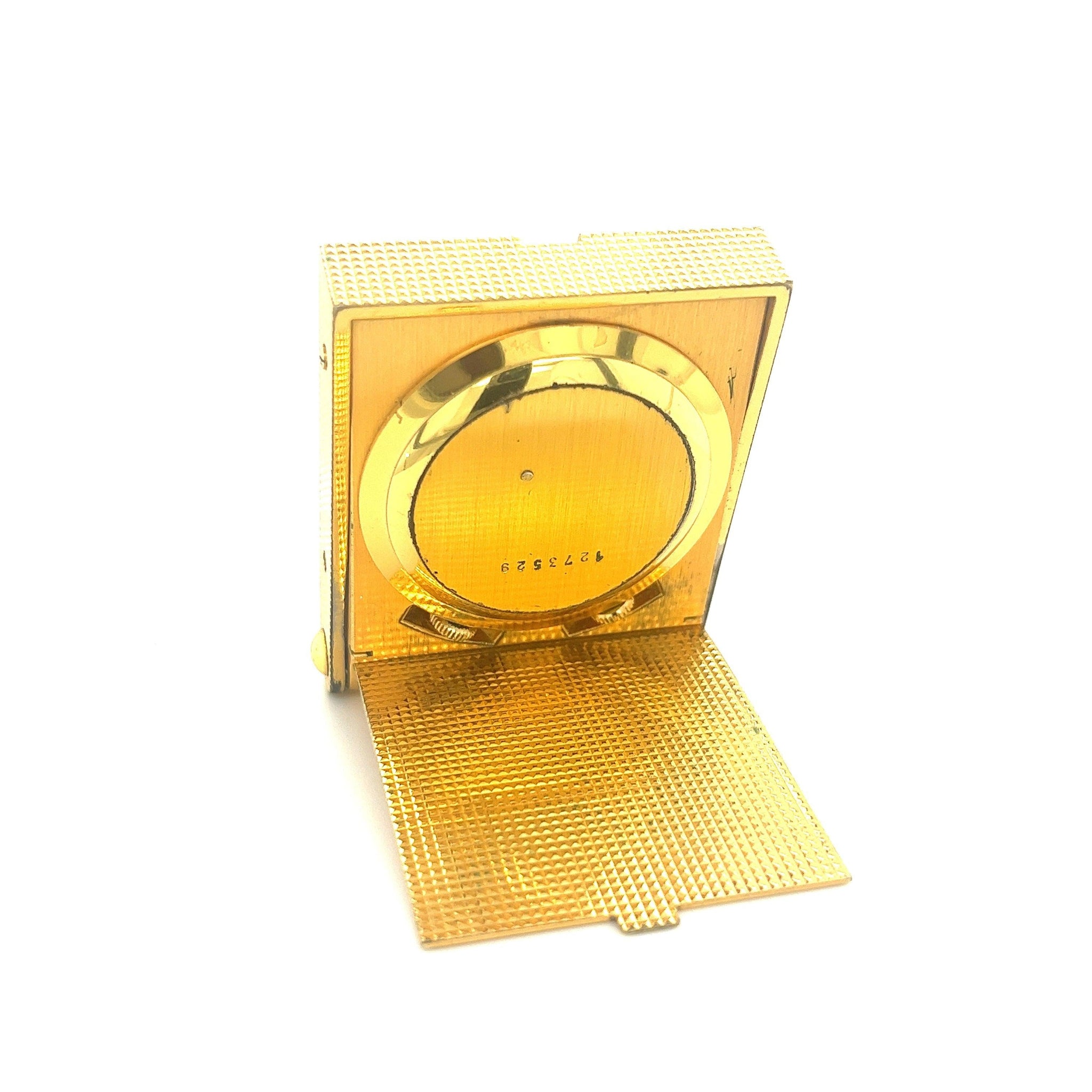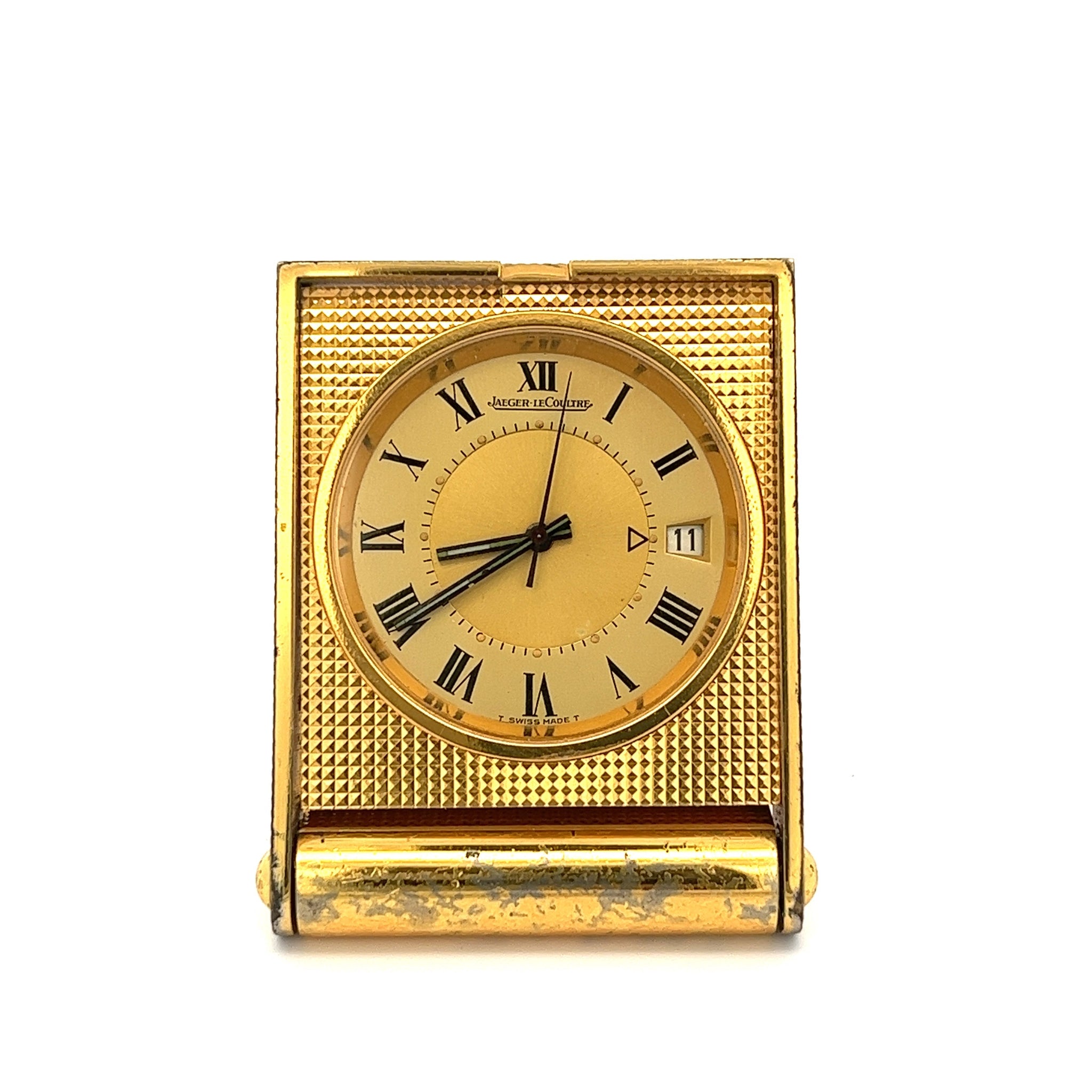 Vintage Jaeger-LeCoultre standing pocket watch in gold vermeil overlay. Manual wind roman numeral dial and date function. 98.5 gram gross weight. Watch in working condition. Textured case that opens and closes. Dial in perfect condition. Exterior and case back with visible wear marks. Missing one screw. Movement has not been inspected.