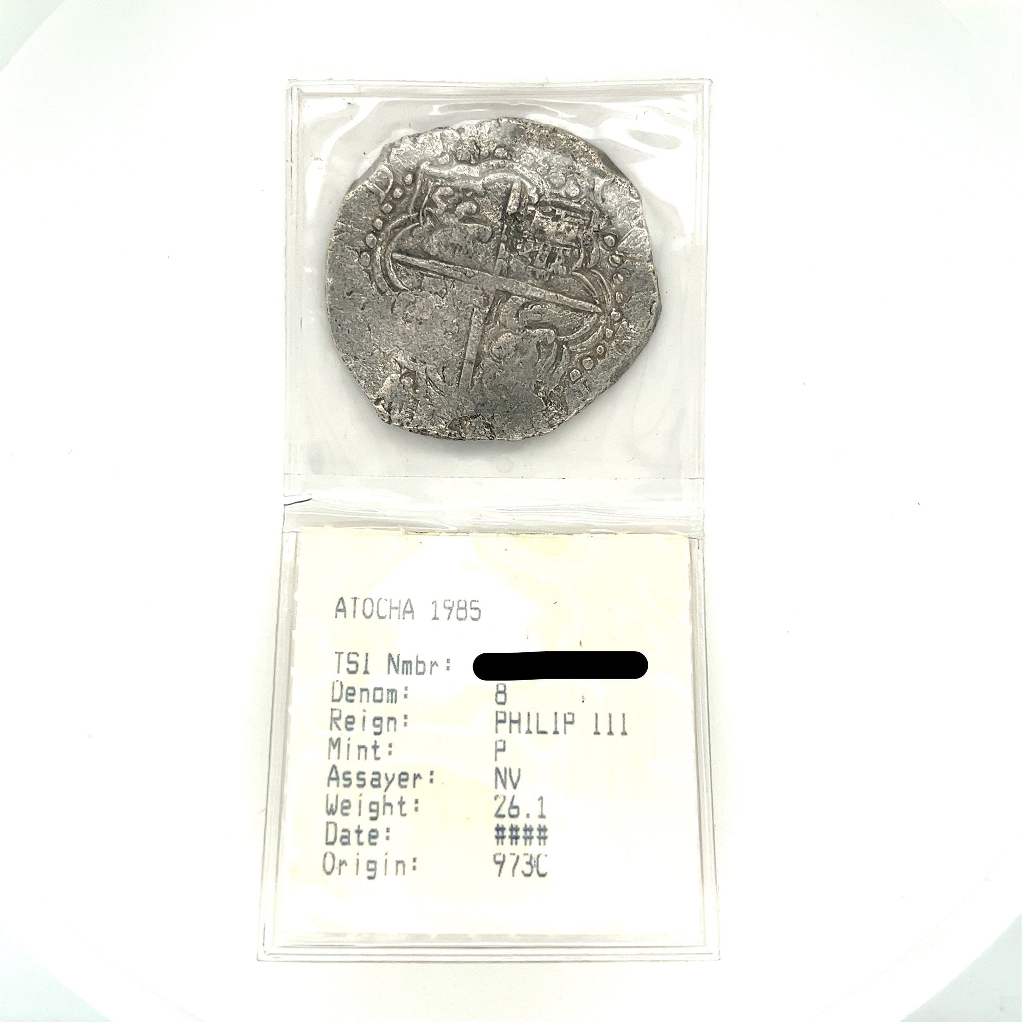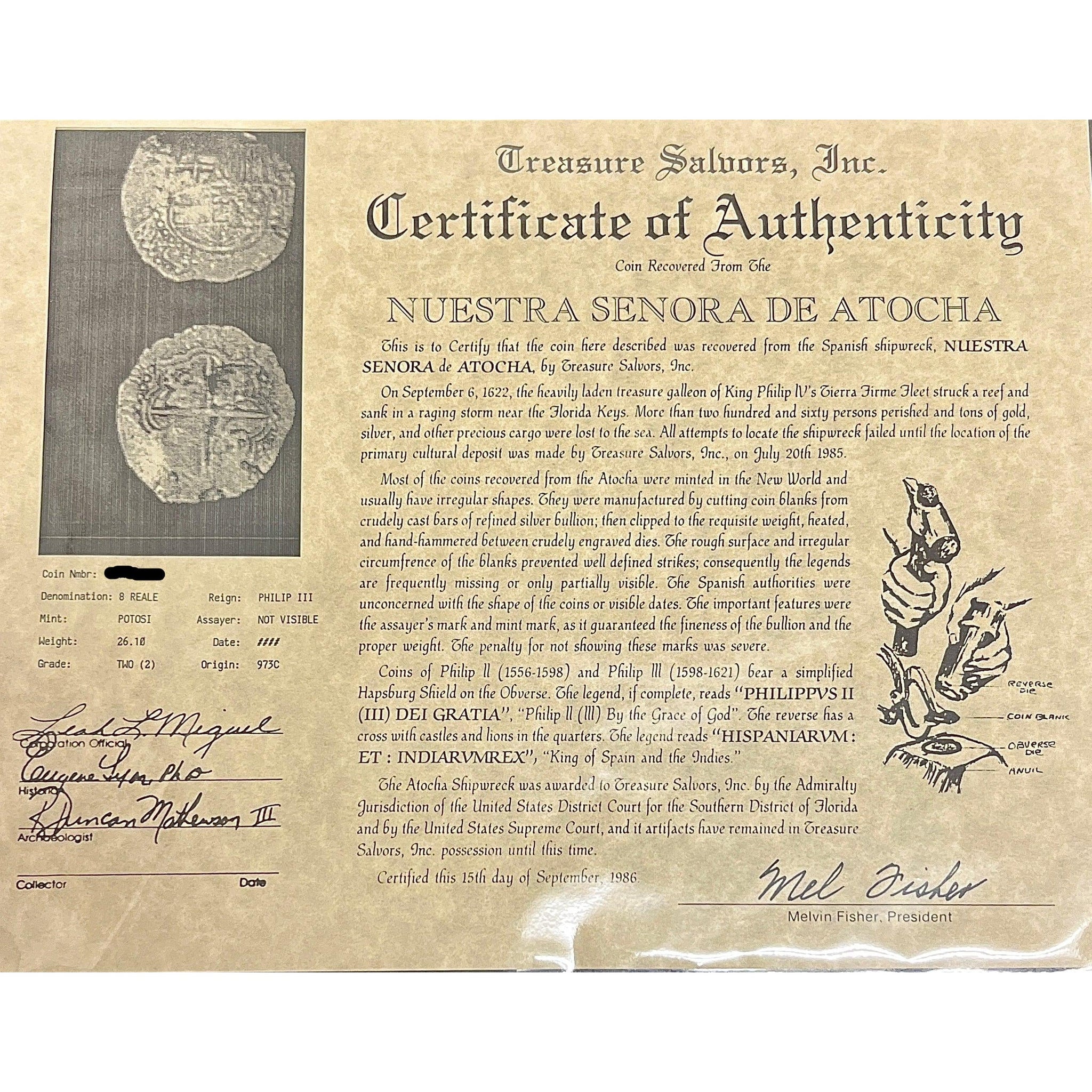 Original authentic Atocha Coin 8 Reale Grade 2 unmounted coin with original Treasure Salvors Inc. certificate, signed by Mel Fisher himself.