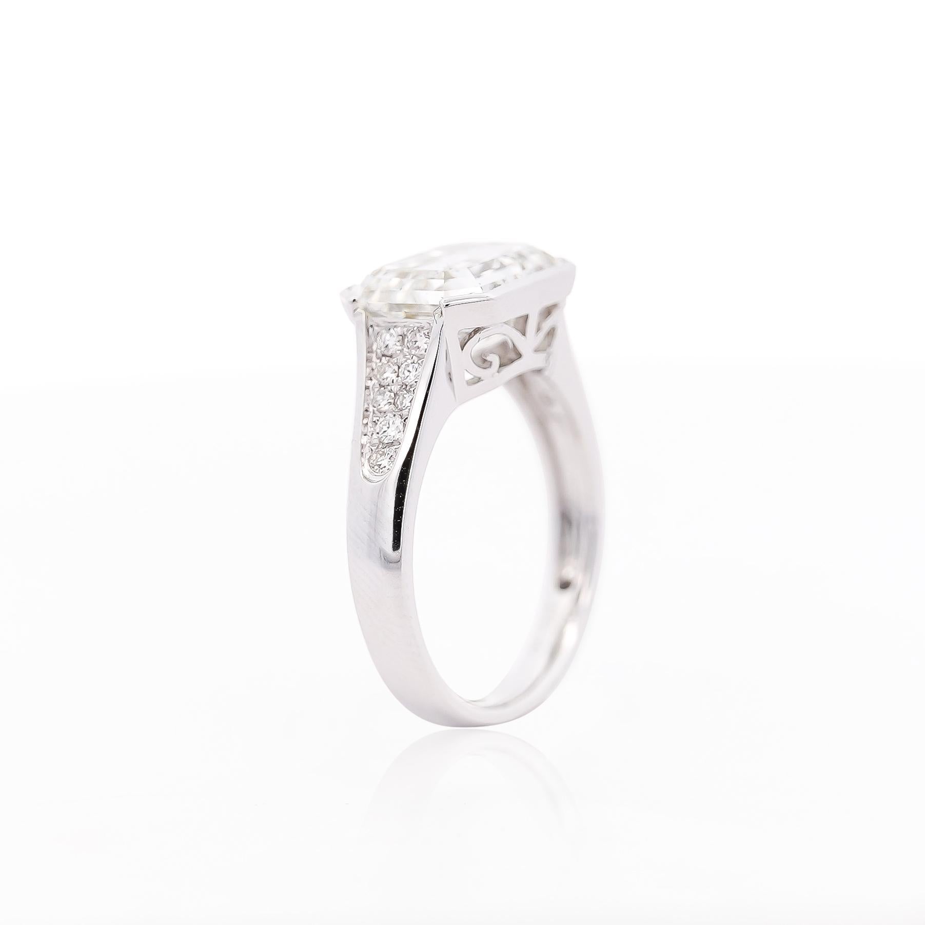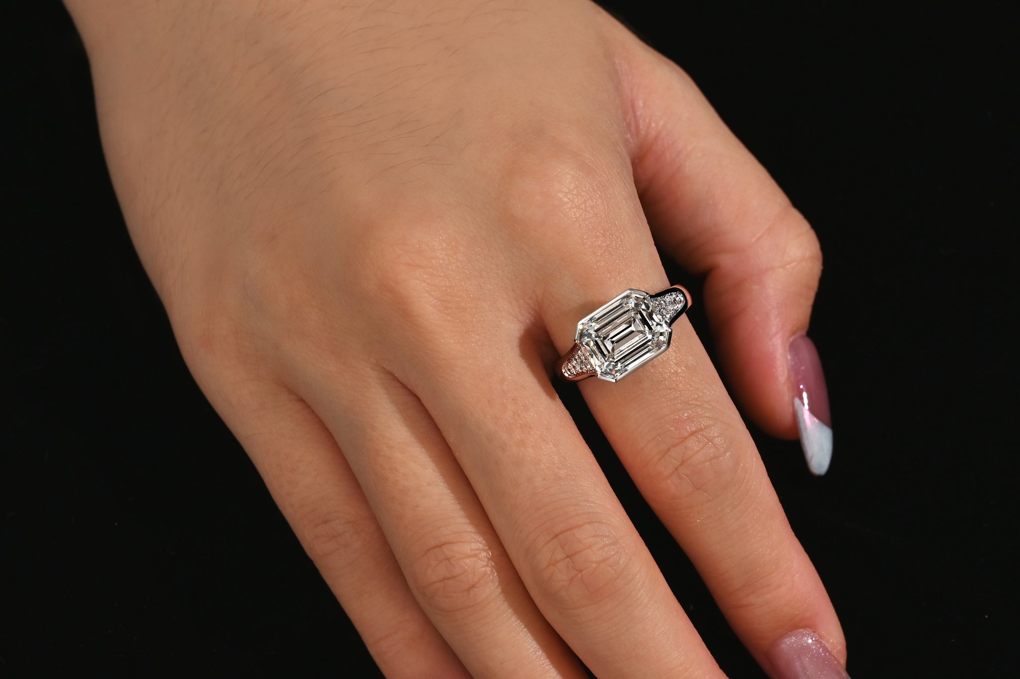 The east west half bezel setting showcases the emerald cut diamond's clean lines while providing secure protection for the stone's corners. Tapered white gold band features triangular sections with pave set diamonds that enhance the ring's brilliance. The geometric bezel design complements the emerald cut's Art Deco aesthetic while maintaining contemporary elegance.