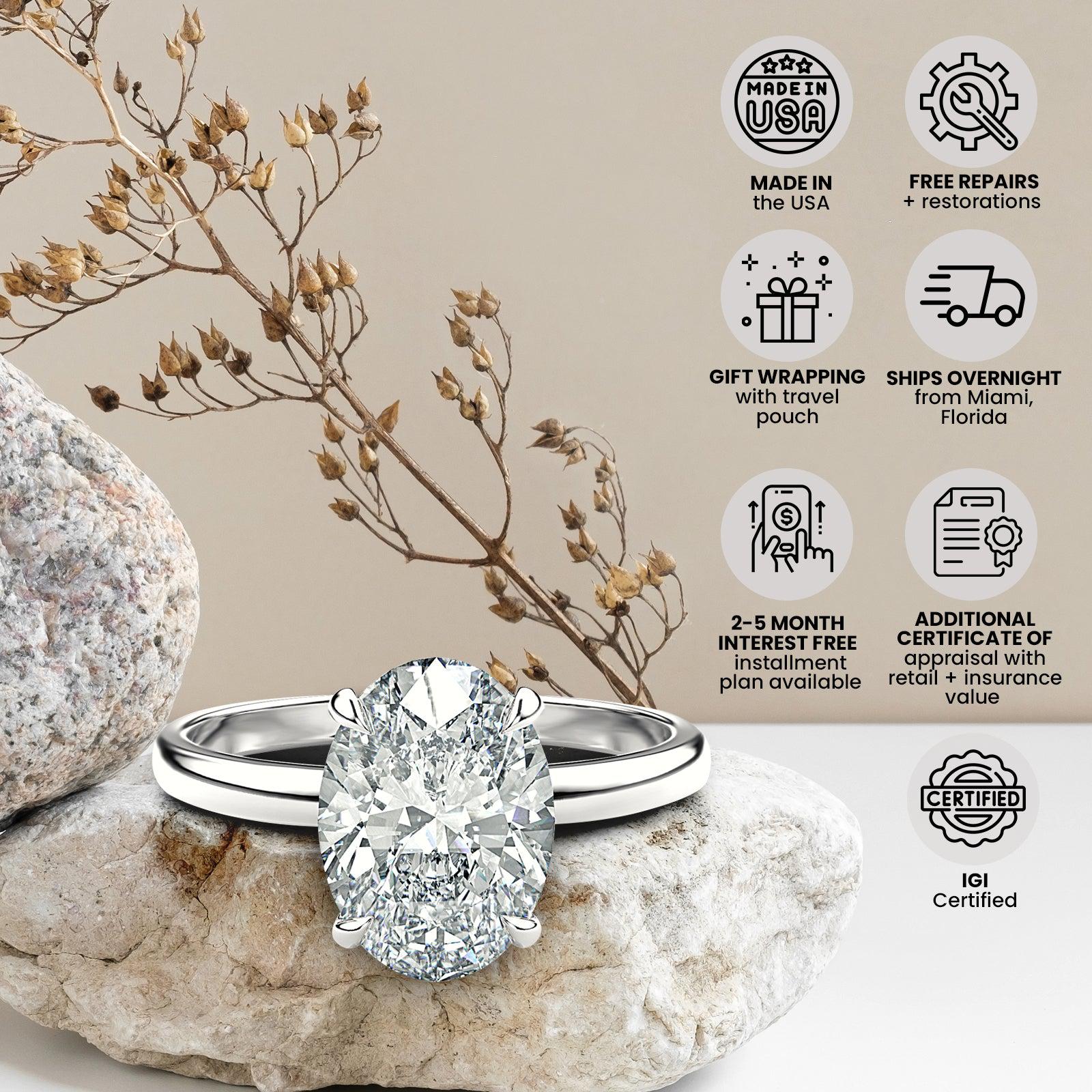 4.05-carat cushion cut Lab-grown diamond solitaire engagement ring in 14k solid white gold. 4.05 carat, cushion cut, F color, VS1 clarity. A symmetrically spread stone with the ideal cut ratio. Not too long and not too wide.