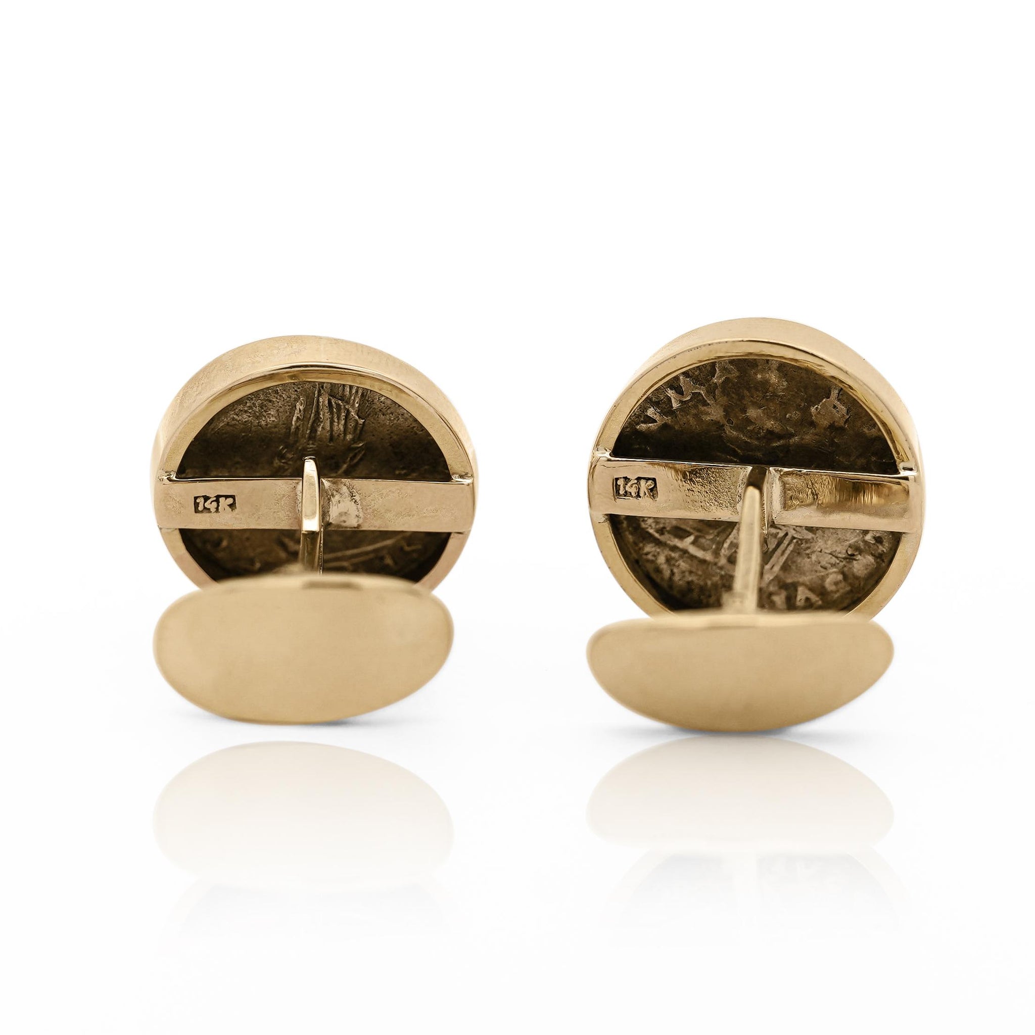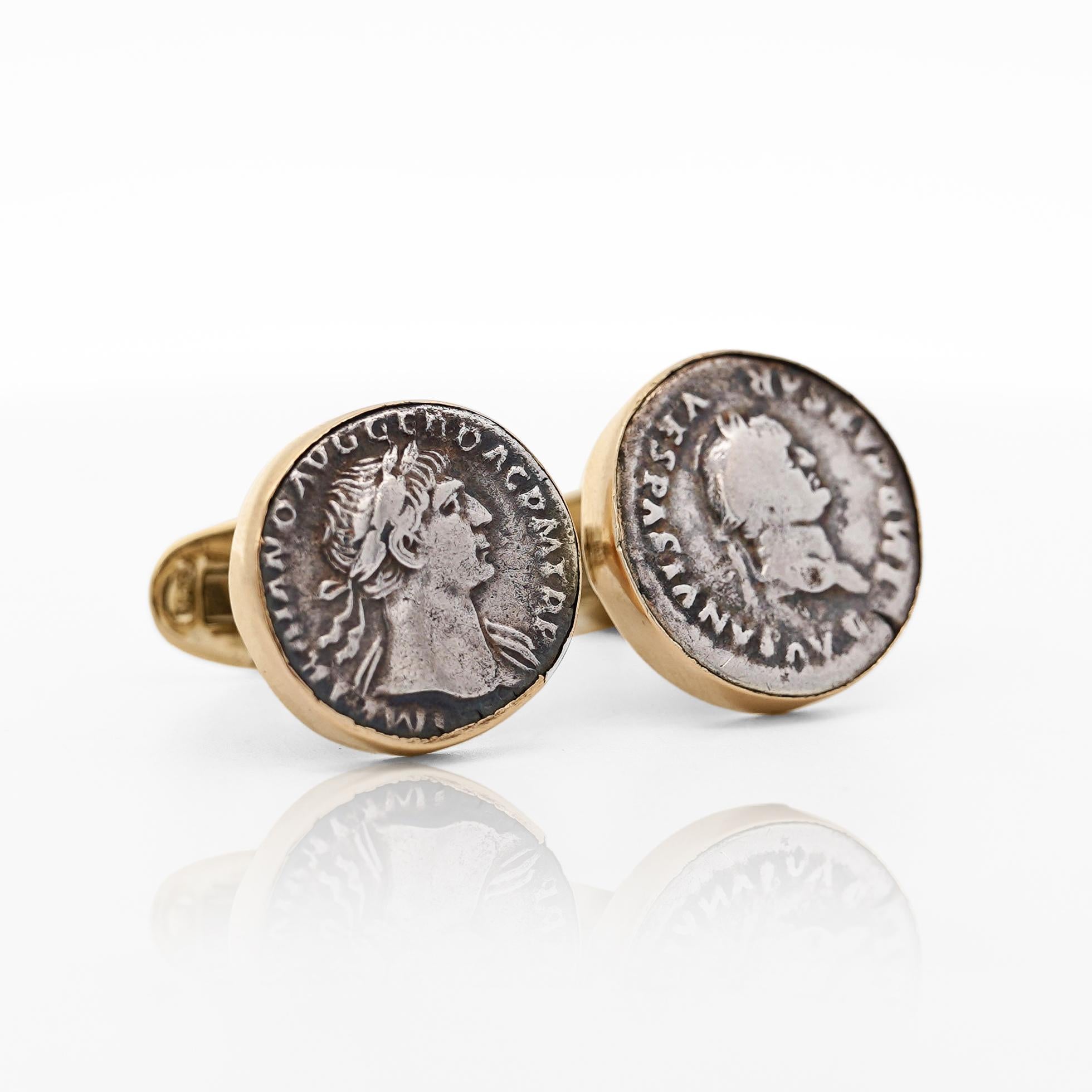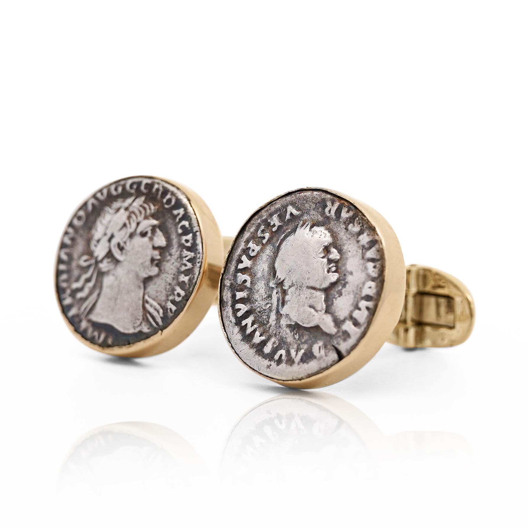 The Roman coins were used not only as currency but also as propaganda tools. They featured the likeness of emperors and other notable figures, cementing their legacy in the minds of the people. These cufflinks offer a stylish and meaningful way to carry a piece of history, beautifully crafted in solid 14K yellow gold. Perfect for those who value both artistry and history.