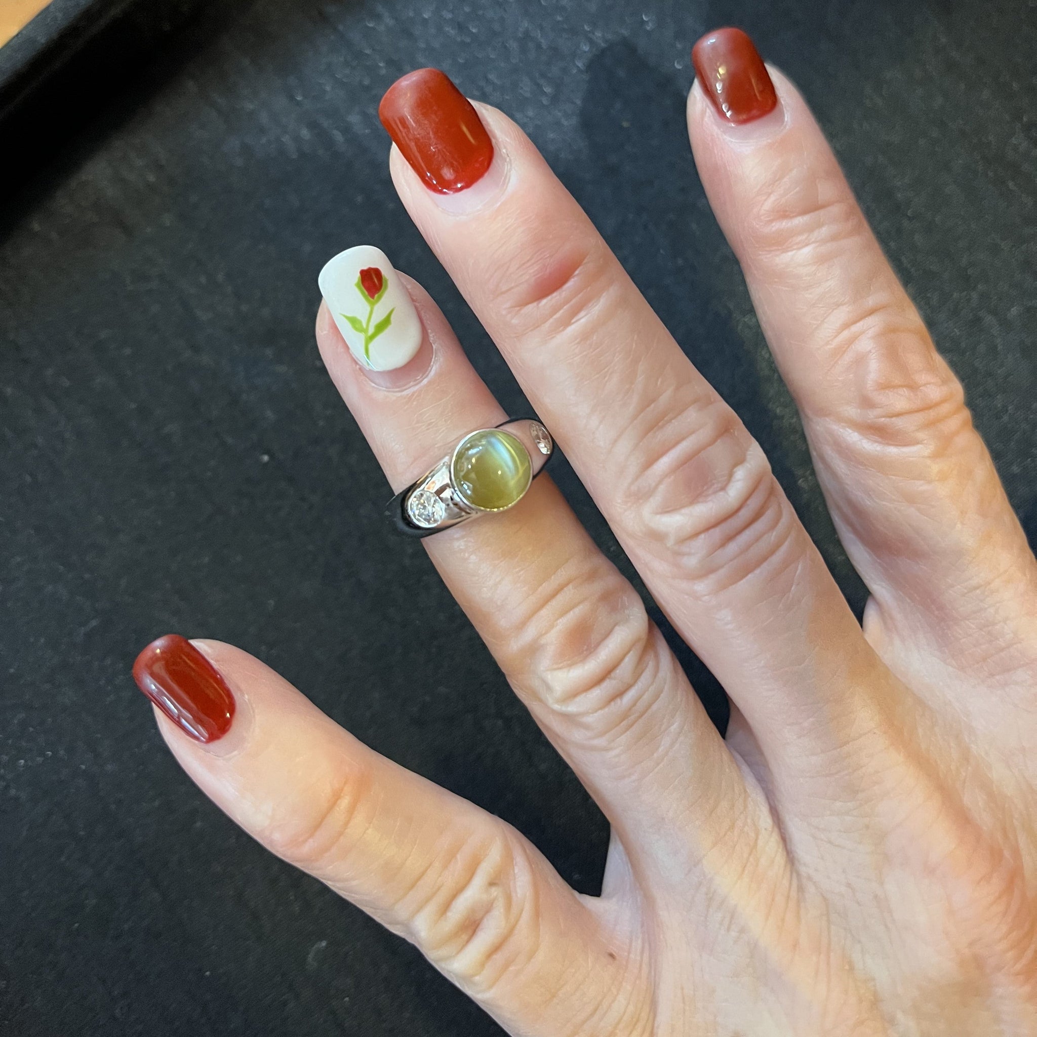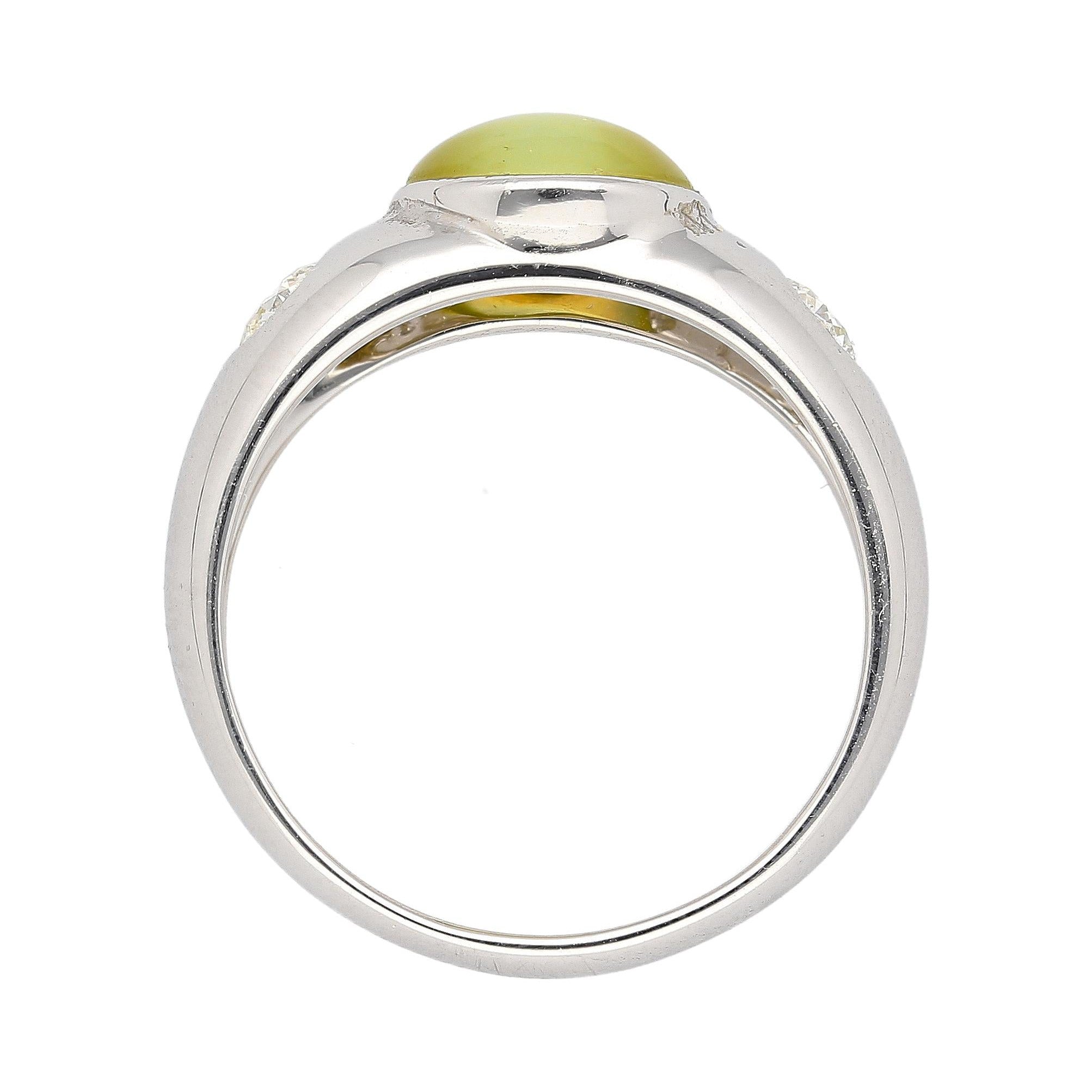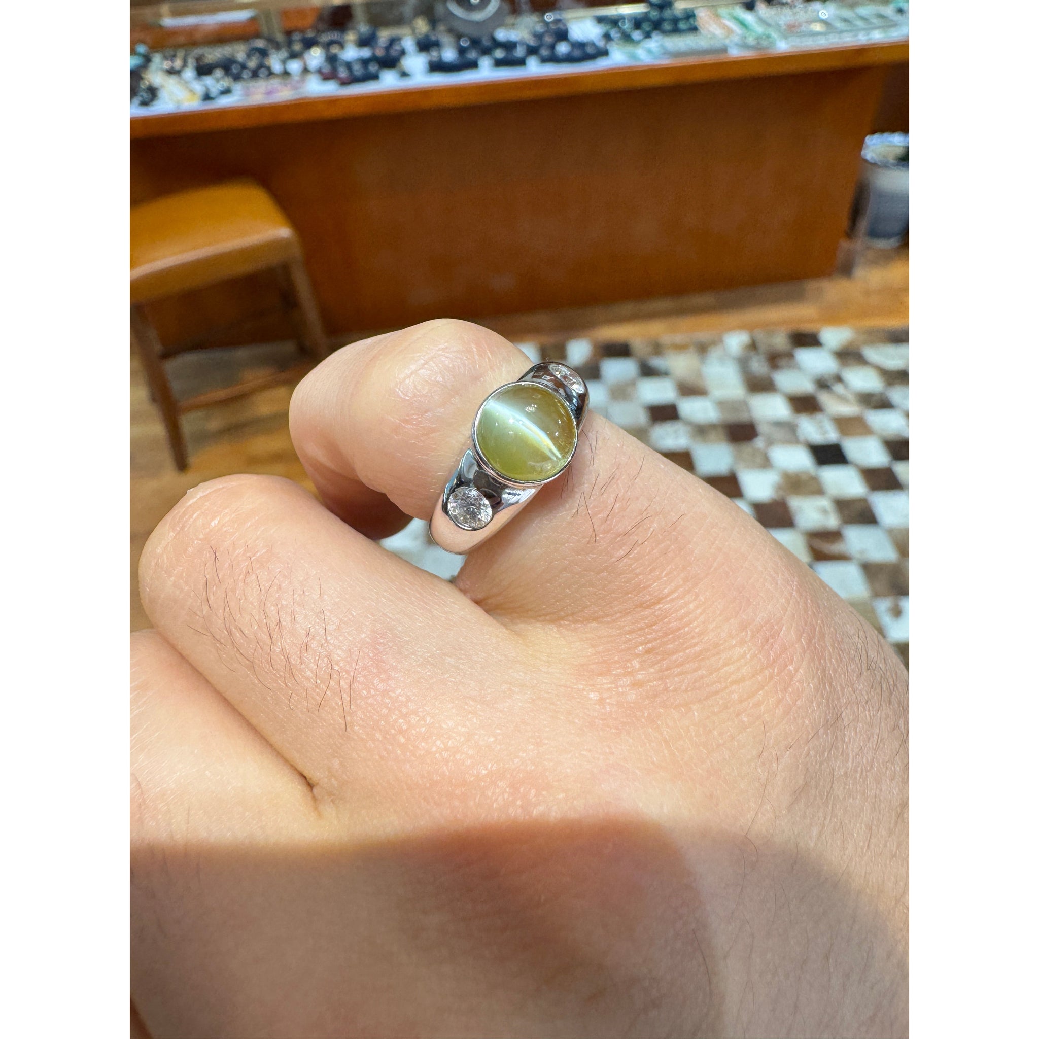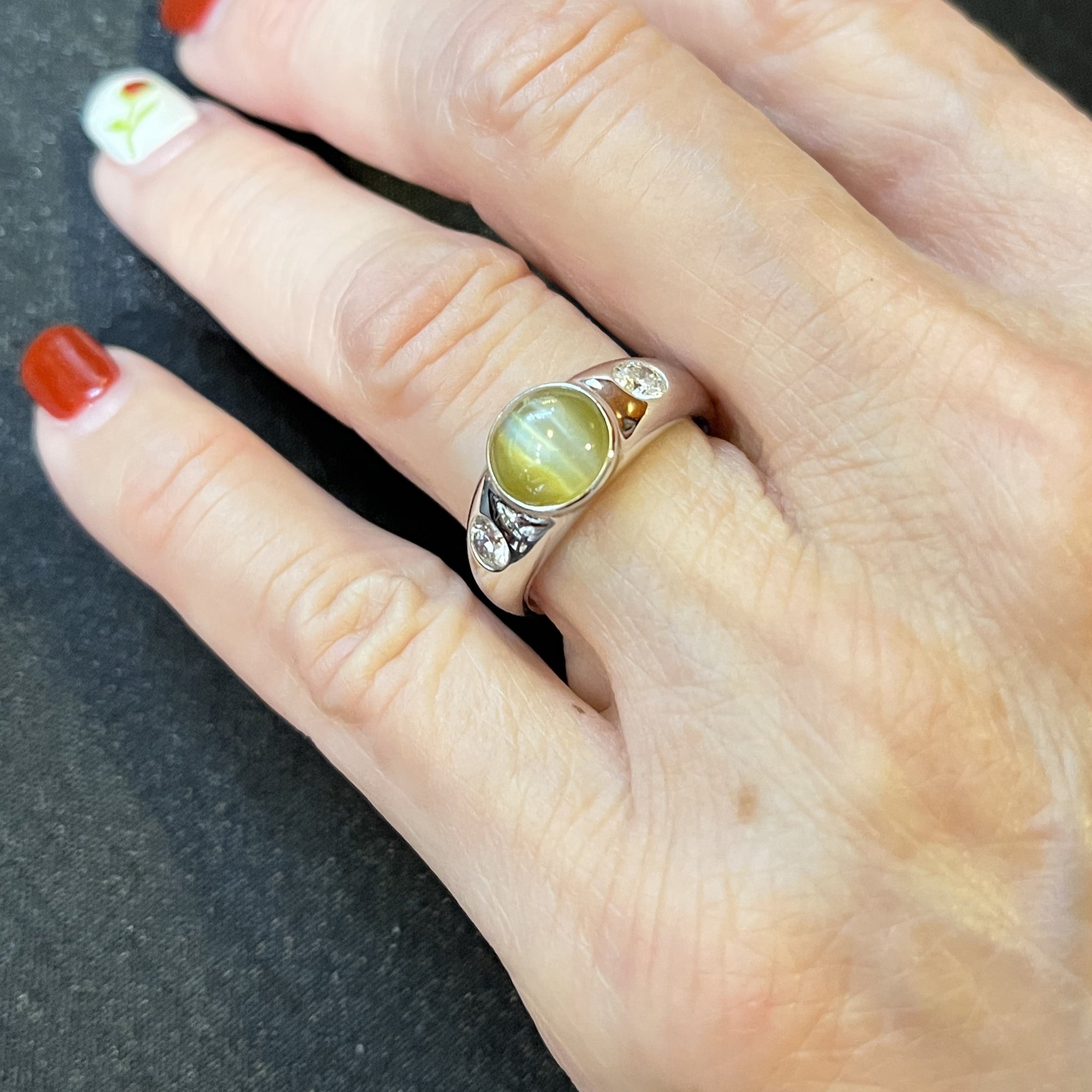 Bezel Set Chrysoberyl Cat's Eye and Diamond Three Stone Ring in 18K White Gold