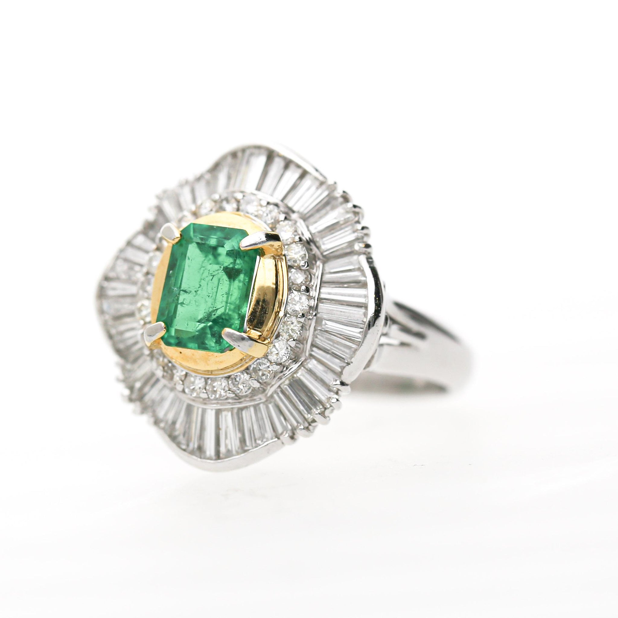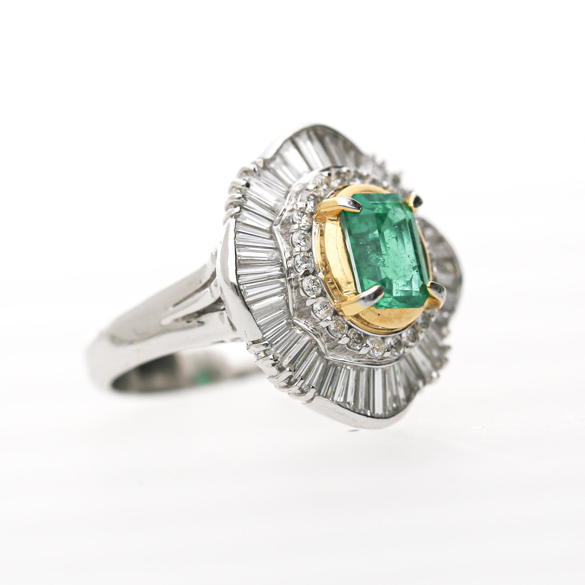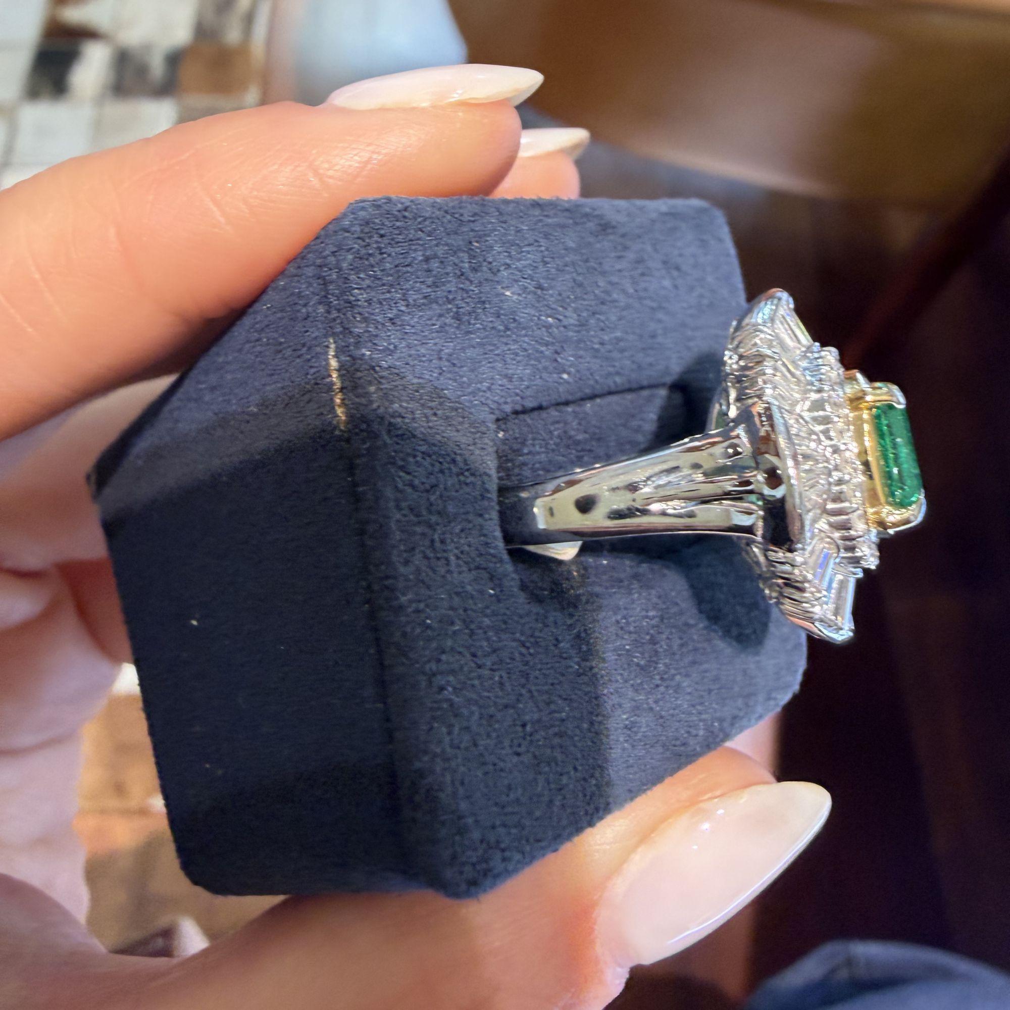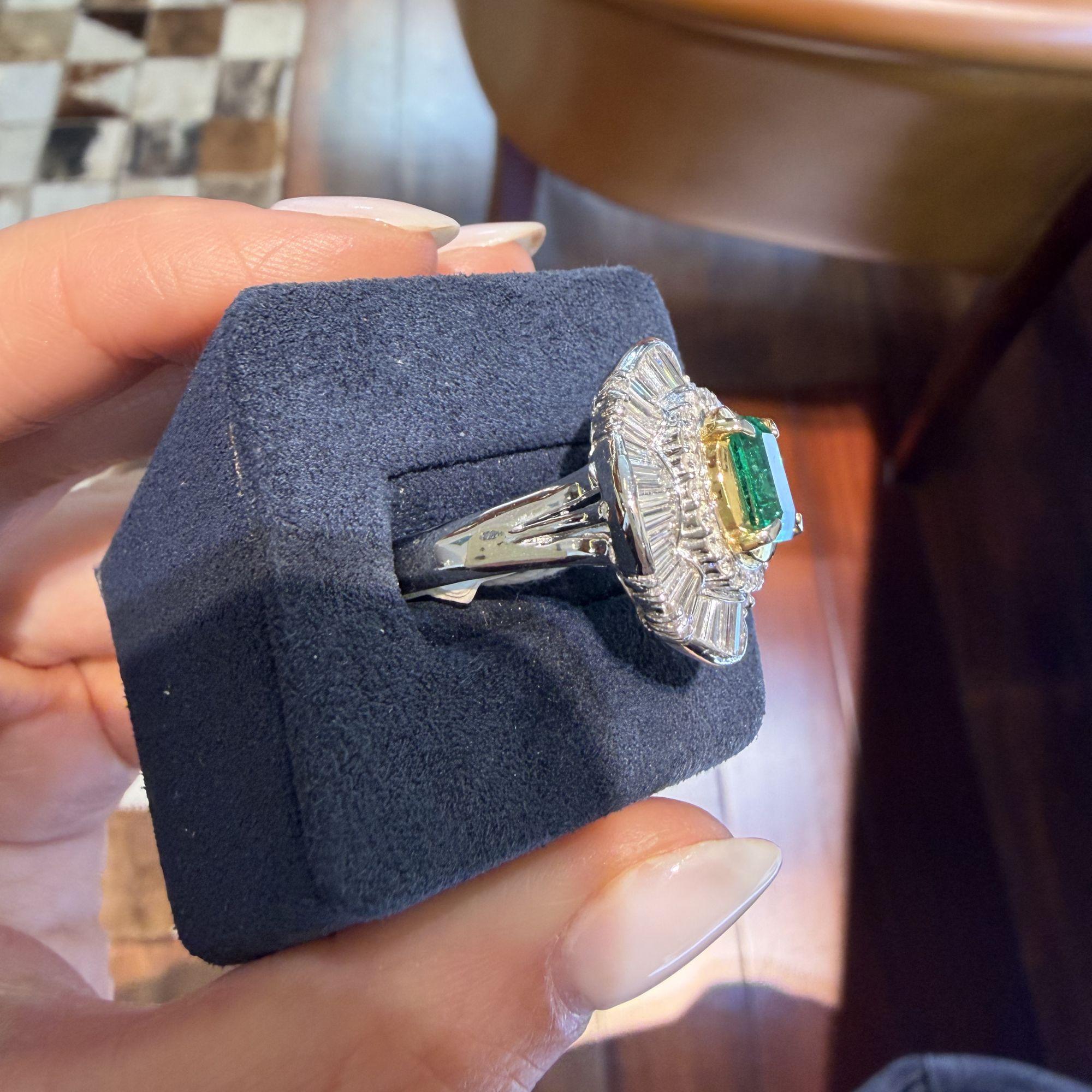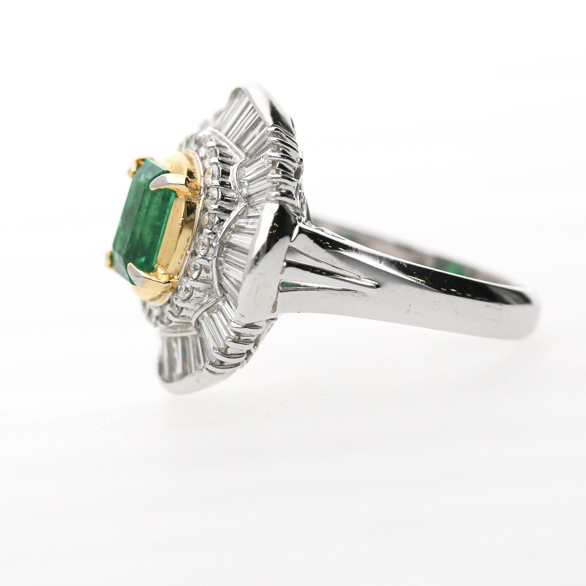 GIA-certified 1.38 carat emerald cut Colombian emerald and 1.63 carat total diamond platinum 900 ballerina halo cocktail ring, set in a yellow gold prong basket surrounded by a round brilliant diamond inner halo and a dramatic radiating baguette diamond outer ballerina halo with hand-crafted filigree scrollwork gallery.