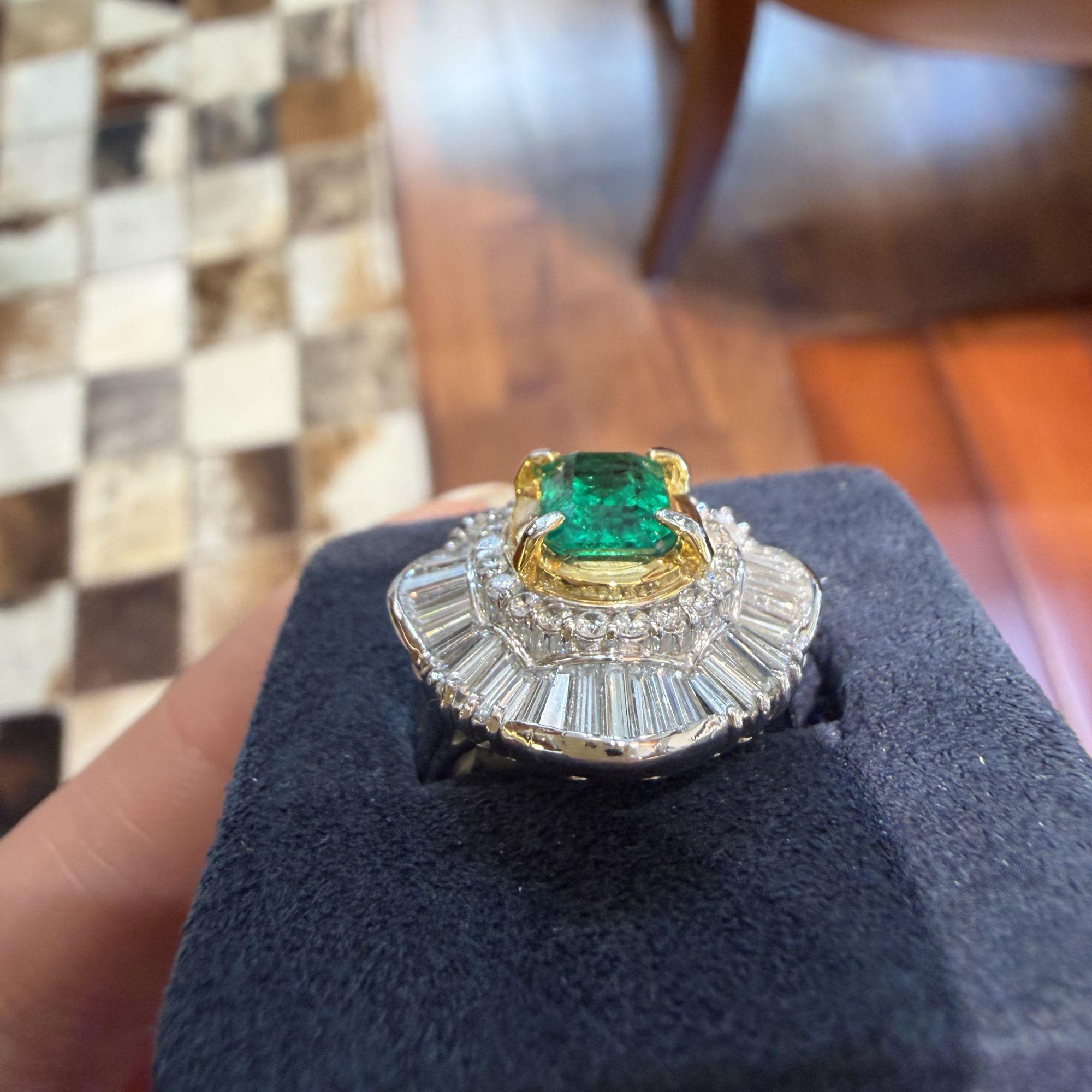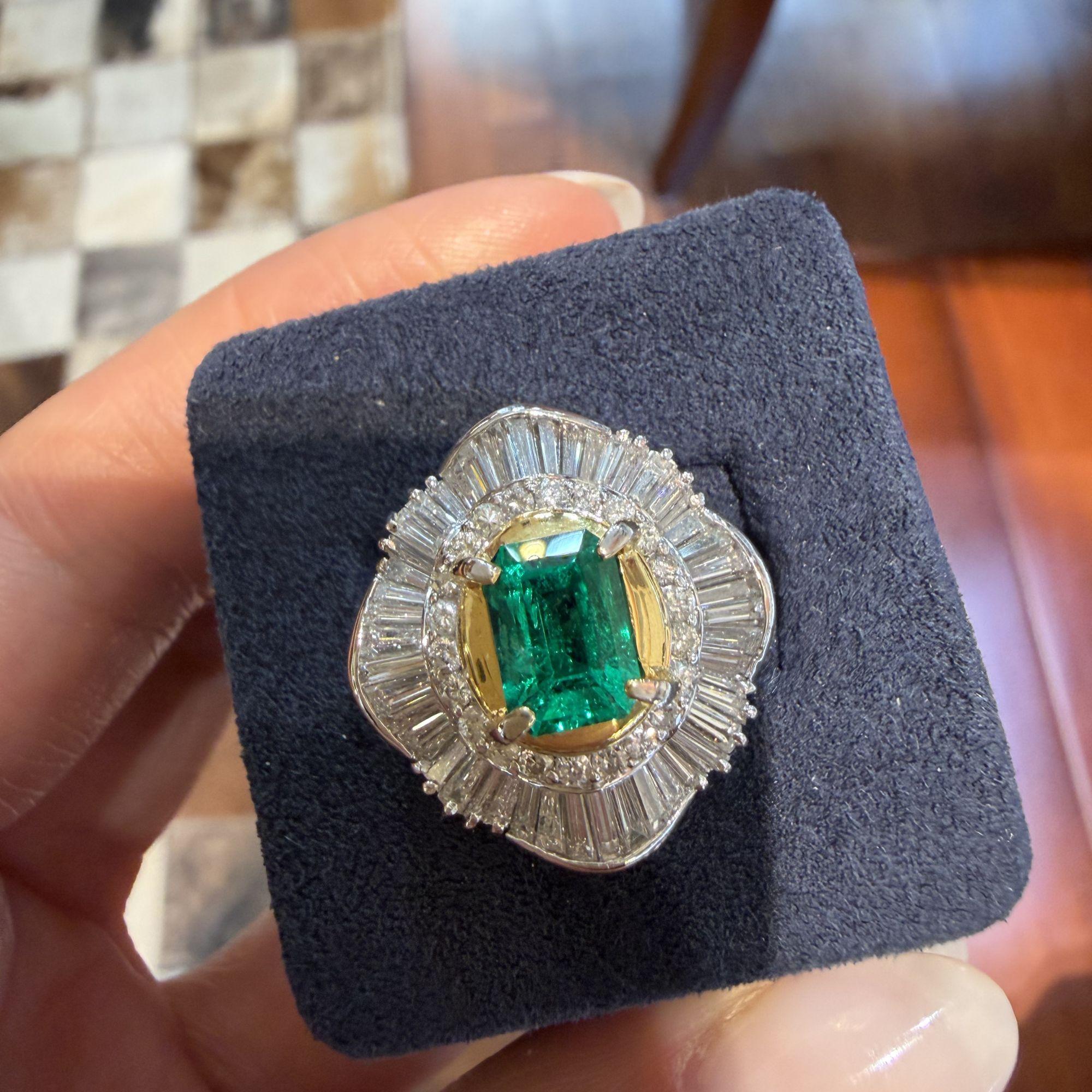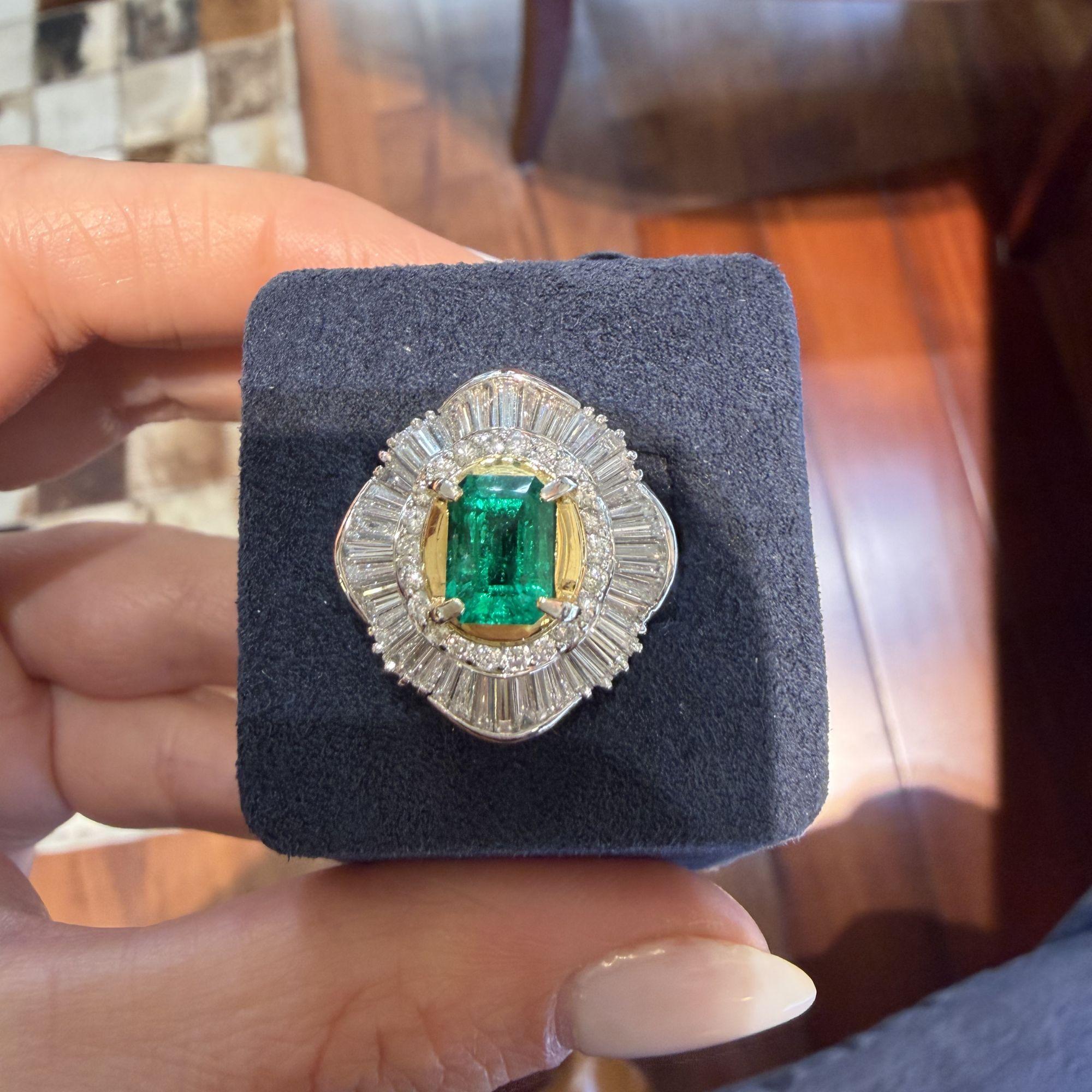 The 1.38 carat GIA-certified Colombian emerald is the undisputed focal point of this ring, displaying the highly coveted vivid green color that Colombian origin is world-famous for — a color distinct from emeralds of other origins and considered the finest in the gem world. The emerald cut showcases the gem's clarity and depth through its broad, open table facets, allowing full appreciation of its color saturation and transparency. The 1.63 carats of surrounding diamonds — 22 round brilliants in the inner halo and 48 baguettes in the outer ballerina frame — provide an icy, brilliant contrast that amplifies the emerald's color and gives the ring its grand, architectural scale. This combination of Colombian emerald with a ballerina diamond surround is a timeless pairing that has defined fine jewelry for decades.