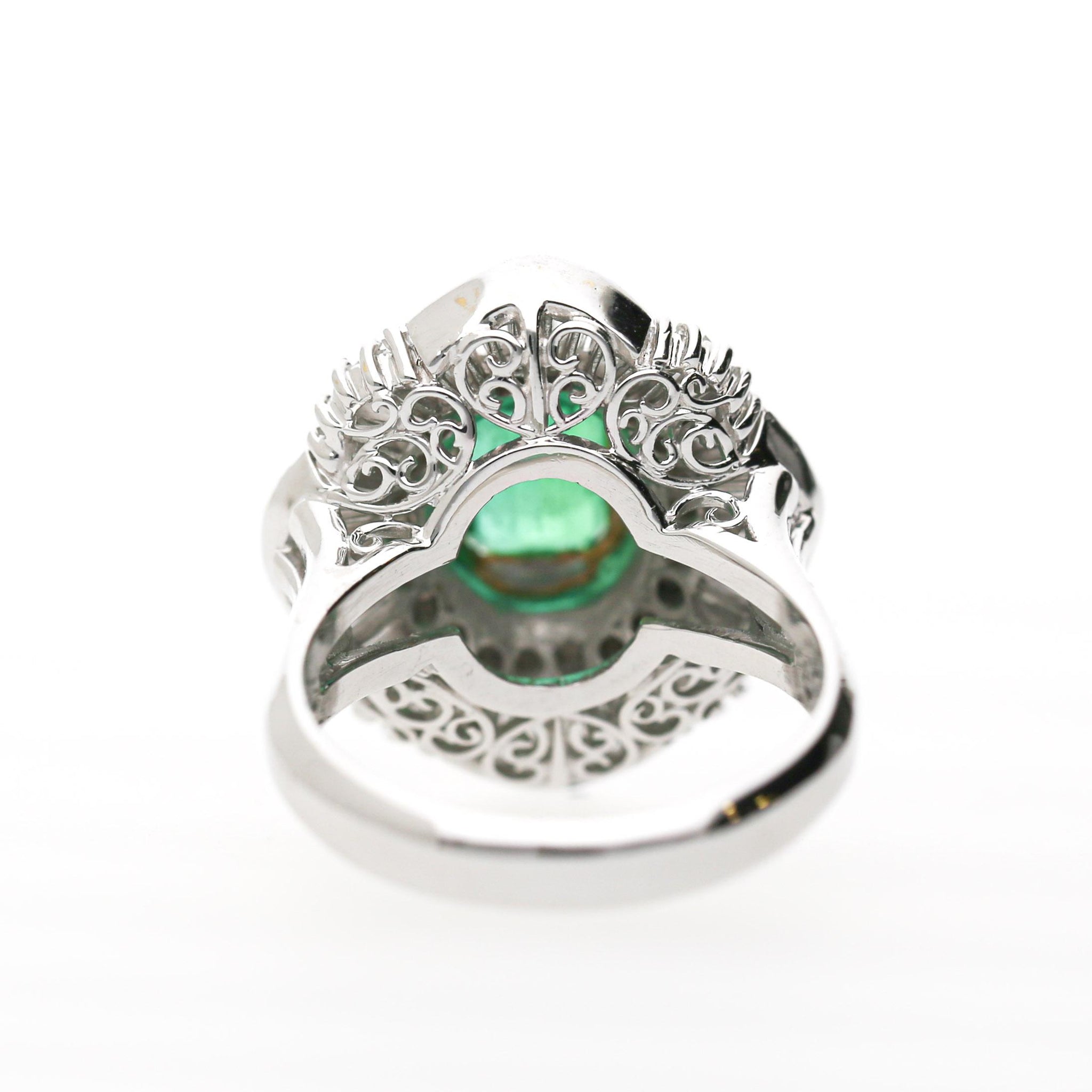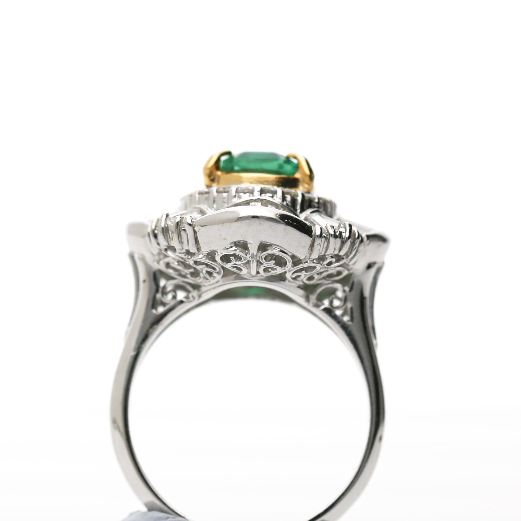 The setting is a masterpiece of platinum craftsmanship, combining a warm yellow gold prong basket that cradles and intensifies the Colombian emerald's vivid green color, with a surrounding white platinum double halo — first a ring of 22 round brilliant diamonds, then a sweeping outer ballerina layer of 48 channel-set baguette diamonds radiating outward in a fan formation. The underside gallery of the ring features hand-worked filigree scrollwork in platinum, a detail that speaks to the artisanal quality and fine jewelry tradition behind this piece. At over 14 grams of platinum, the ring has a substantial, heirloom-quality presence on the finger without sacrificing elegance.