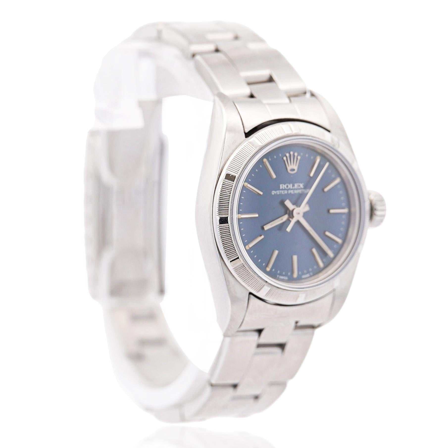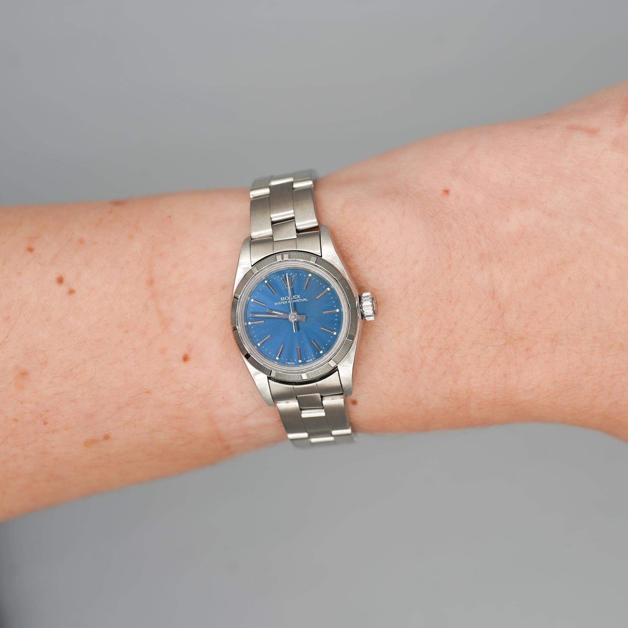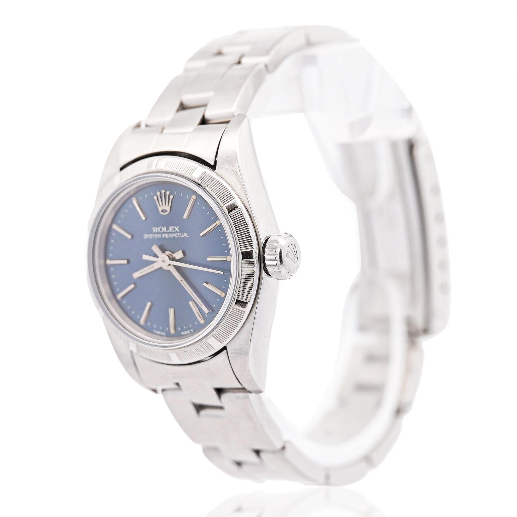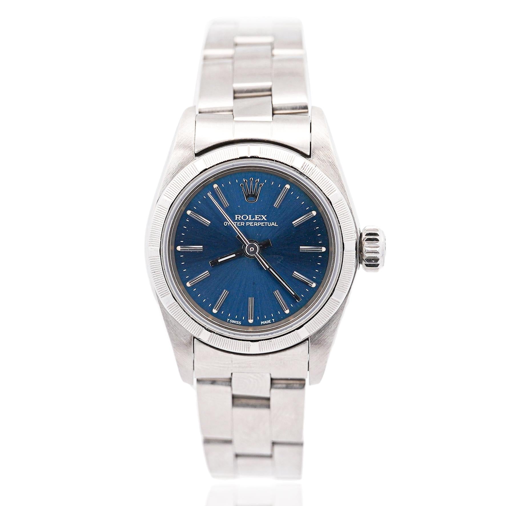 This Rolex Oyster Perpetual is a symbol of timeless style and precision. Featuring a classic blue dial, the watch radiates sophistication, paired with the iconic finely engine-turned bezel  bezel that Rolex is known for. The 26mm size is ideal for women who prefer a more delicate yet strong presence on the wrist. The automatic movement ensures reliability and smooth operation, while the stainless-steel bracelet offers both comfort and durability. This piece is from 1999 and is a perfect choice for collectors or anyone looking to own a piece of Rolex's legacy. Its understated elegance makes it suitable for any occasion, whether formal or casual, and guarantees a lasting impression.