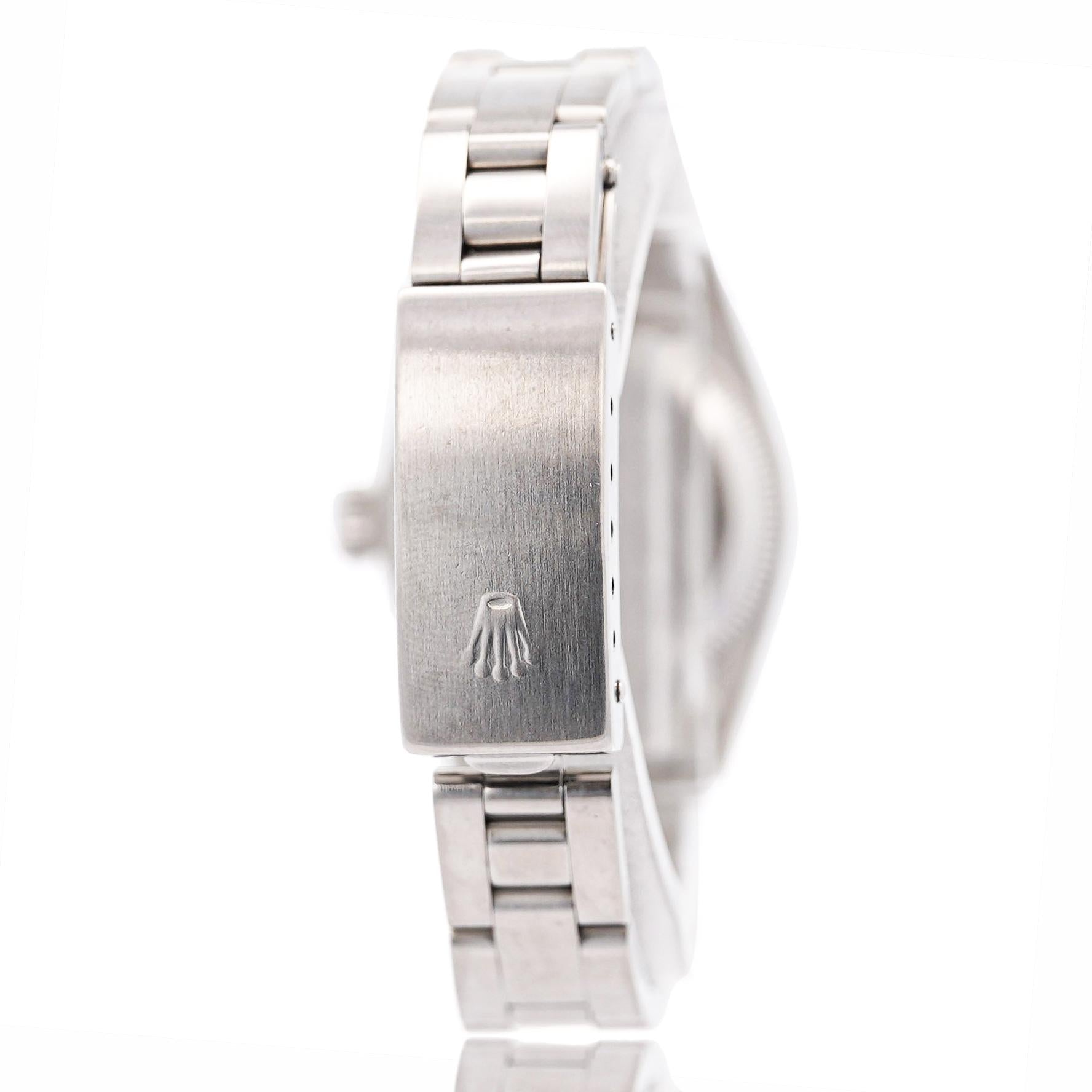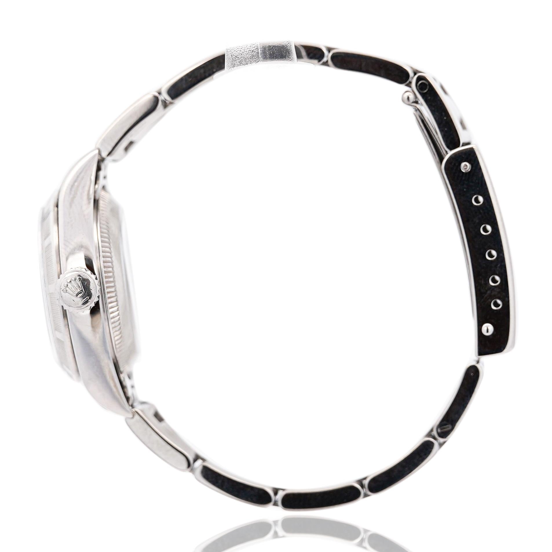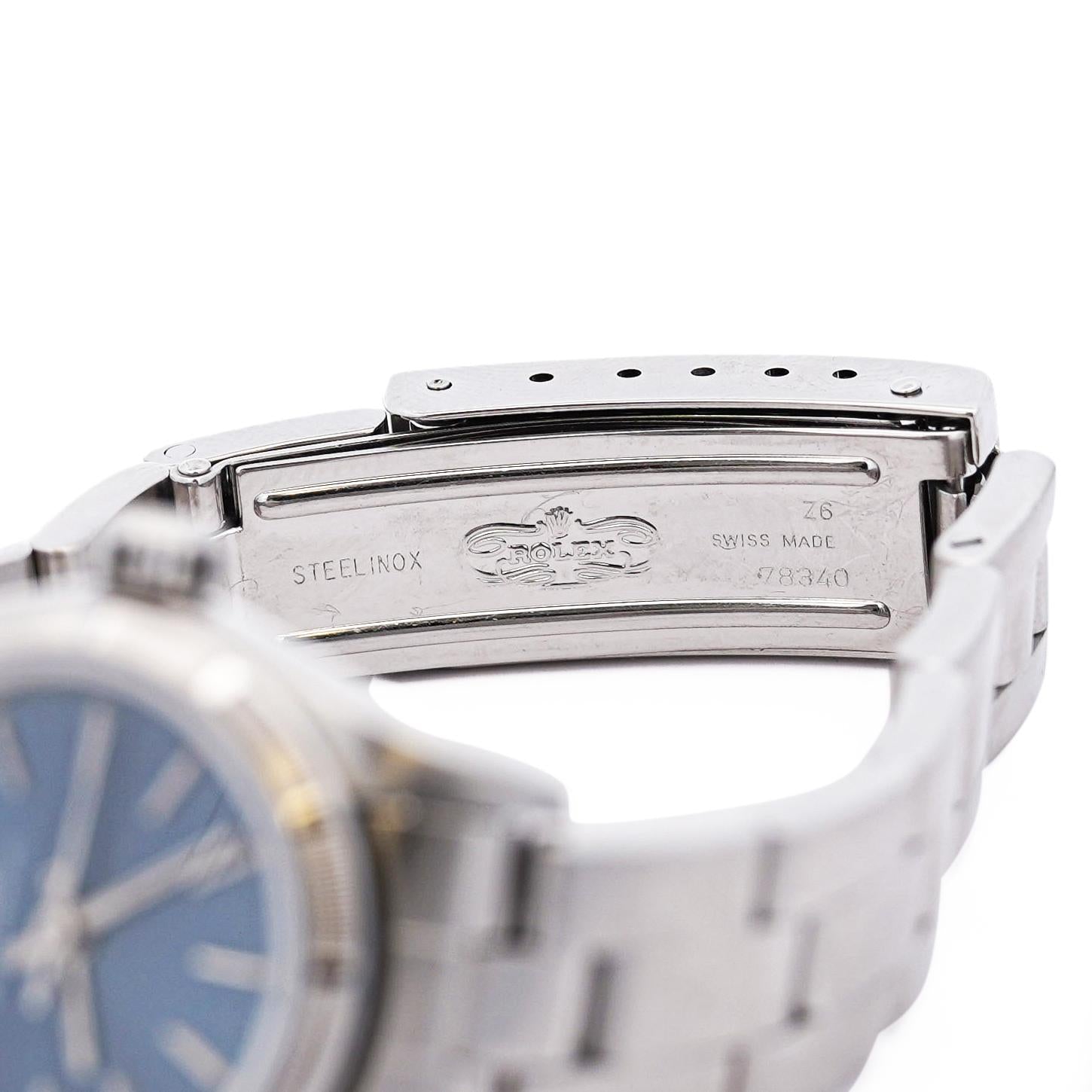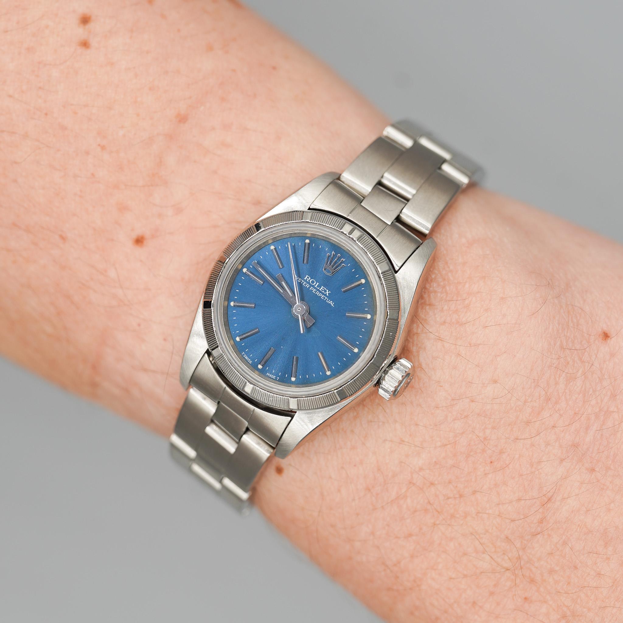 This Rolex Oyster Perpetual is a symbol of timeless style and precision. Featuring a classic blue dial, the watch radiates sophistication, paired with the iconic finely engine-turned bezel  bezel that Rolex is known for. The 26mm size is ideal for women who prefer a more delicate yet strong presence on the wrist. The automatic movement ensures reliability and smooth operation, while the stainless-steel bracelet offers both comfort and durability. This piece is from 1999 and is a perfect choice for collectors or anyone looking to own a piece of Rolex's legacy. Its understated elegance makes it suitable for any occasion, whether formal or casual, and guarantees a lasting impression.