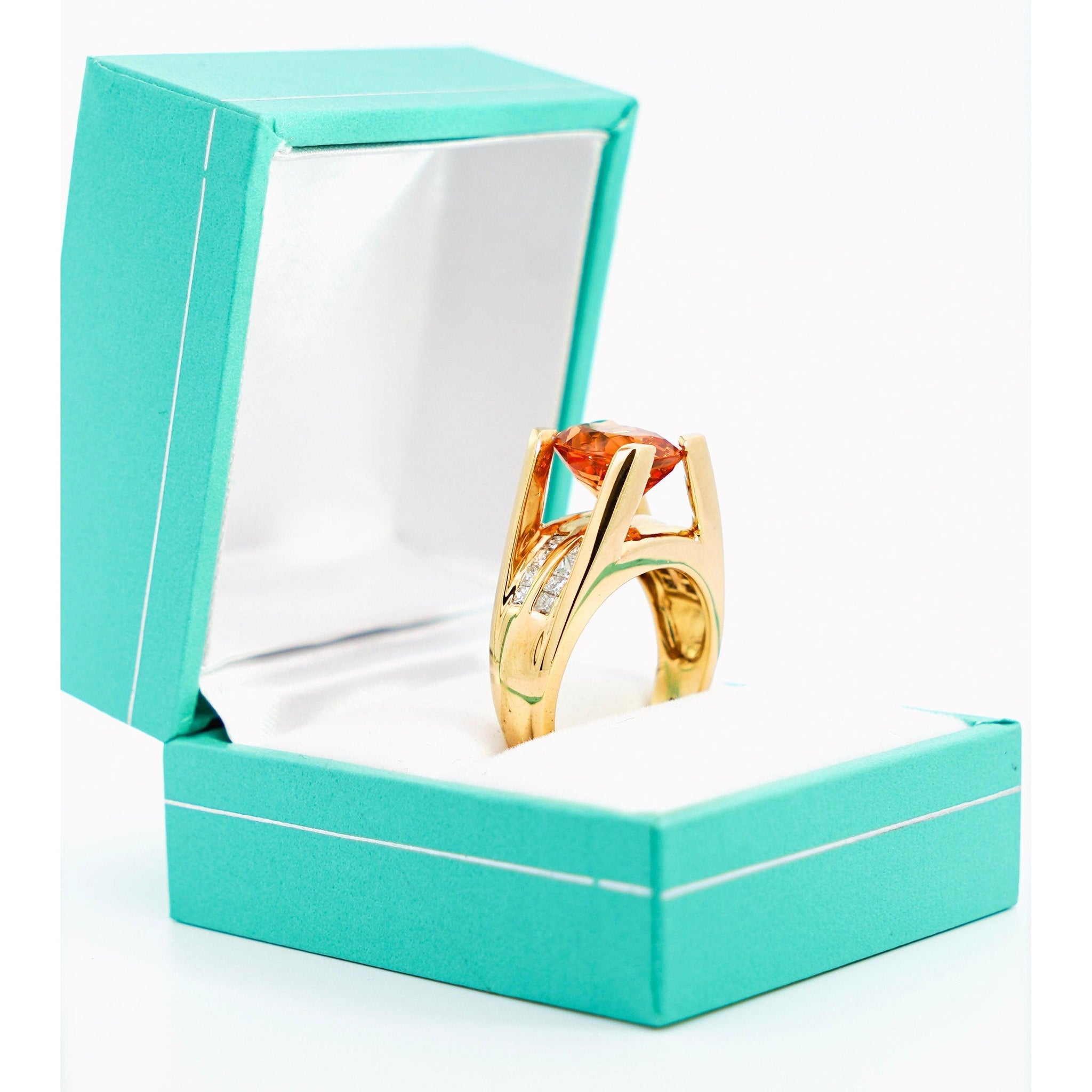 18K yellow gold oval cut Orange Spessartine Garnet and princess cut diamond ring. The Spessartine Garnet is mounted in a sharp, 4-prong setting that levitates the gem above the setting. Otherwise known as a floated set, for its optics as a gemstone floating in mid-air. The diamonds are eye clean and channel-tension set. Extremely white, and cut to perfection. Offering excellent contrast to the rich orange of the garnet and the bright yellow 18k gold setting.